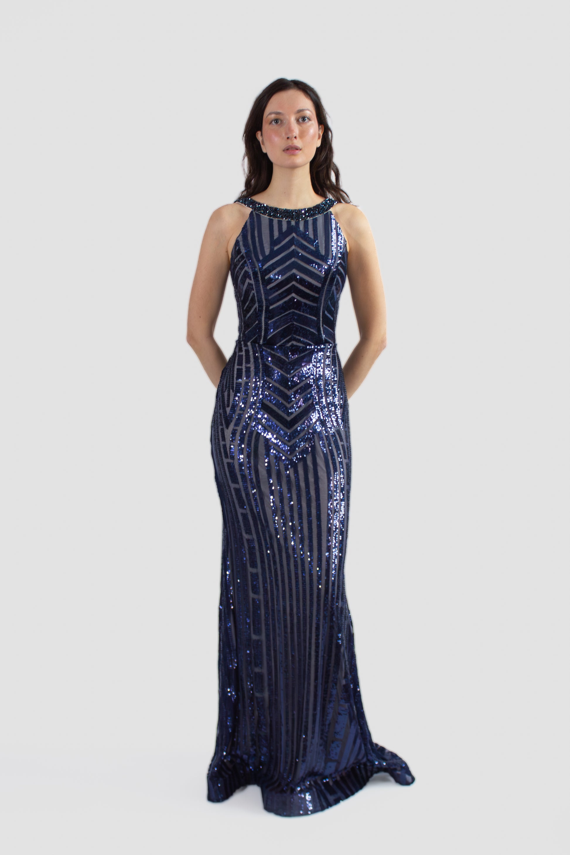 Entrez sous les projecteurs avec notre superbe robe élégante à paillettes bleu marine. Cette robe longue présente un design sans manches orné de paillettes complexes, ajoutant une touche de glamour à toute occasion. Le motif géométrique rehausse l’apparence générale, vous permettant de vous démarquer sans effort. Que vous assistiez à un gala, un mariage ou un événement spécial, cette robe vous assurera de briller toute la nuit.