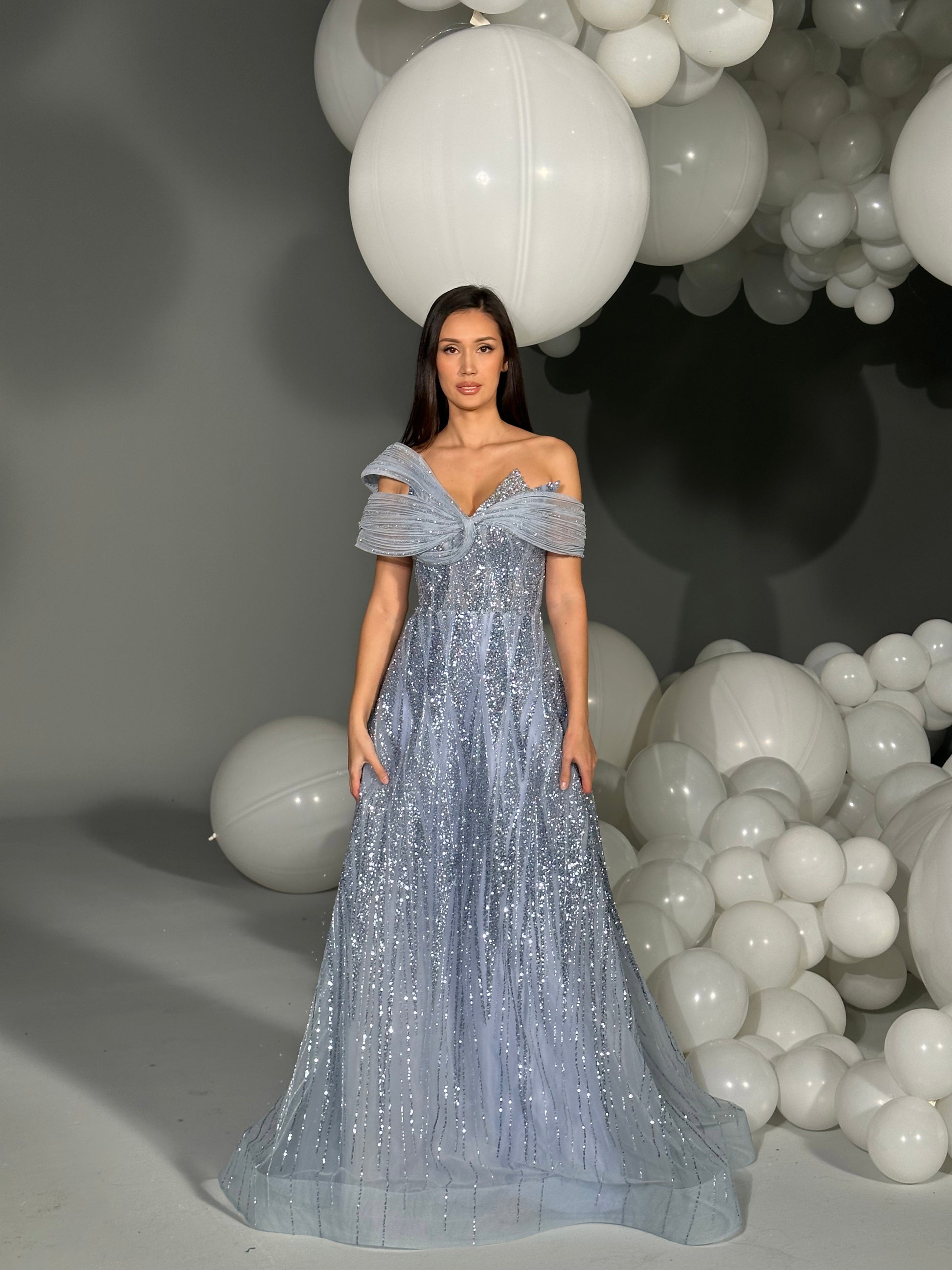 Confectionnée avec une attention aux détails, cette robe de soirée respire la sophistication et le glamour. Le subtil motif à paillettes de la variante dorée ajoute une touche de luxe, tandis que l'option bleue présente des embellissements scintillants pour un look enchanteur.