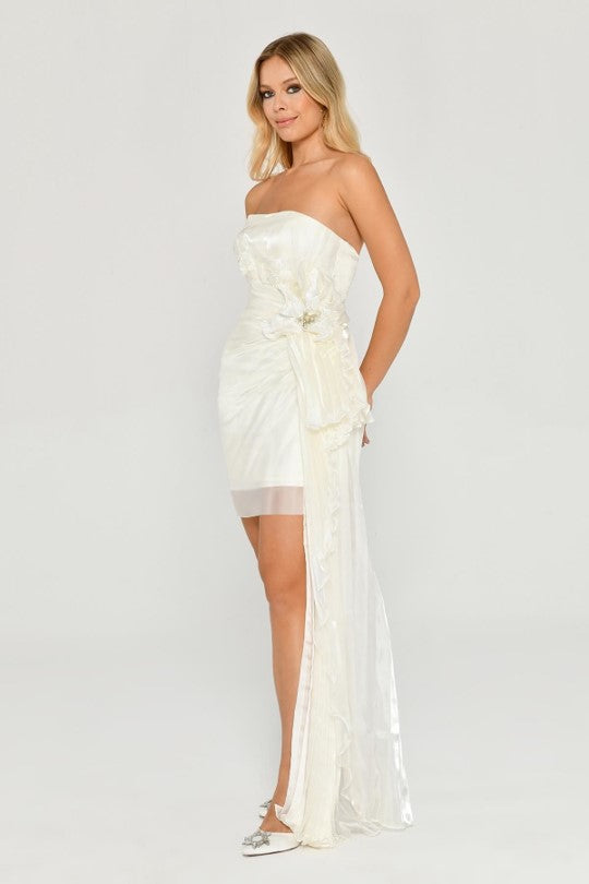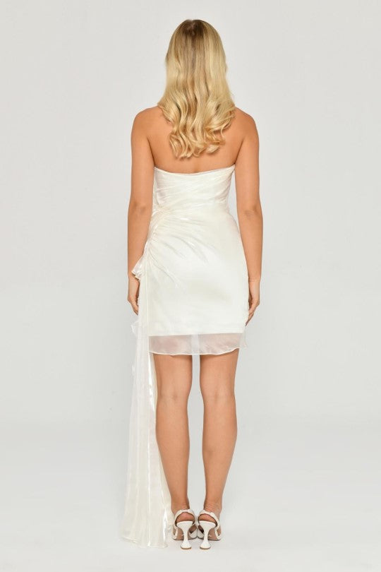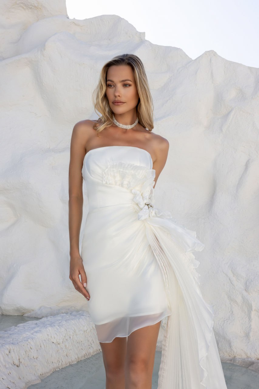 This stunning white strapless dress is the epitome of elegance and charm, crafted from luxurious satin that drapes beautifully against the skin. The design features a flattering gathered bodice that accentuates the waist, leading into a playful side draping that adds a touch of whimsy to your look. Perfect for special occasions like bachelorettes, this dress is complemented by delicate floral accessories that enhance its feminine appeal.