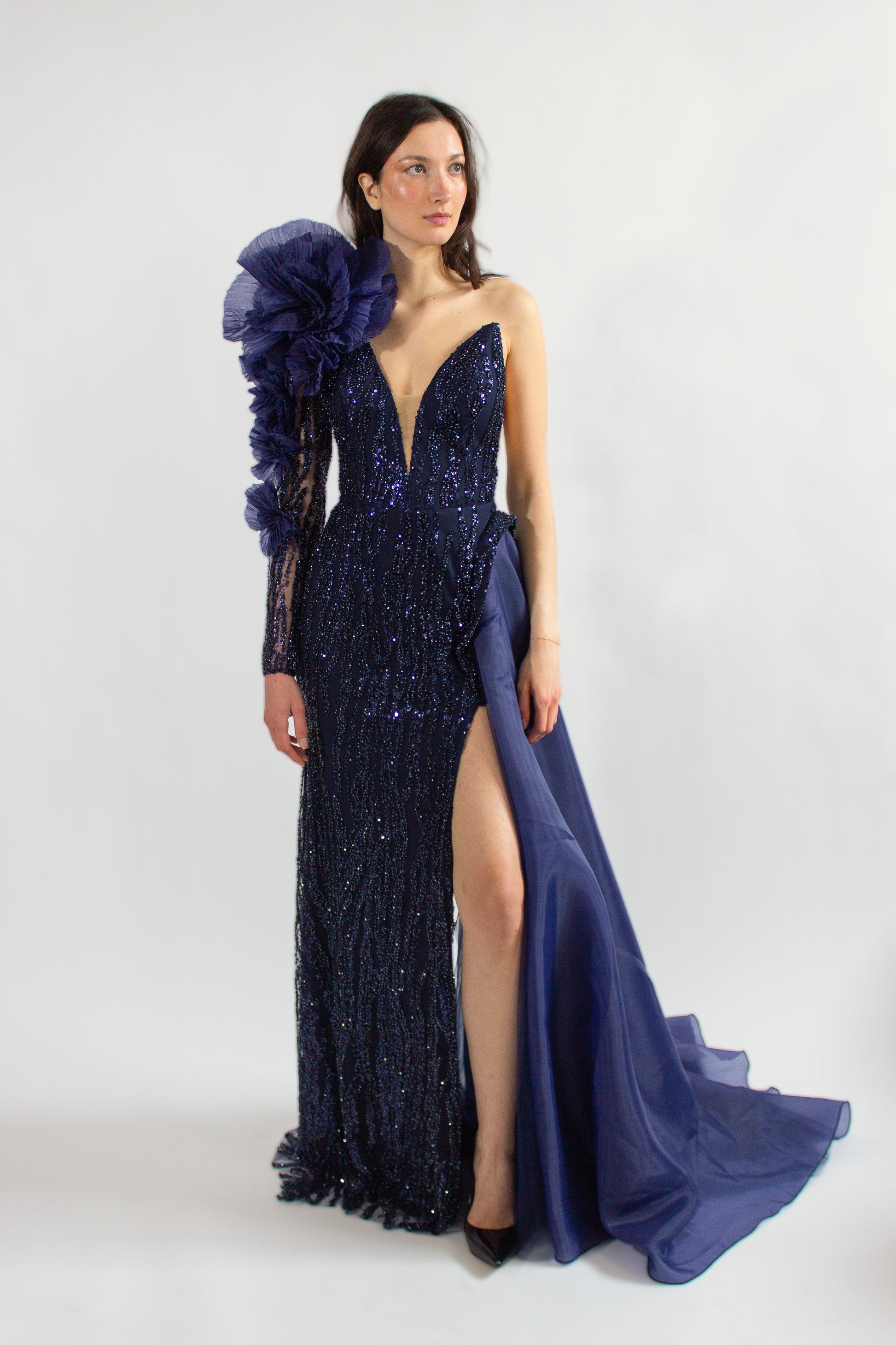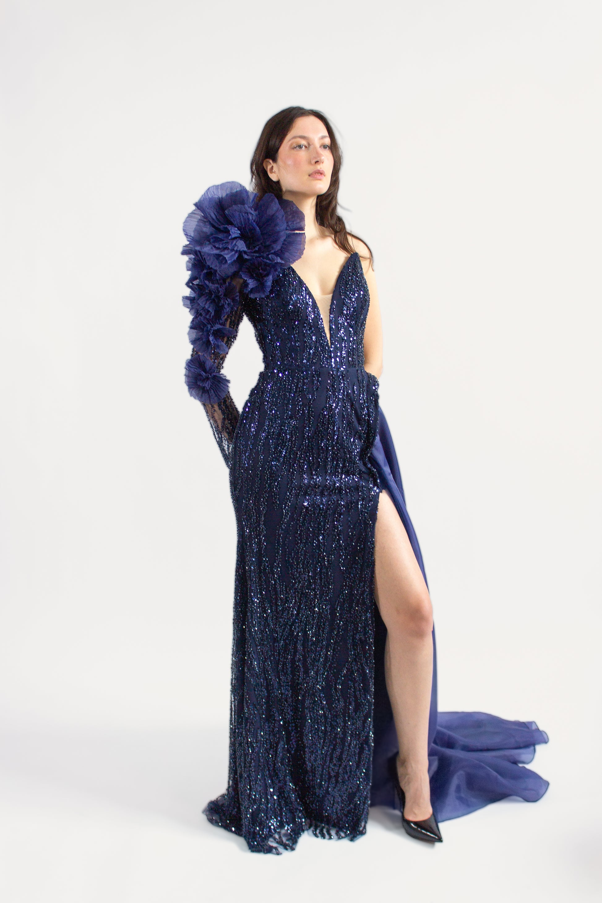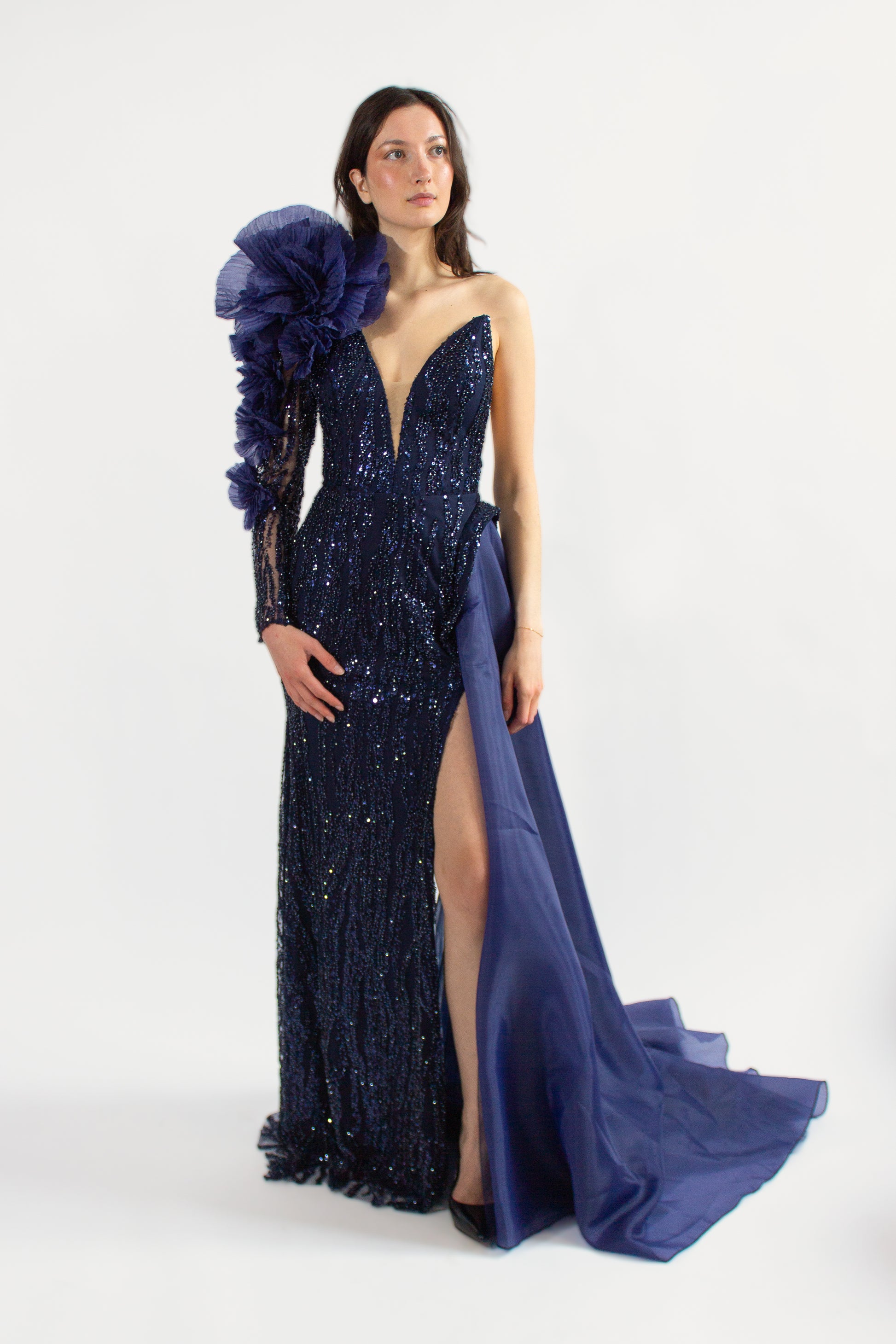 Conçue avec une silhouette sans manches et un décolleté plongeant audacieux, la DEANA GOWN respire la sophistication et le glamour. Son embellissement complexe de paillettes ajoute une touche d'éclat, tandis que le grand détail d'épaule en forme de fleur apporte une touche de charme fantaisiste. Pour compléter le look, cette robe comporte une traîne à couper le souffle avec un long tissu traînant dans le dos, assurant une entrée grandiose à tout événement.