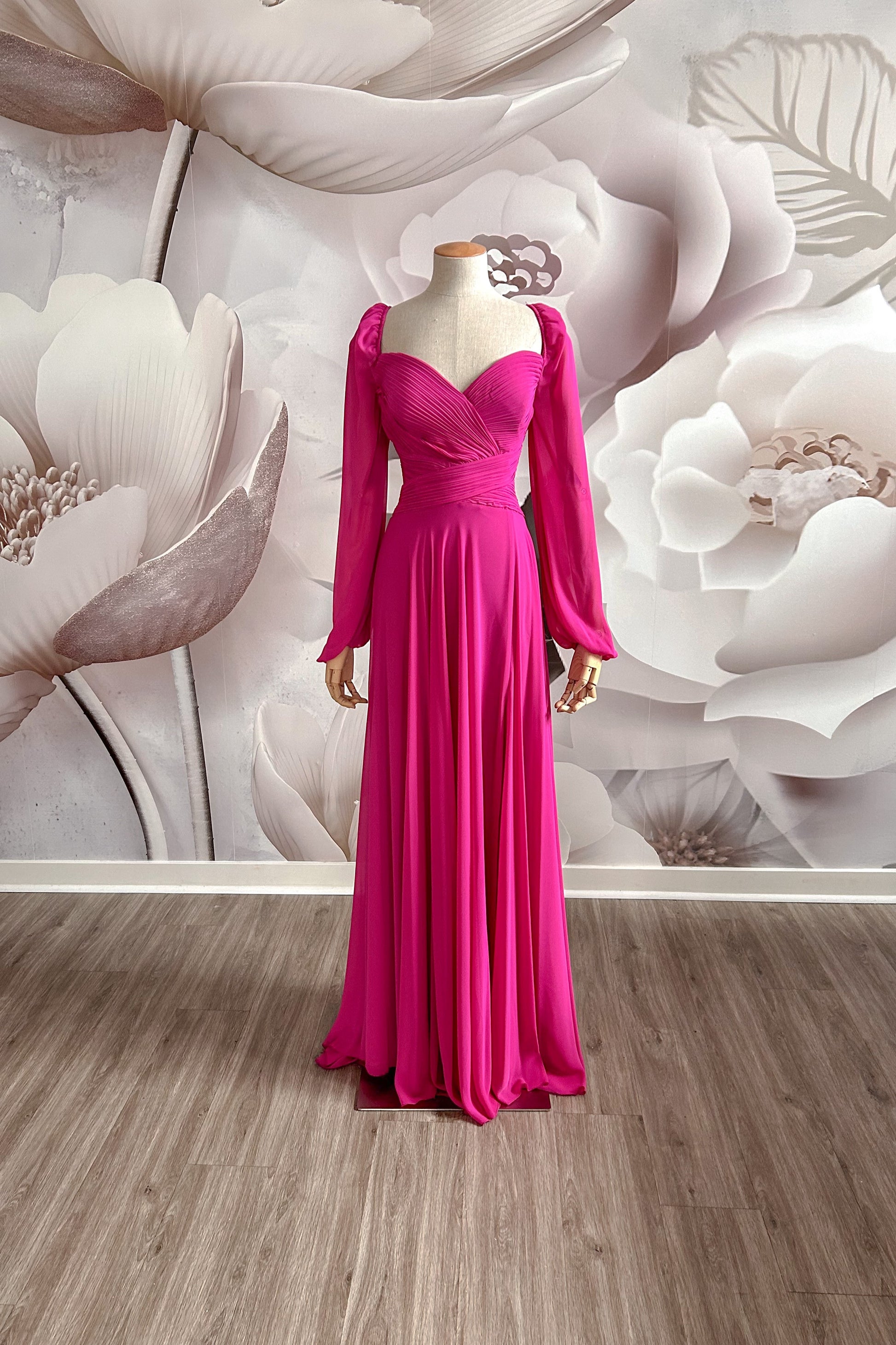 Entrez dans un monde enchanteur d'élégance et de charme avec notre gracieuse robe de soirée fluide ELEANOR. Cette pièce exquise présente un corsage plissé qui coule sans effort, un décolleté en cœur qui ajoute une touche de romantisme et des manches longues transparentes qui respirent la sophistication.