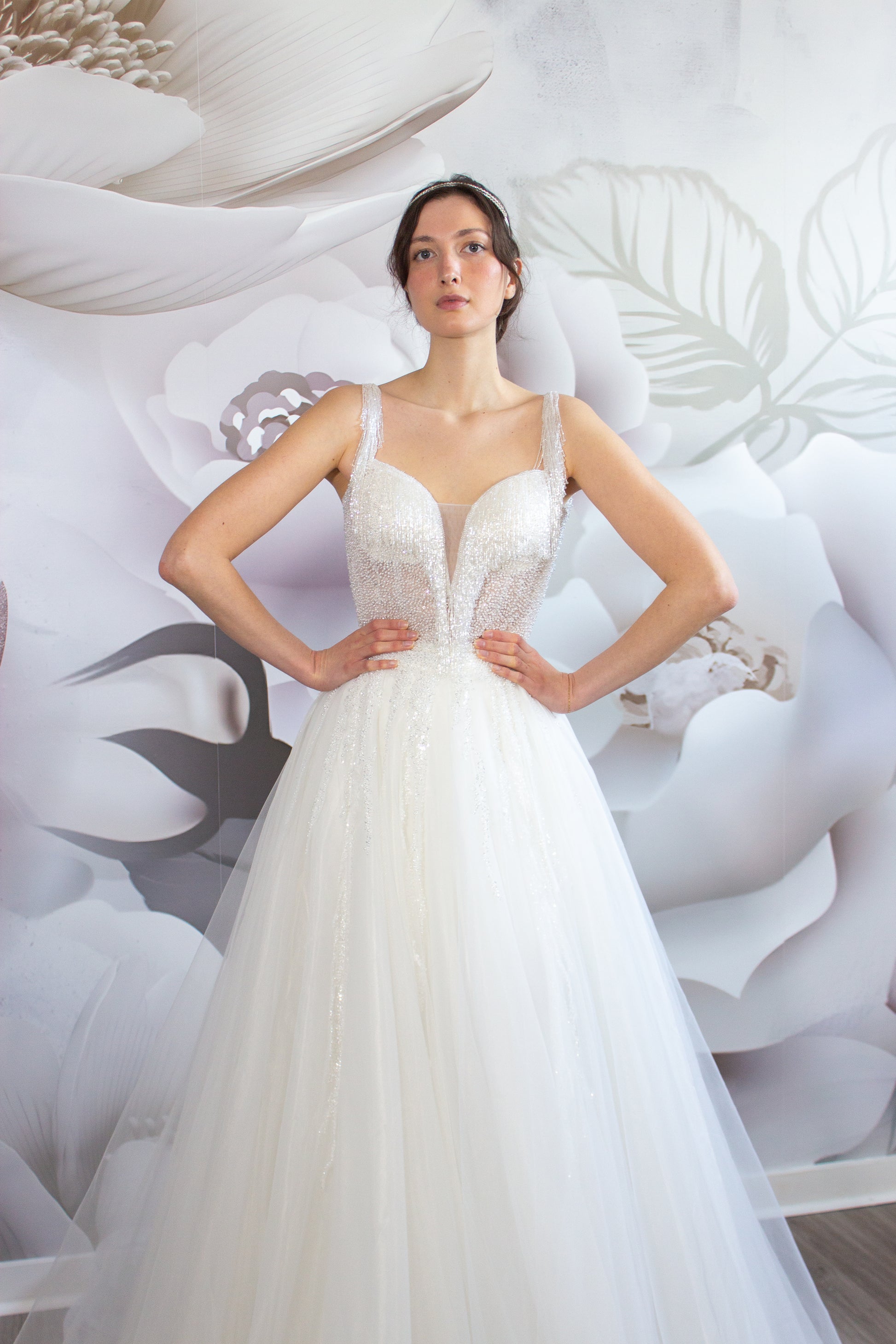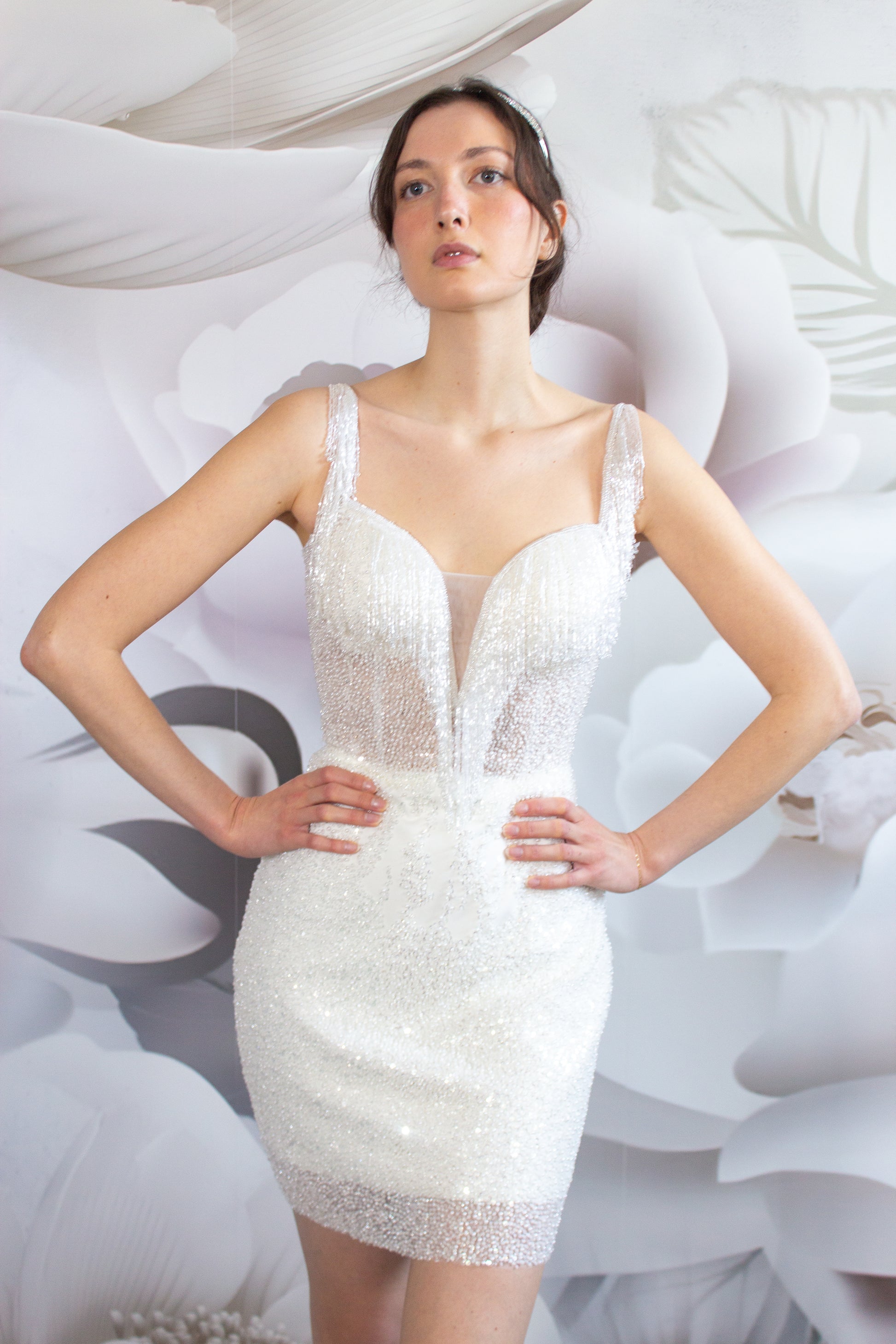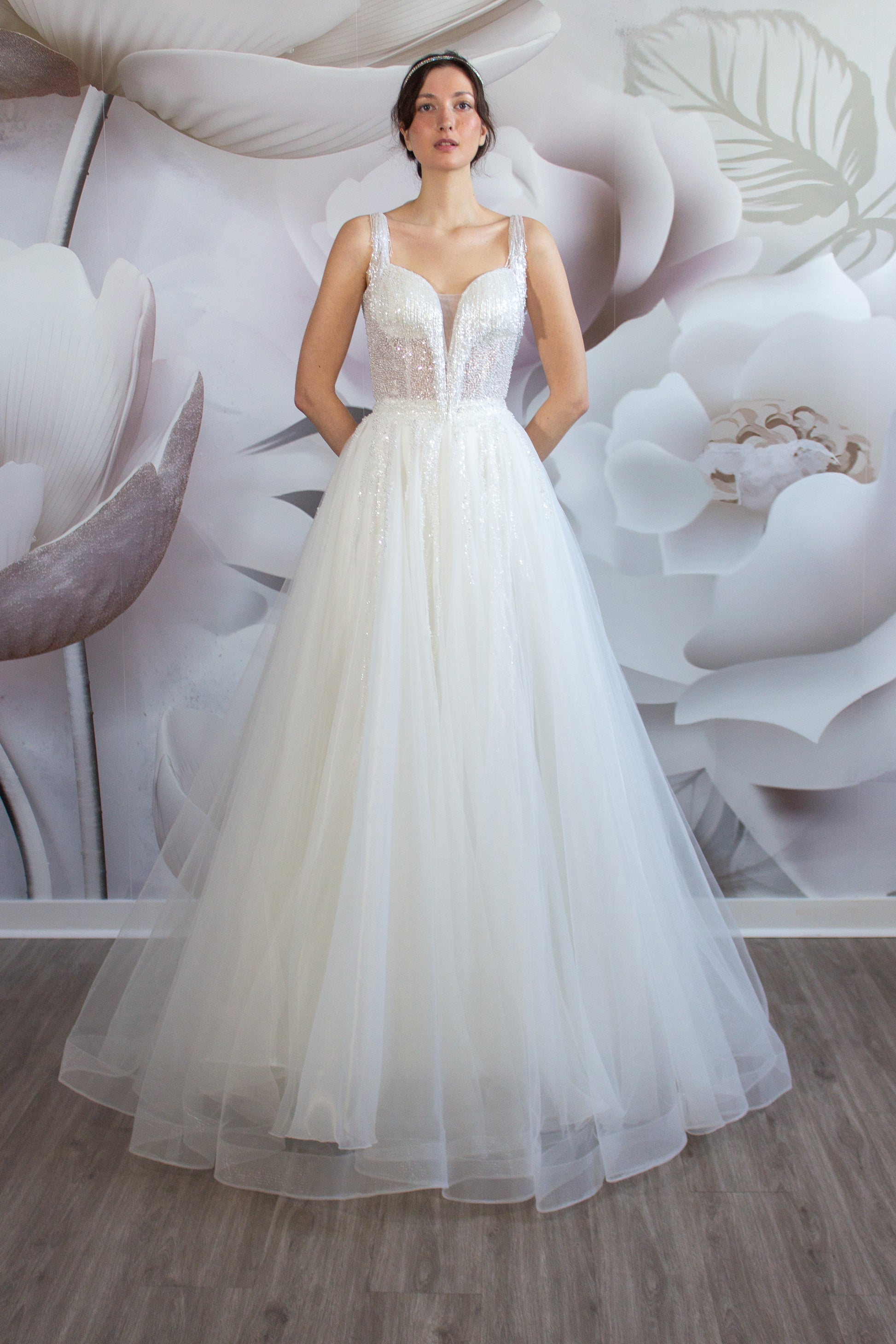 Robe de mariée à paillettes Gracie, une pièce époustouflante qui vous offre la polyvalence de deux looks en un. Cette robe est l'incarnation de l'élégance et du style, parfaite pour les mariées qui veulent une touche de glamour lors de leur journée spéciale.