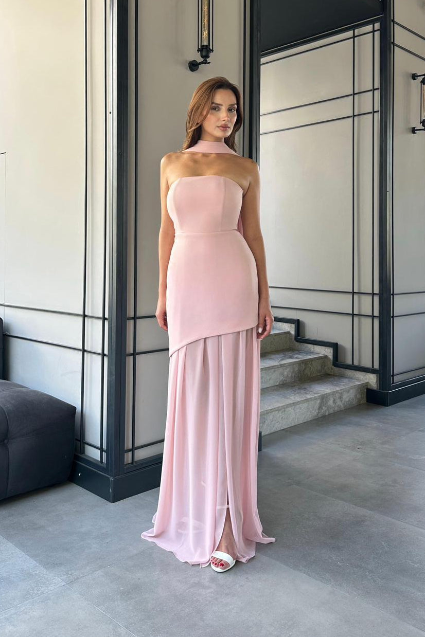 Soft, feminine, and effortlessly elegant, JOY is the definition of modern romance. This blush strapless evening gown features a clean, structured bodice that beautifully contours the figure, paired with a flowing chiffon skirt that moves gracefully with every step. The delicate neck scarf detail adds a refined, fashion-forward touch, elevating the look while keeping it timeless.
