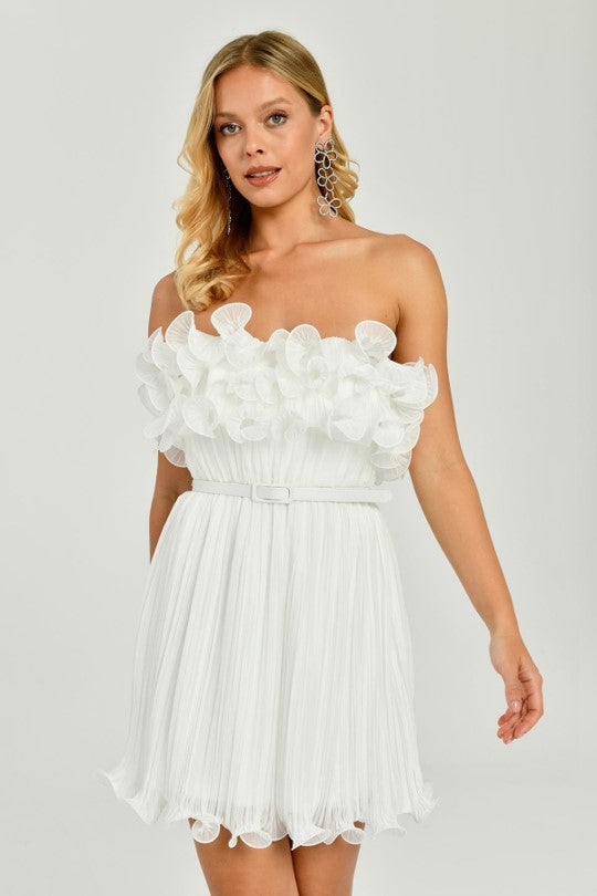 This dreamy mini white dress is the epitome of feminine charm and effortless elegance. The strapless design features a delicate, flowy silhouette complemented by a cascade of sculpted floral accents along the bodice, creating a romantic and whimsical look. A cinched waist with a matching belt enhances your figure, while the pleated skirt moves beautifully with every step. Perfect for bridal showers, summer parties, or any special occasion, this dress will make you feel as graceful as you look. Pair it with statement earrings and heels for a polished ensemble.
