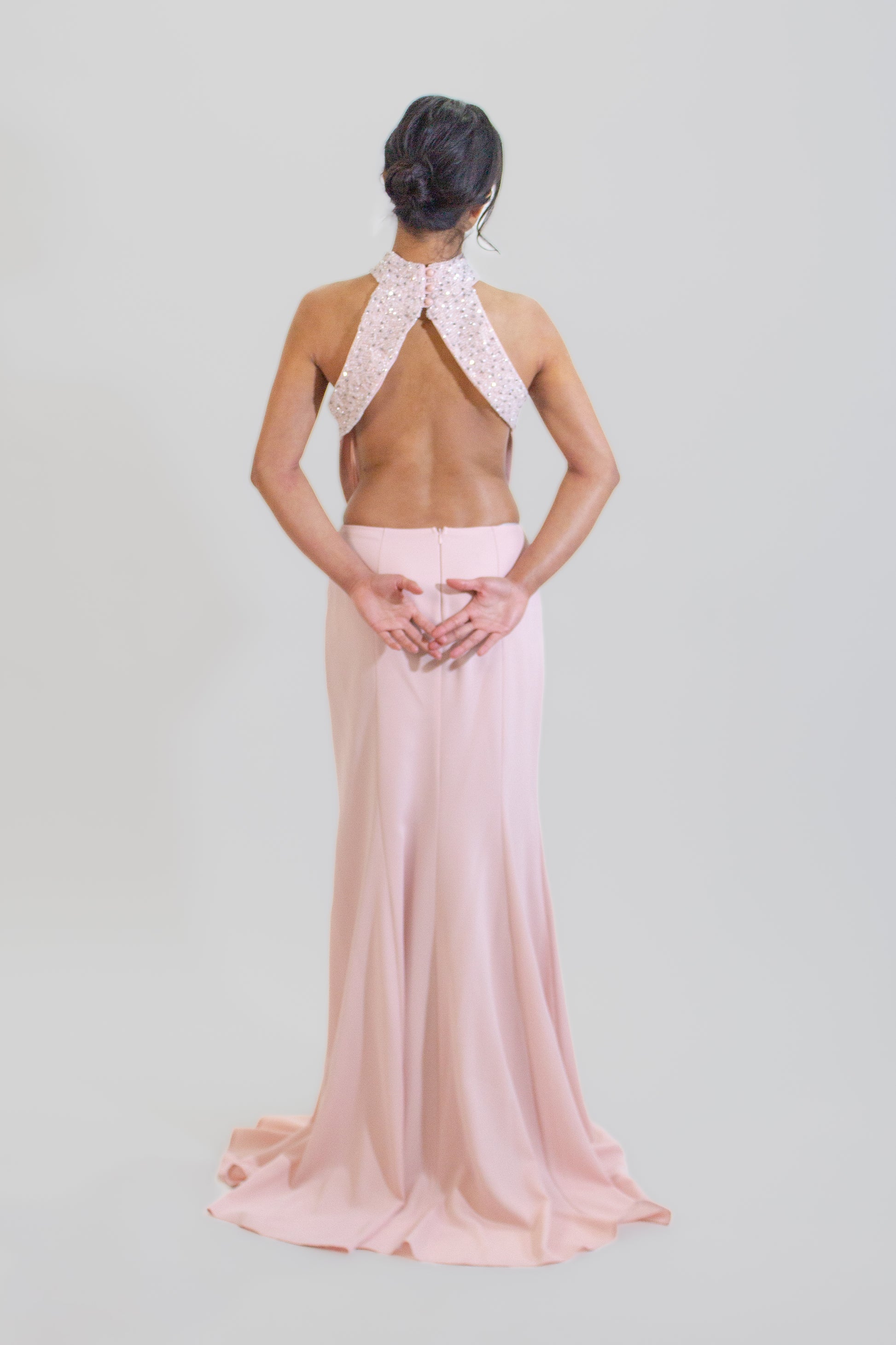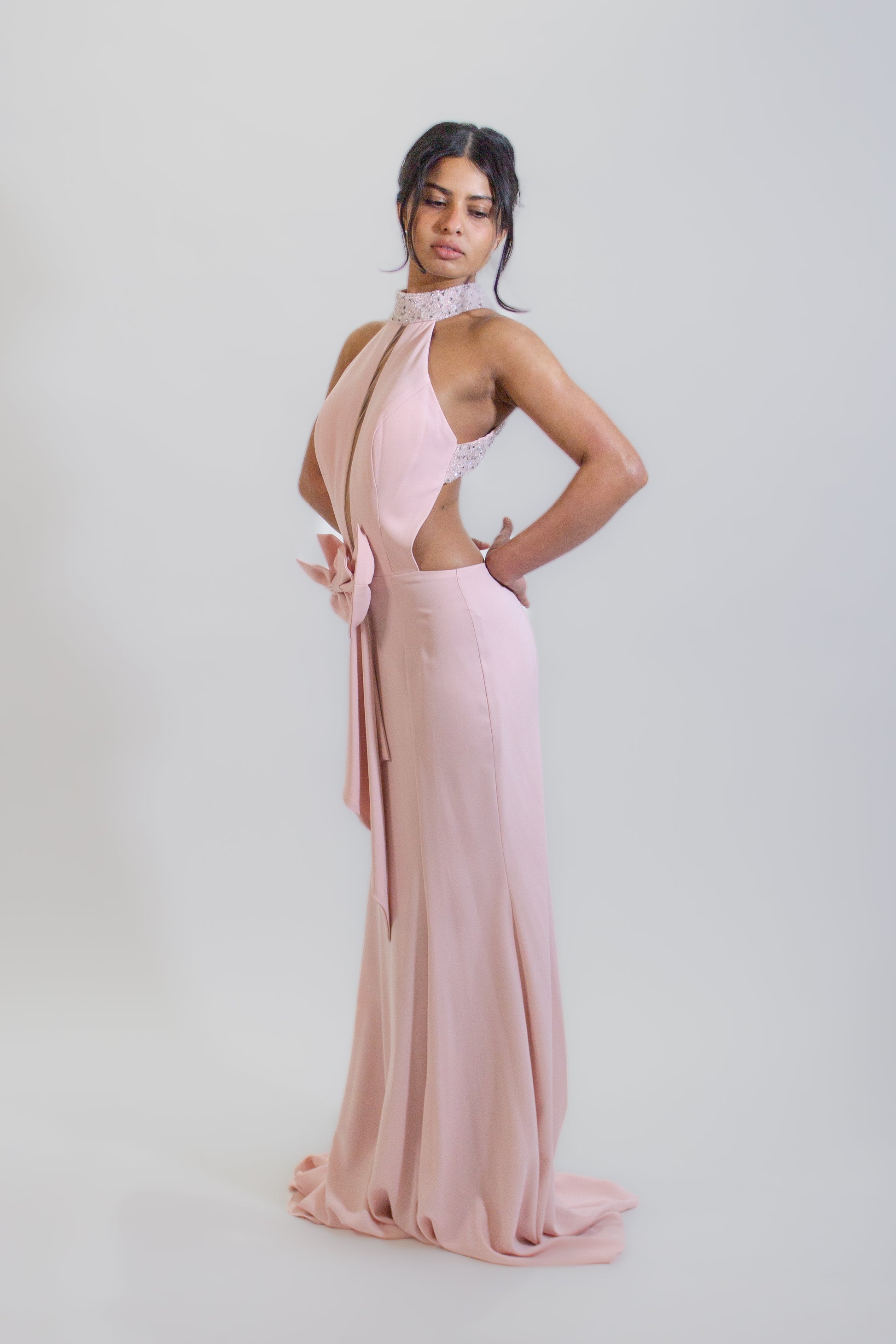 Cette superbe robe rose présente un col haut avec un design dos nu, orné d'un décolleté perlé et d'un charmant nœud sur le devant.