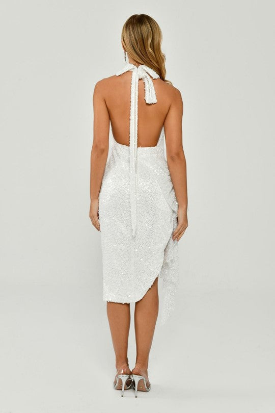Elevate your style with this dazzling sequin halter dress in an elegant white hue. This statement piece features a high neckline and an open back that ties delicately for a touch of sophistication and allure. Covered in shimmering sequins, the dress catches the light from every angle, making it perfect for glamorous evenings or special celebrations. The draped detailing along the skirt creates a flattering silhouette, while the asymmetrical hemline adds a modern and chic edge. With its backless design and luxurious sequin finish, this dress is a showstopper that ensures all eyes are on you.