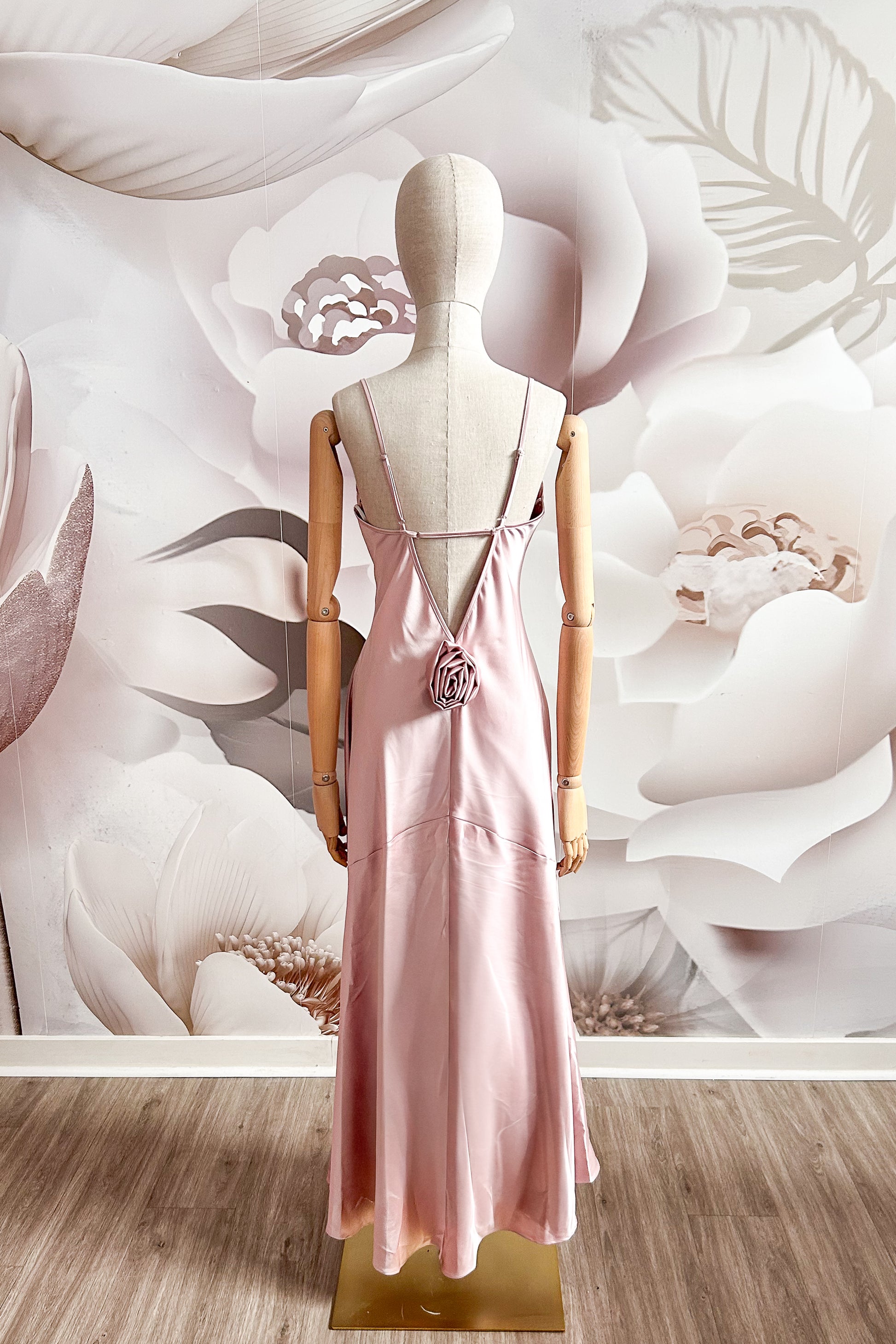 The open back adds a striking touch, highlighted by a delicate rose detail that brings a subtle element of romance and sophistication. The flowing maxi-length skirt moves effortlessly, making this dress a stunning option for weddings, formal dinners, summer celebrations, and special evening occasions.