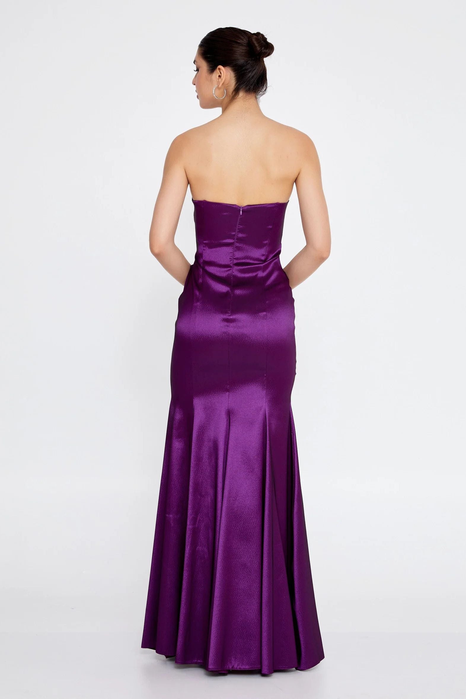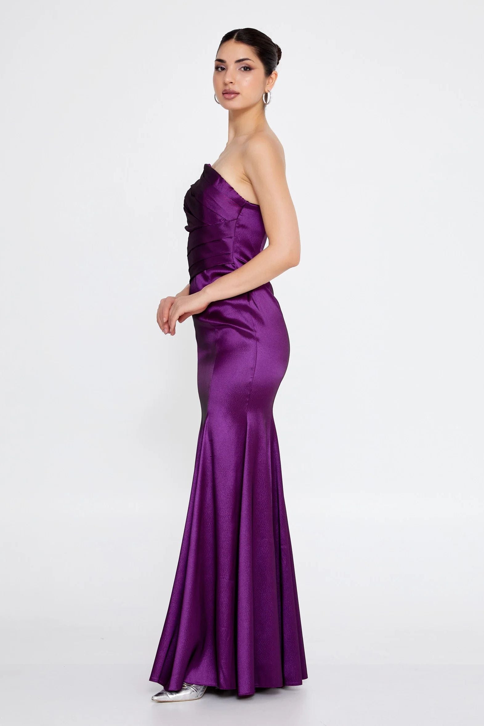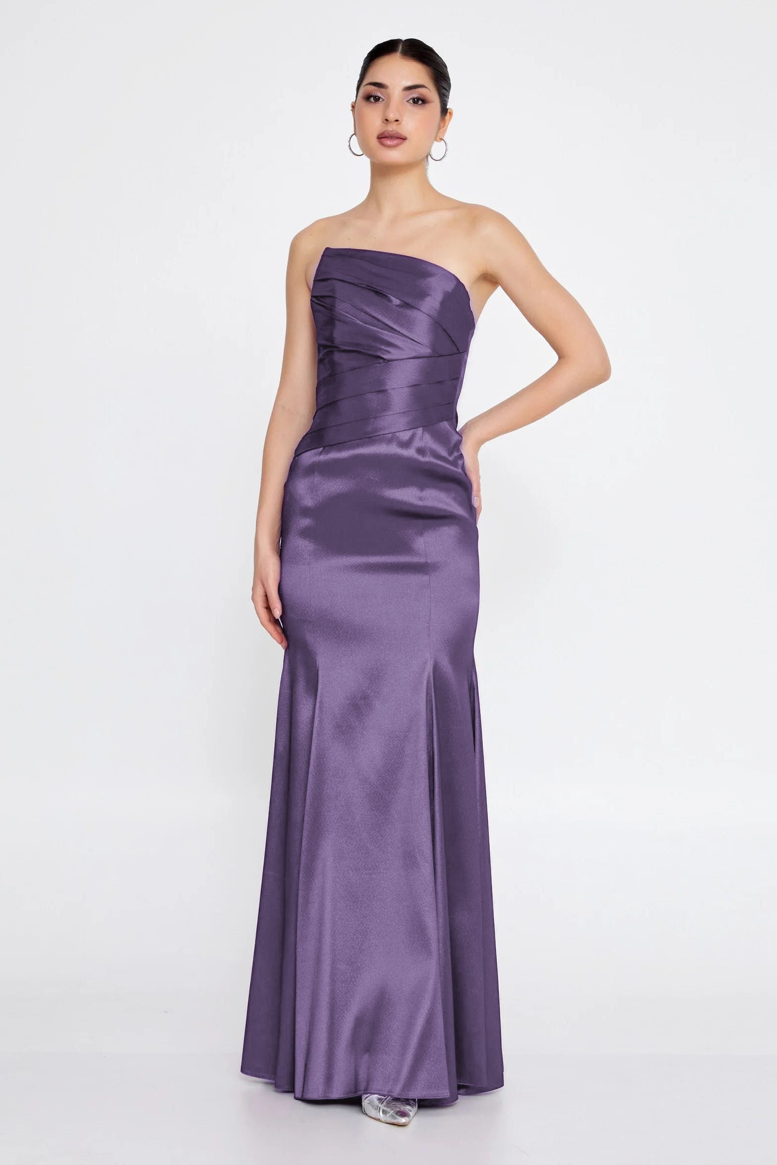 The Peyton Gown features a sleek, strapless silhouette crafted from a structured, form-holding fabric that creates a clean, sculpted look. The softly pleated bodice wraps across the neckline and waist, enhancing the figure with a tailored, contoured fit that feels both secure and refined. The skirt falls smoothly into a full-length hem, offering elegant movement while maintaining its polished shape. Perfect for evening events, formal gatherings, or special celebrations, the Peyton Gown delivers modern sophistication with a confident, architectural edge.