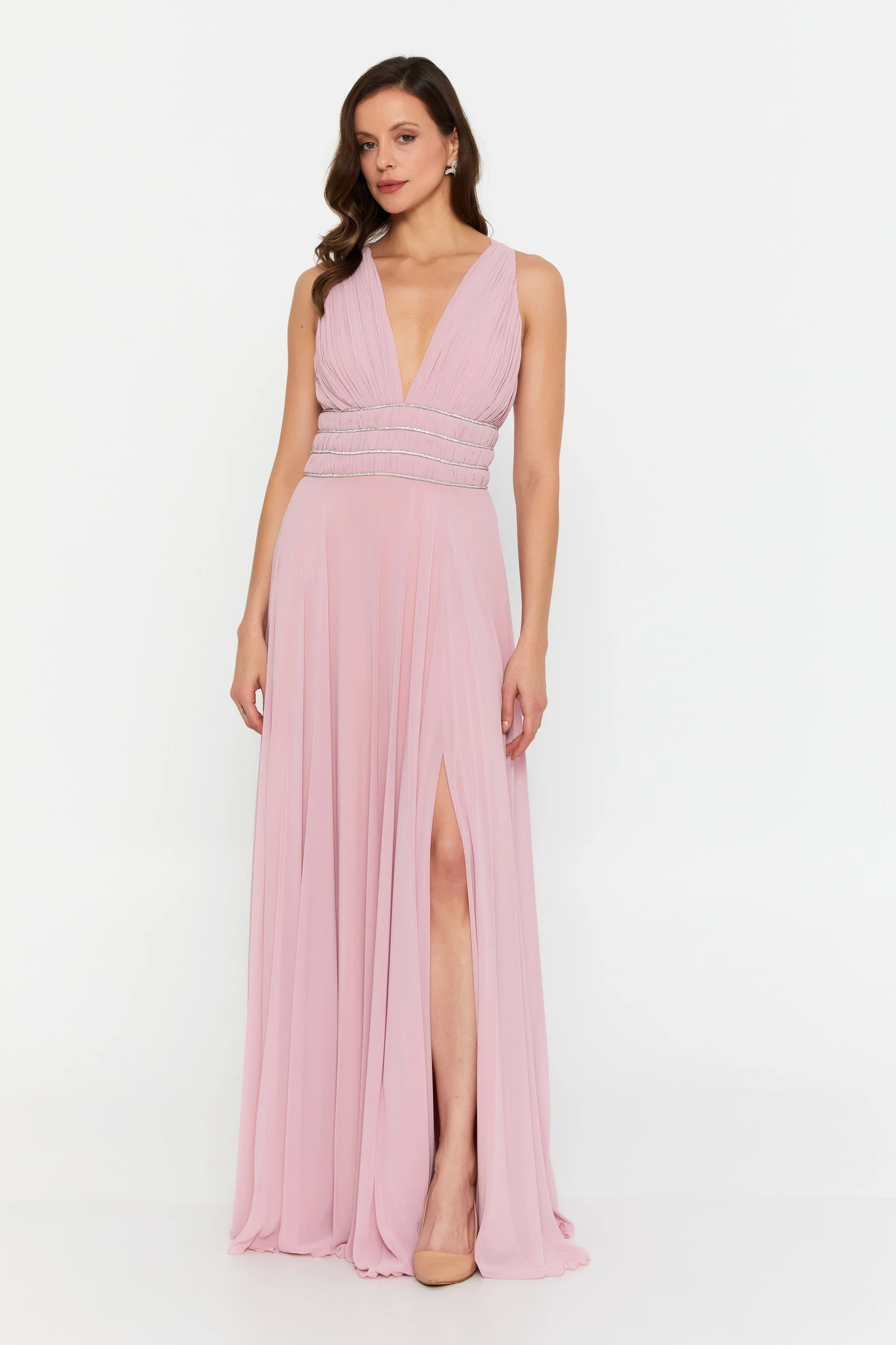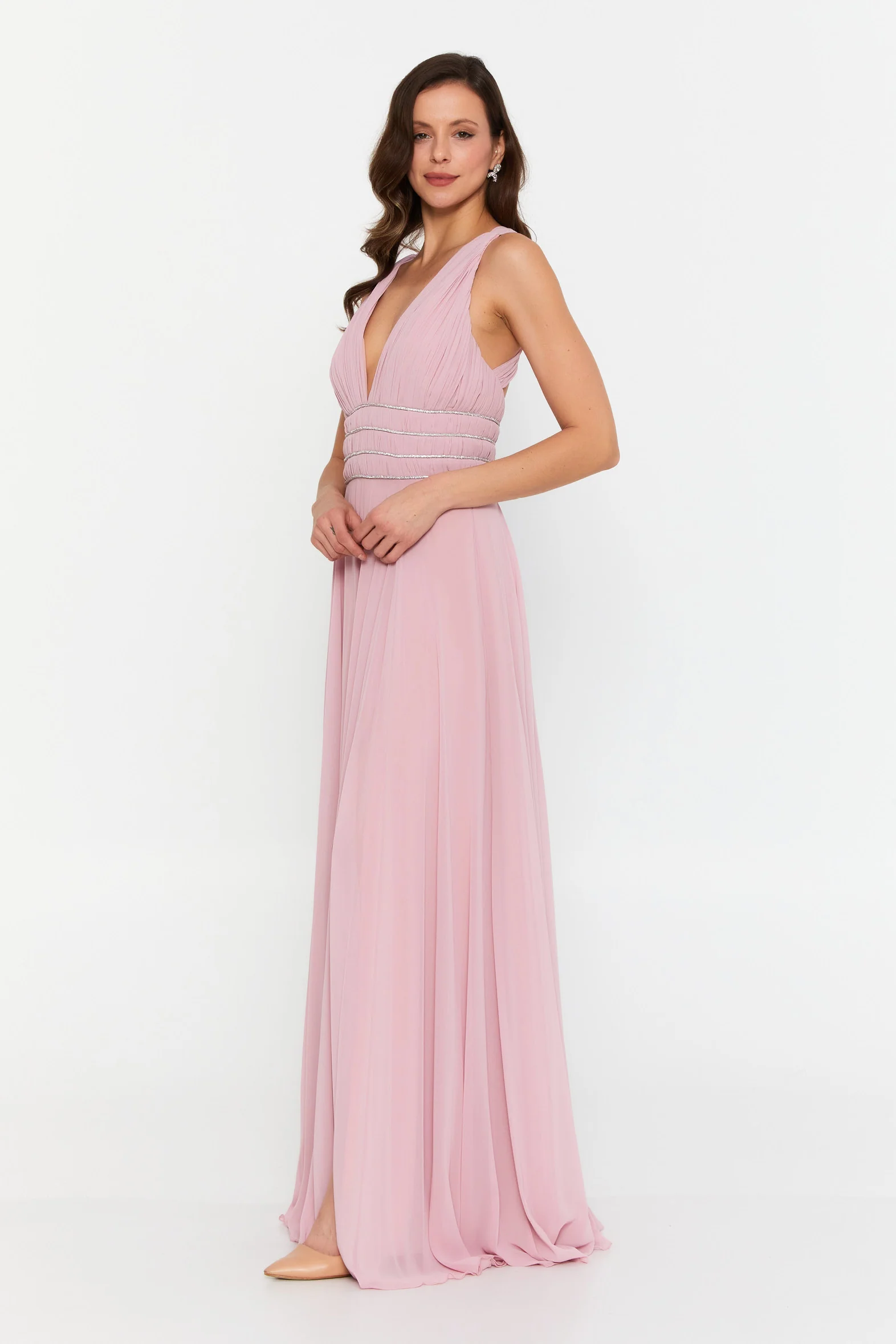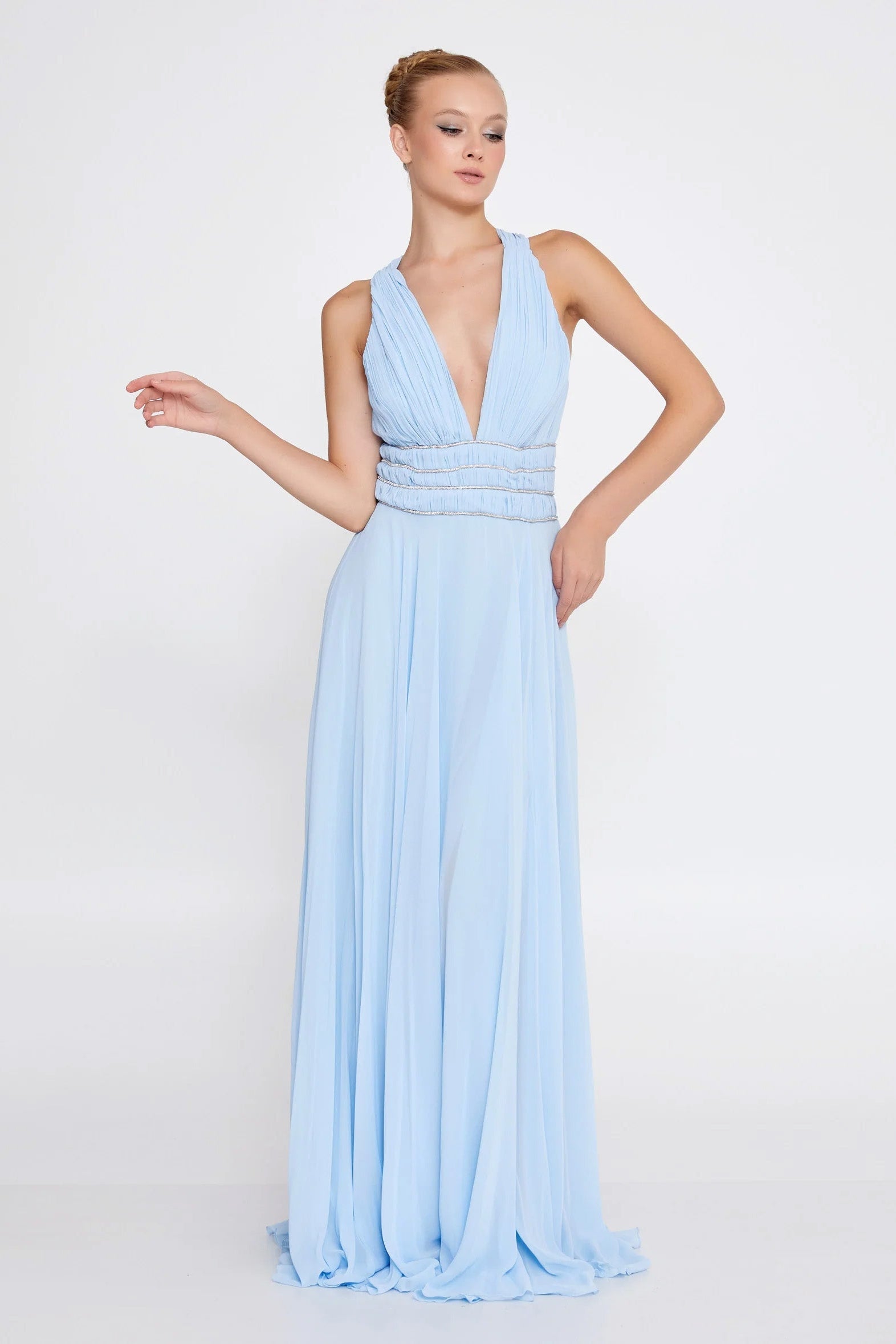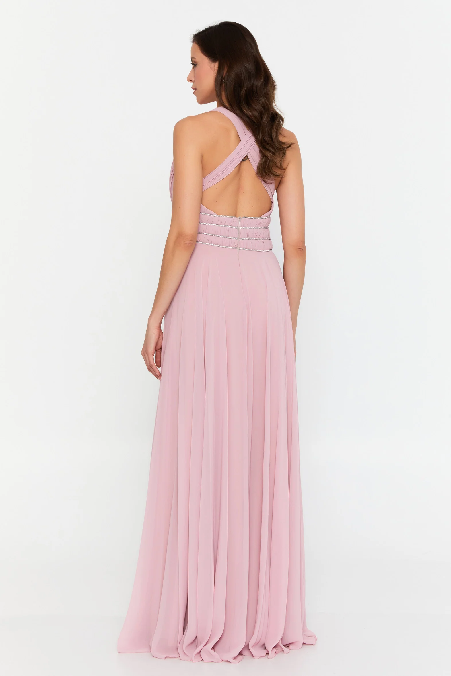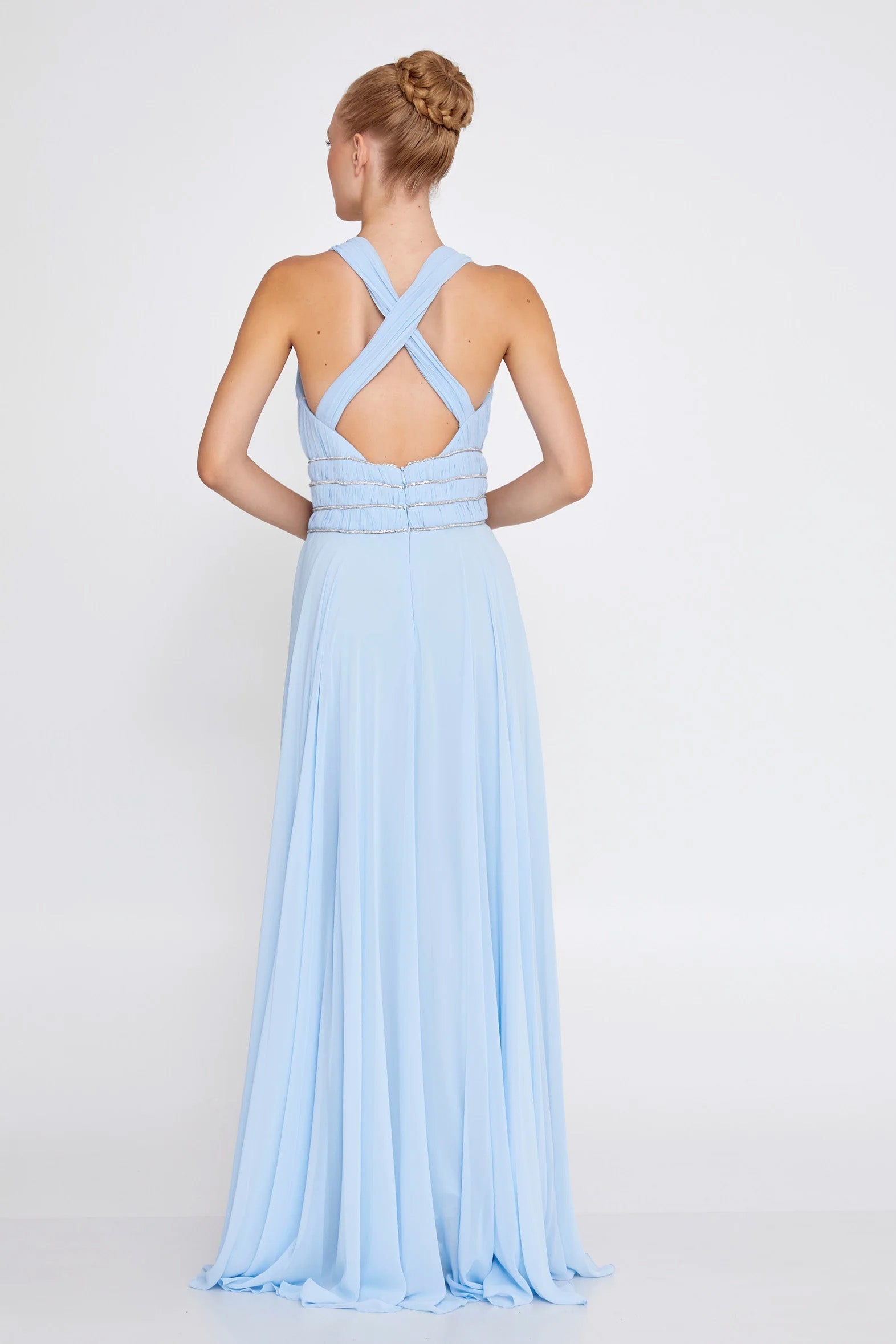 The cinched, embellished waistband defines the waist while offering subtle sparkle, flowing into a full-length chiffon skirt that moves effortlessly with every step. The open criss-cross back adds an elegant finishing touch, making this gown just as stunning from behind.