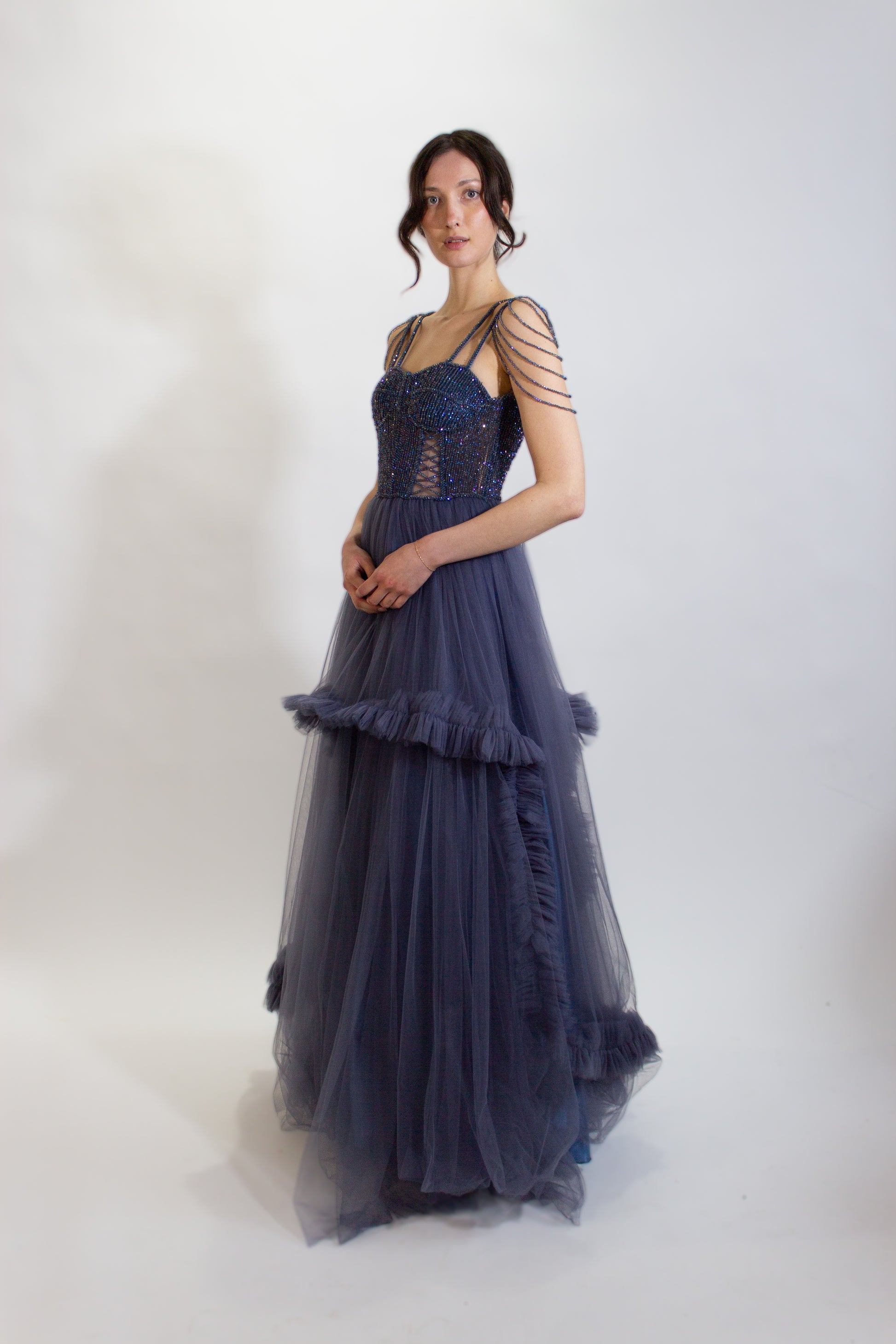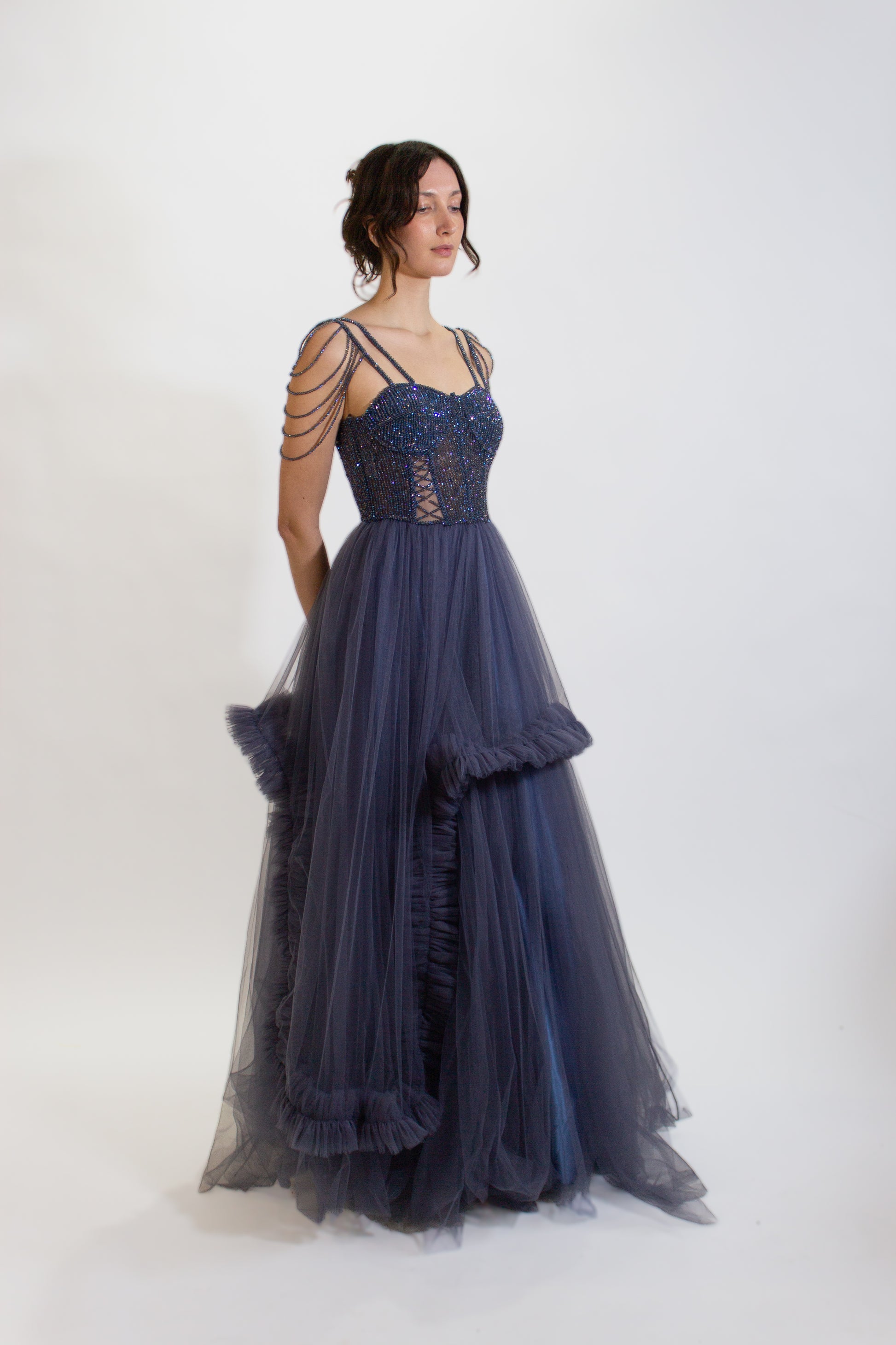La silhouette fluide se drape gracieusement, accentuant chacun de vos mouvements avec un charme sans effort. L'élégante robe de soirée STELLA est une déclaration de sophistication et de grâce, parfaite pour créer des souvenirs impérissables.