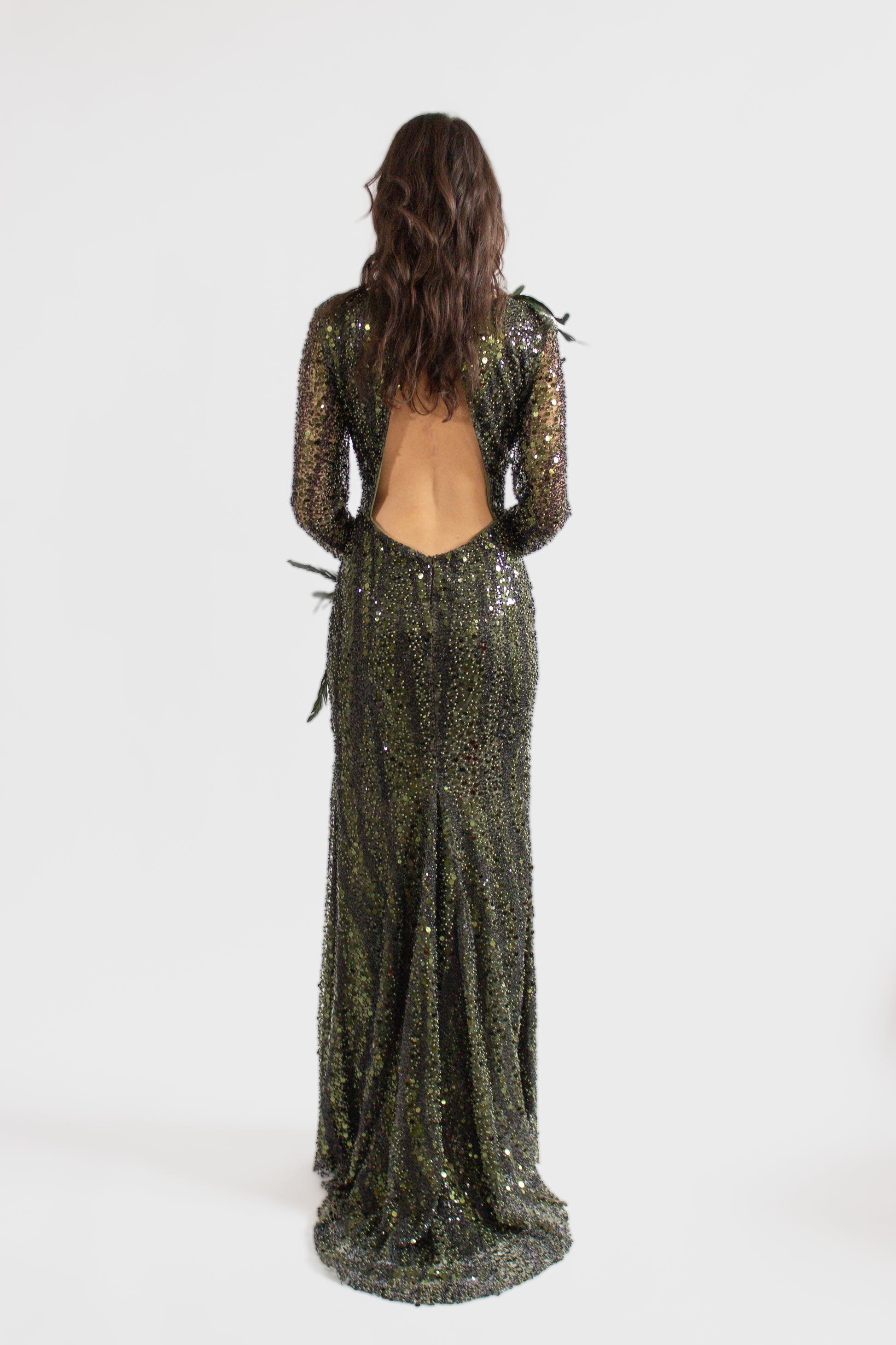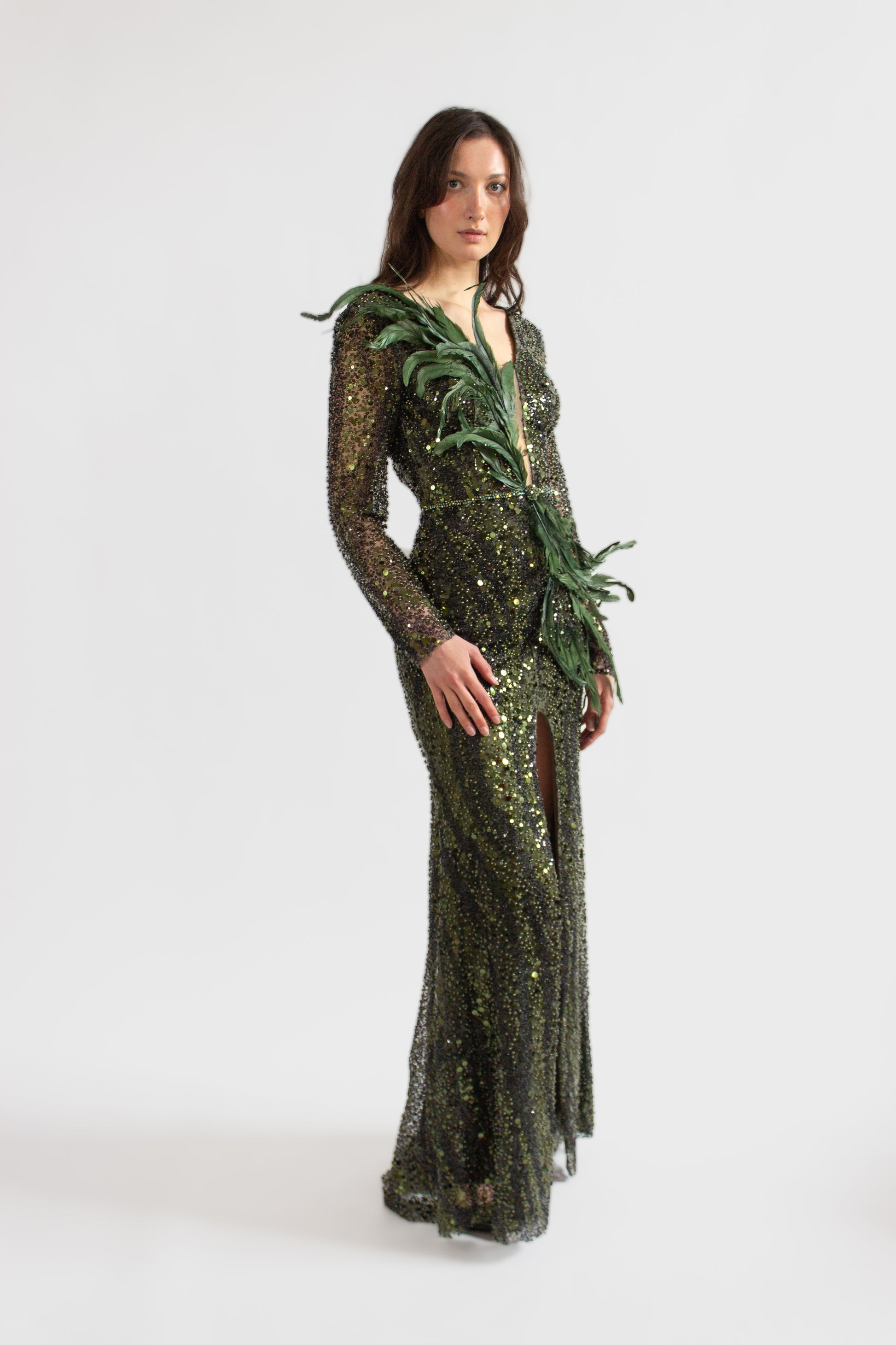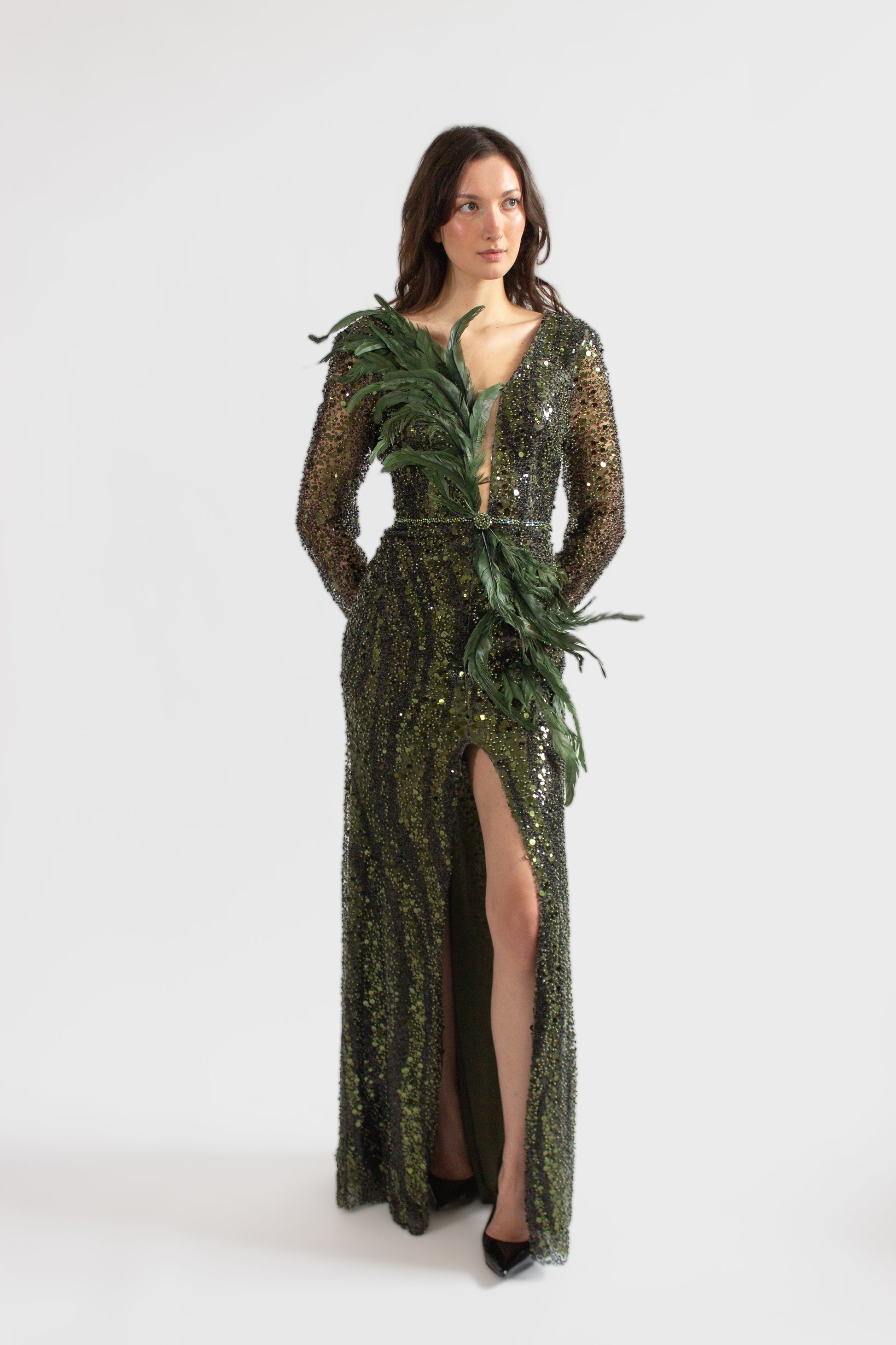 Entrez sous les feux de la rampe avec notre exquise robe VIVIAN de la collection ONE OF A KIND. Cette superbe robe de soirée verte avec des paillettes est une véritable pièce maîtresse qui garantit l'exclusivité. Adoptez l'élégance et le charme d'un modèle doté d'un col en V profond et de manches longues, orné d'embellissements complexes en sequins. La fente haute sur la jambe et le dos ouvert ajoutent une touche de sophistication audacieuse, faisant de cette robe un incontournable pour celles qui ont soif d'individualité dans leur garde-robe. Élevez votre style et devenez le centre d'attention avec notre robe de soirée exceptionnelle.