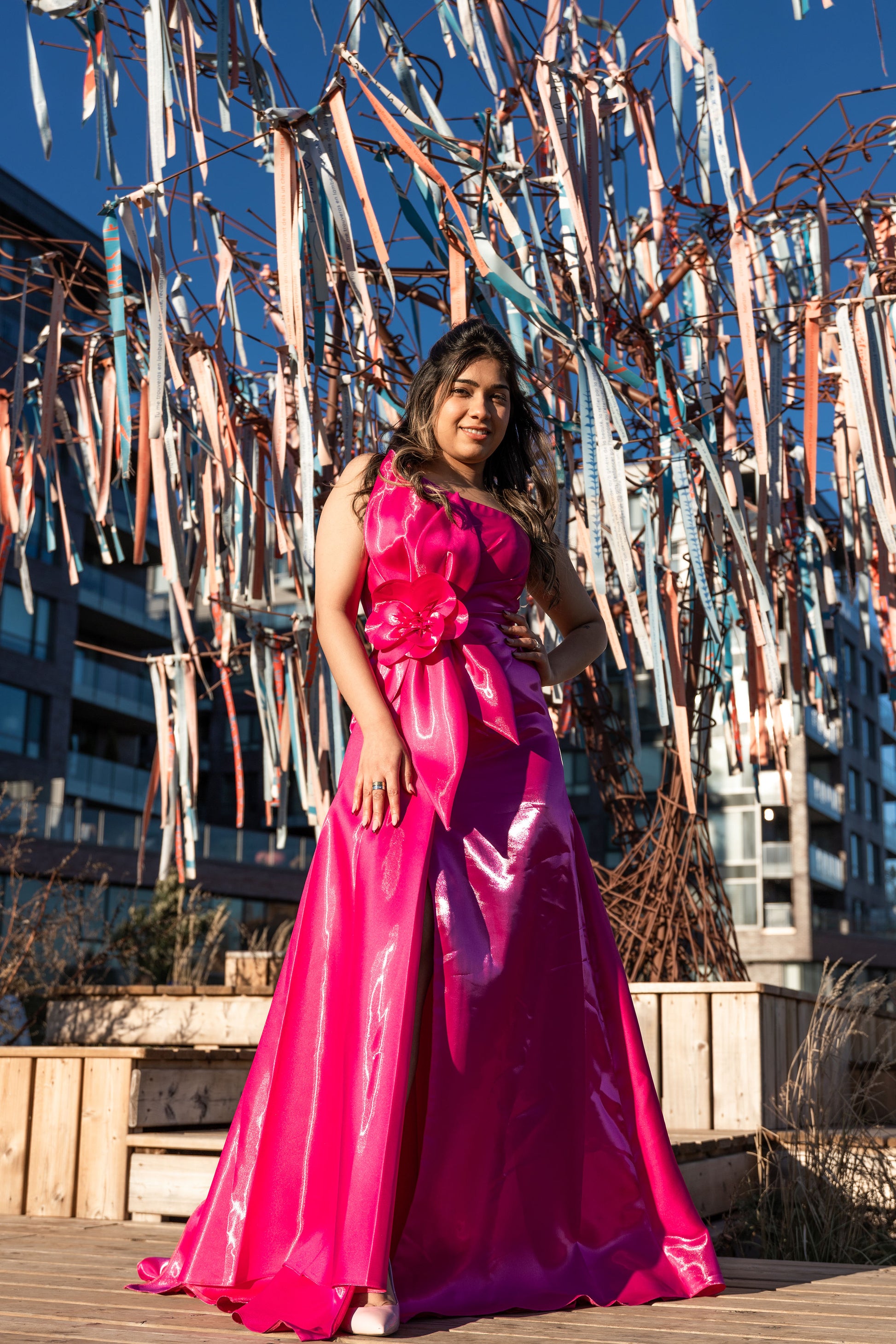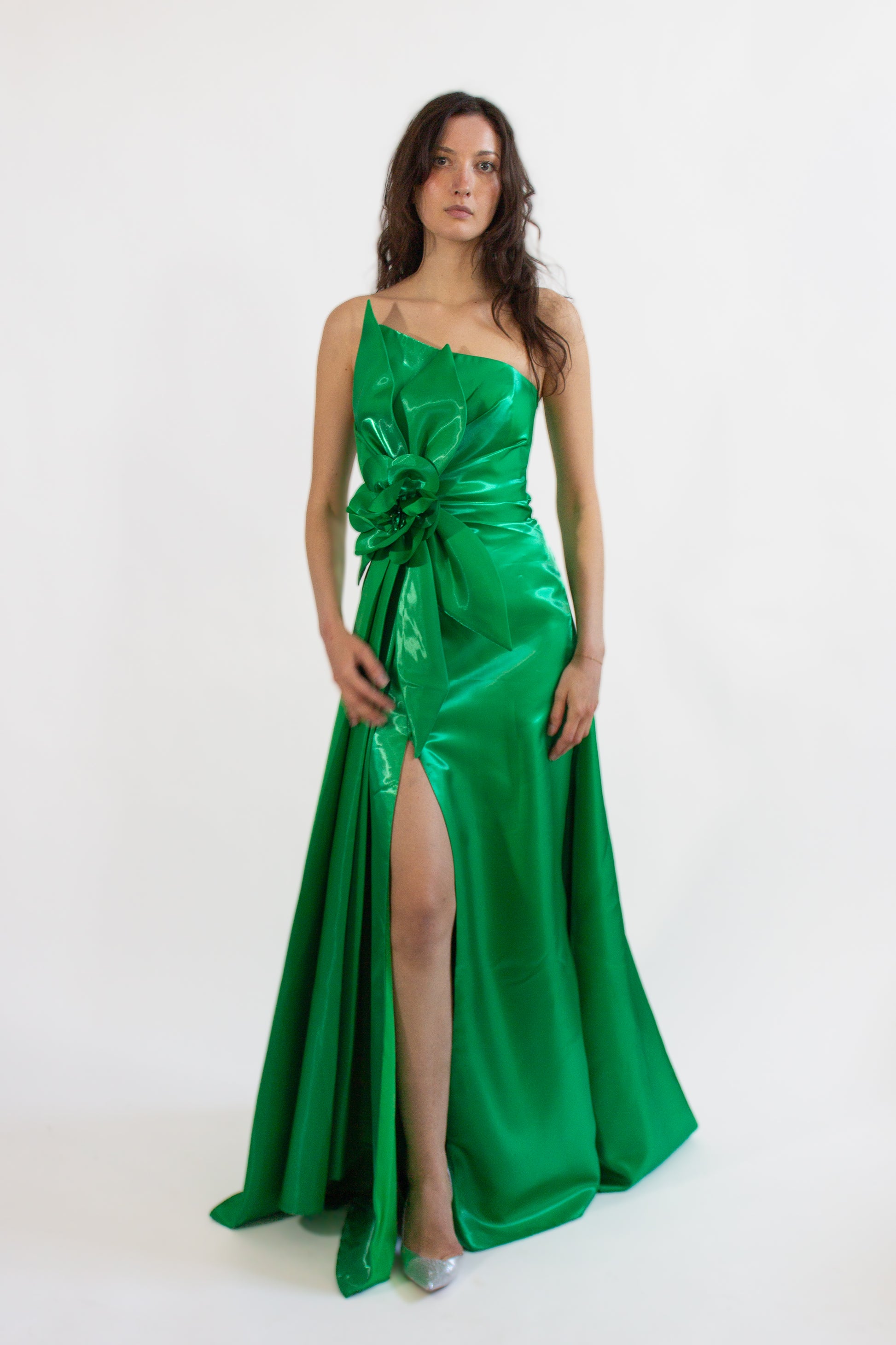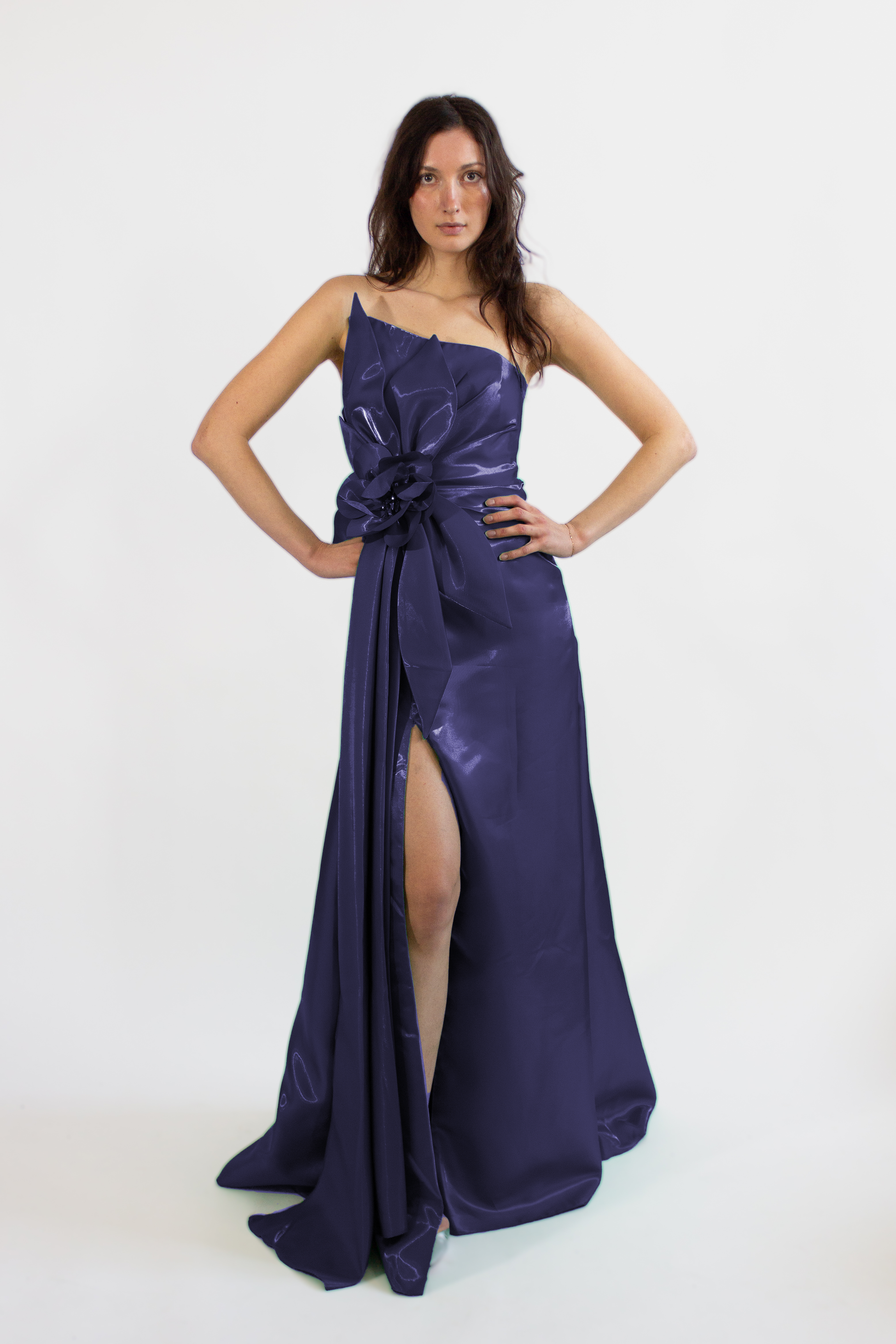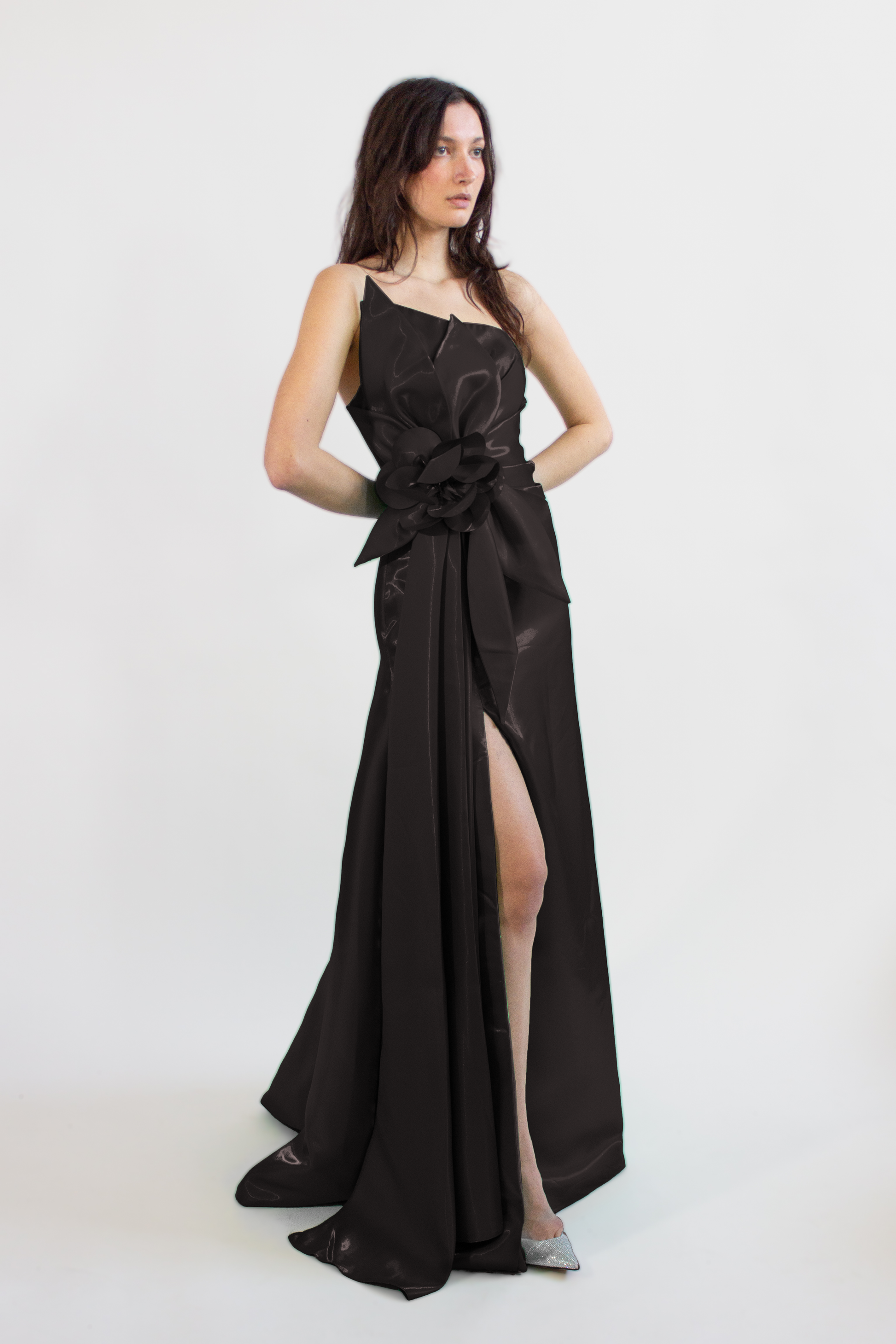 Elevate your evening look with our stunning ANNA Gown. Crafted to impress, this floor-length gown embodies elegance and sophistication. The dress features a striking asymmetric neckline, coupled with a high slit on one leg for a touch of allure. Adorned with a delicate flower embellishment at the waist, this gown exudes femininity and grace.