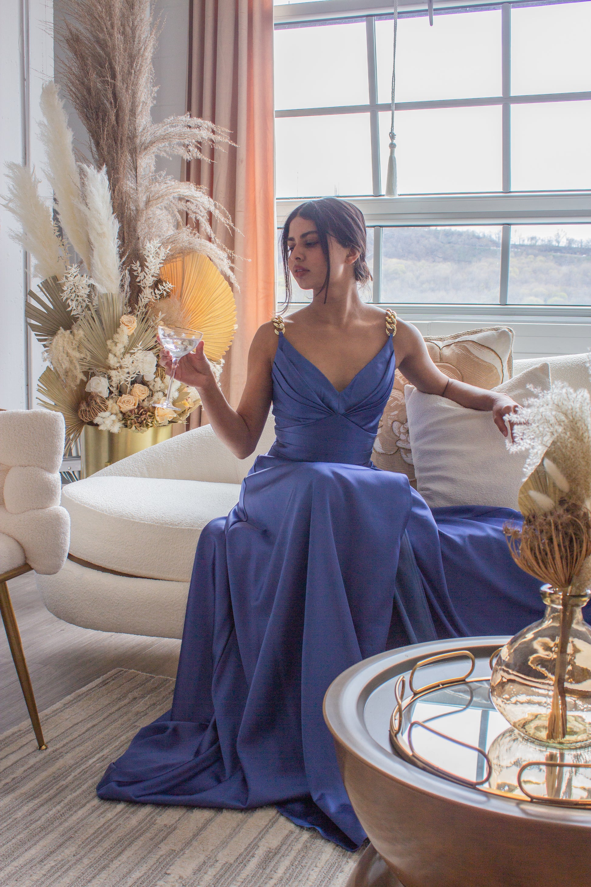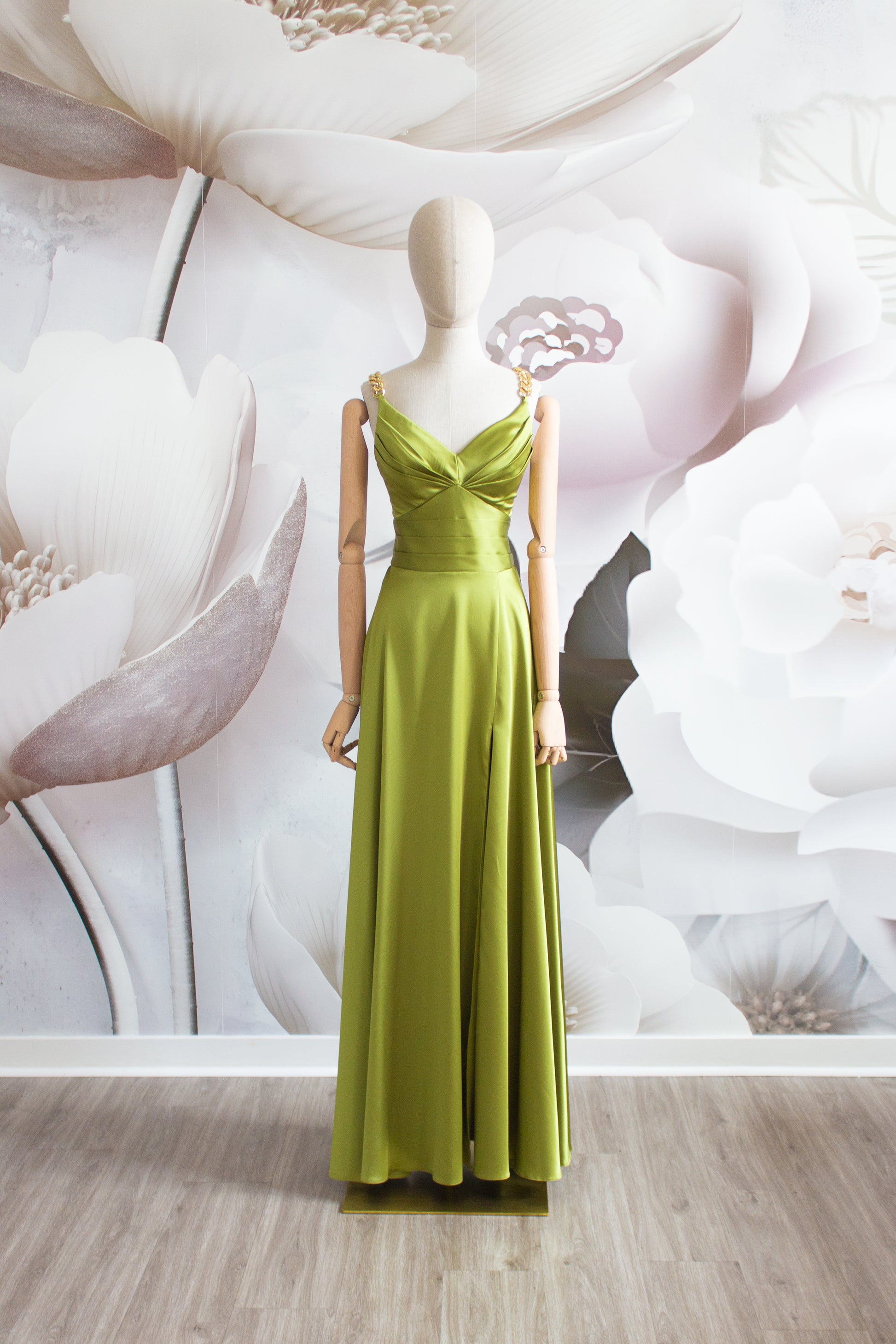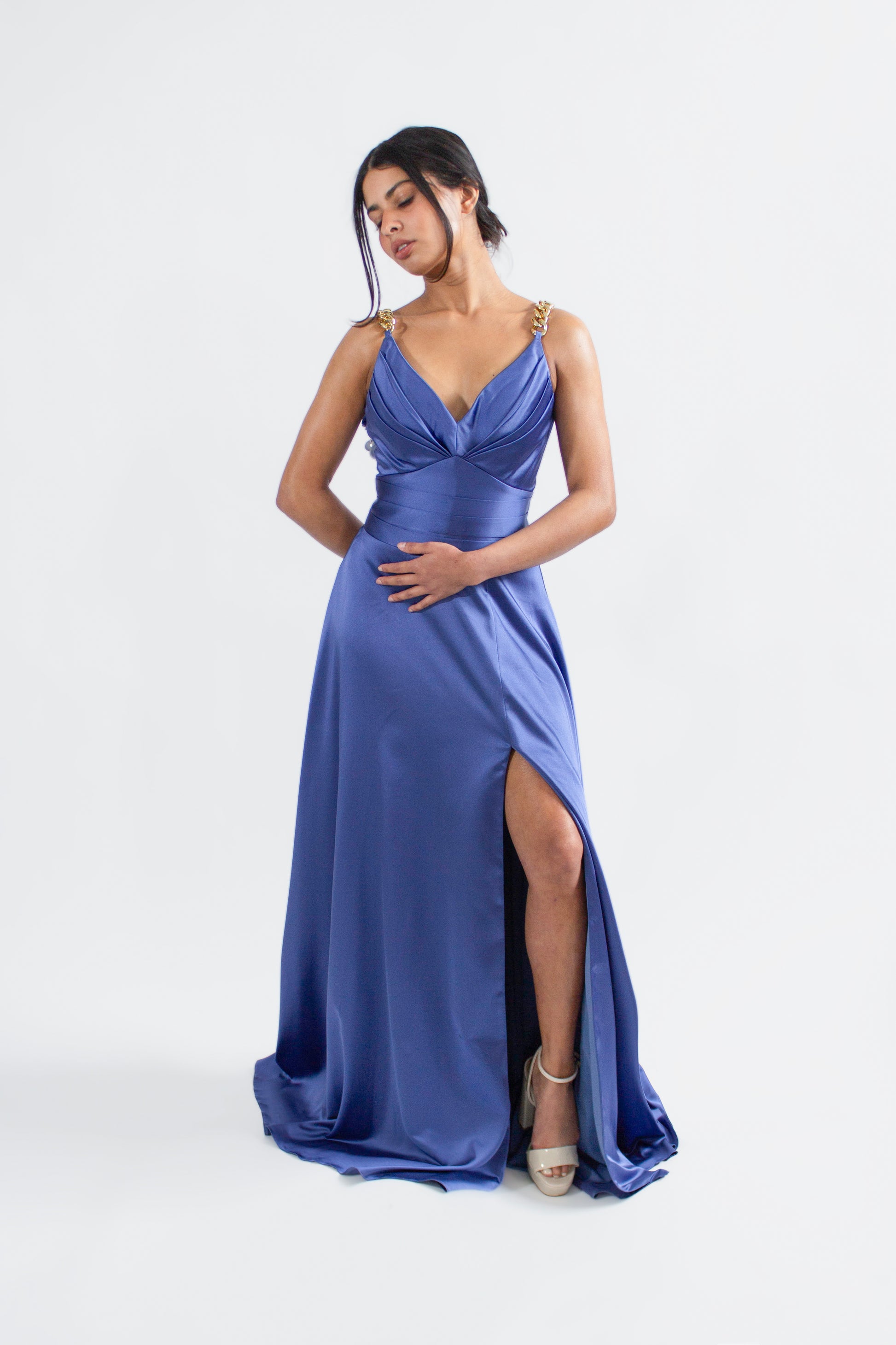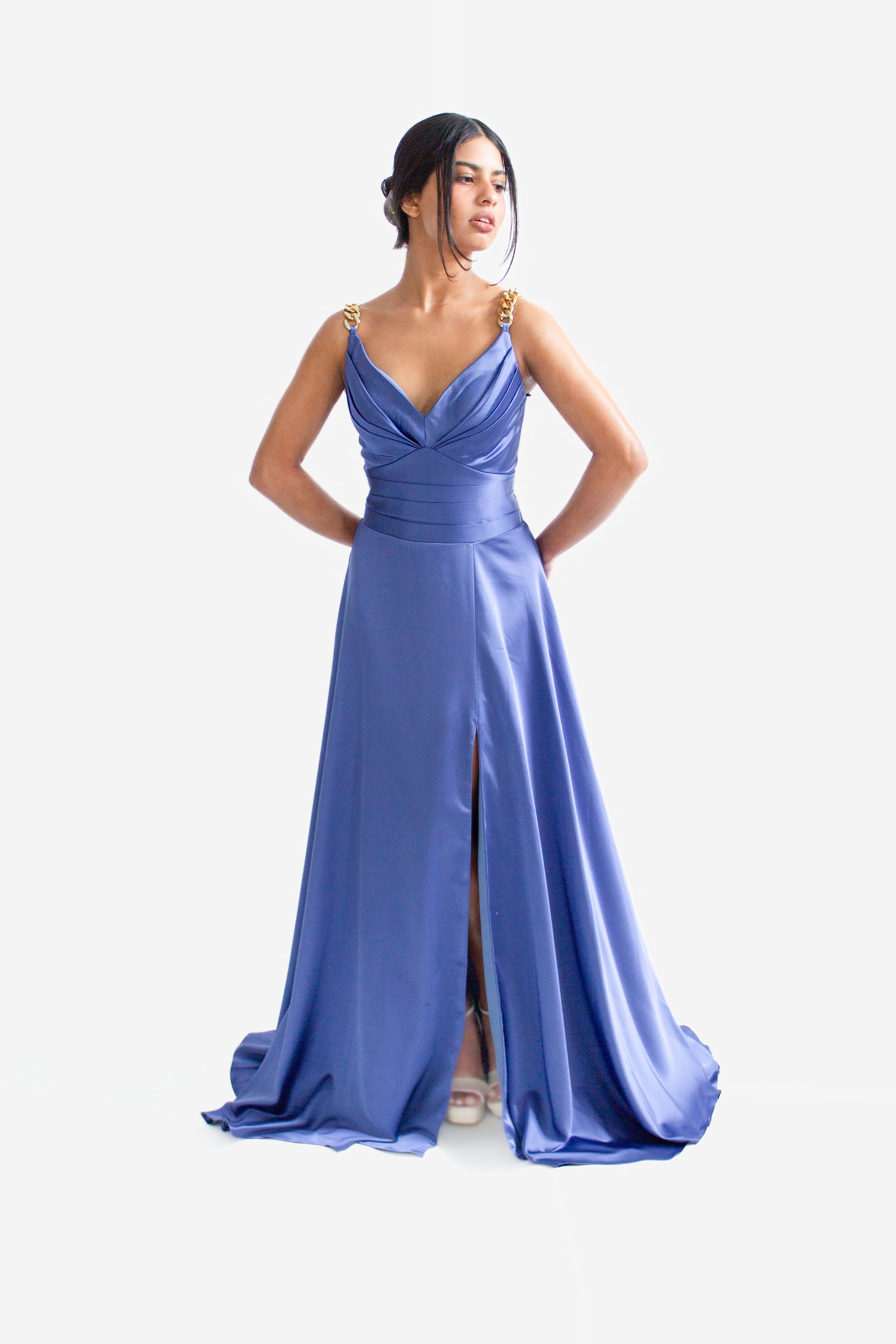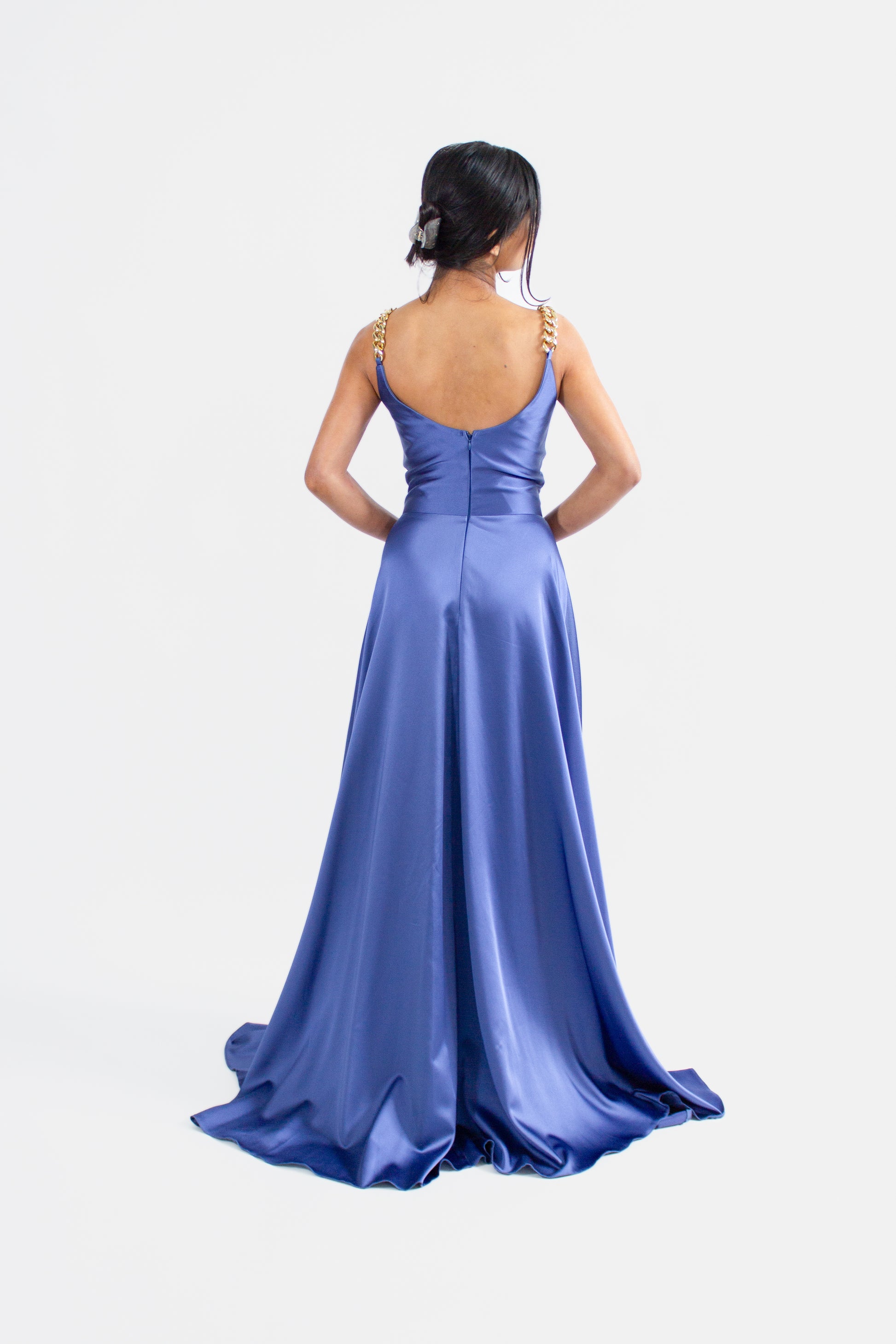Make a glamorous entrance in our exquisite satin evening gown. This stunning dress features luxurious satin fabric that drapes elegantly, exuding sophistication and style. The gold chain straps add a touch of opulence, while the high slit creates a dramatic and alluring silhouette.