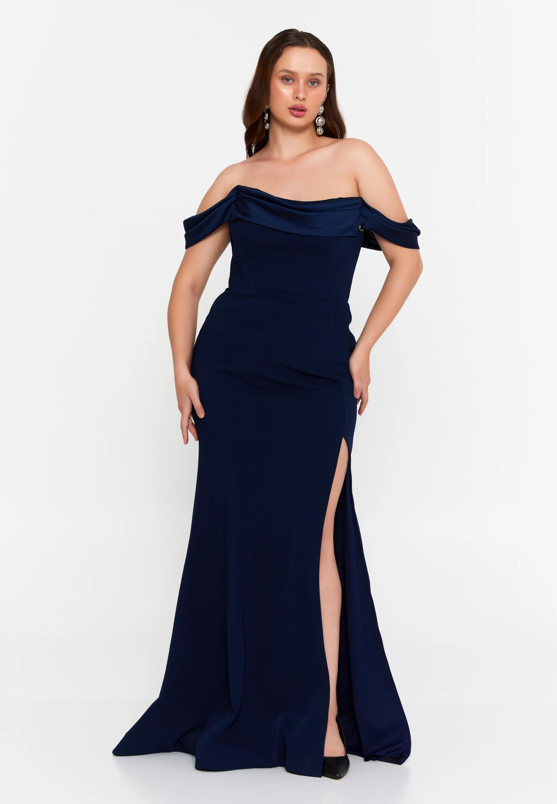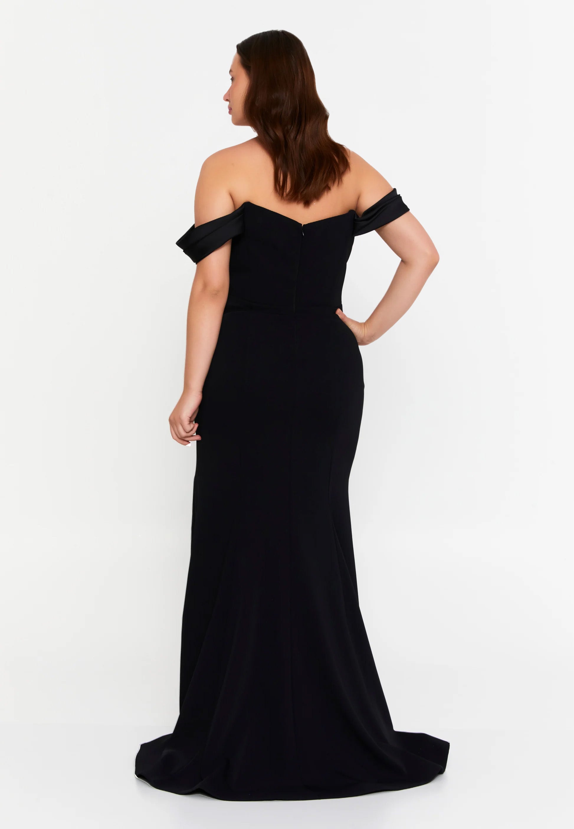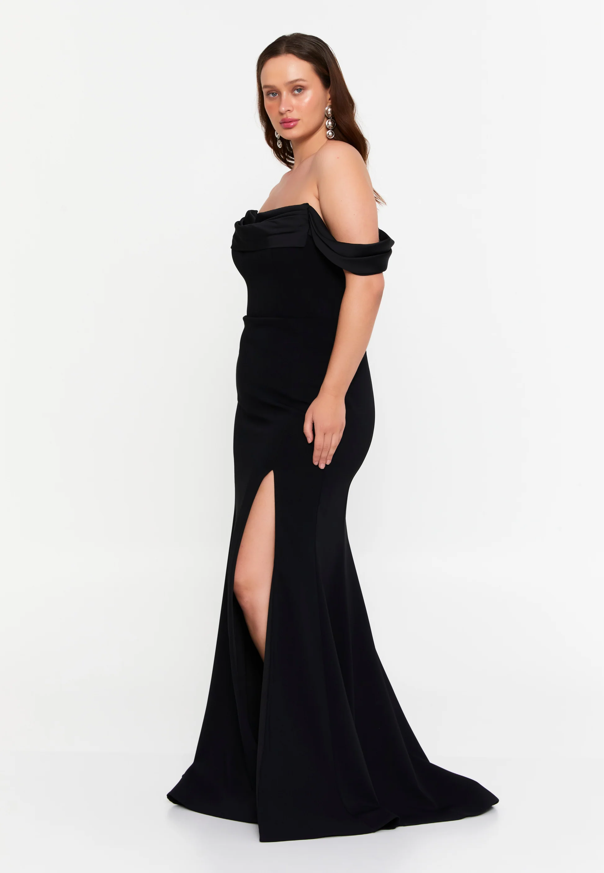 The straight neckline is complemented by off-the-shoulder straps, framing the shoulders beautifully while maintaining a sleek, structured look. Available in classic Navy and Black, the ATHENA Gown is a refined choice for black-tie events, formal evenings, weddings, and galas.
