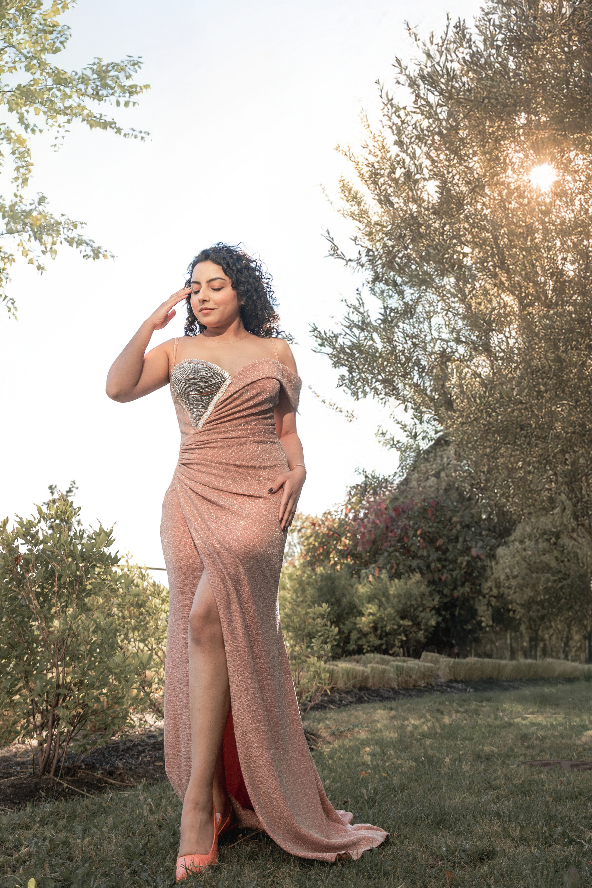 Step into the spotlight with our stunning off-shoulder glitter evening dress with a silver bust embellishment. This dress exudes elegance and charm, perfect for making a statement at any formal event. The stylish off-shoulder design and high slit create a sophisticated and alluring look that is sure to turn heads.