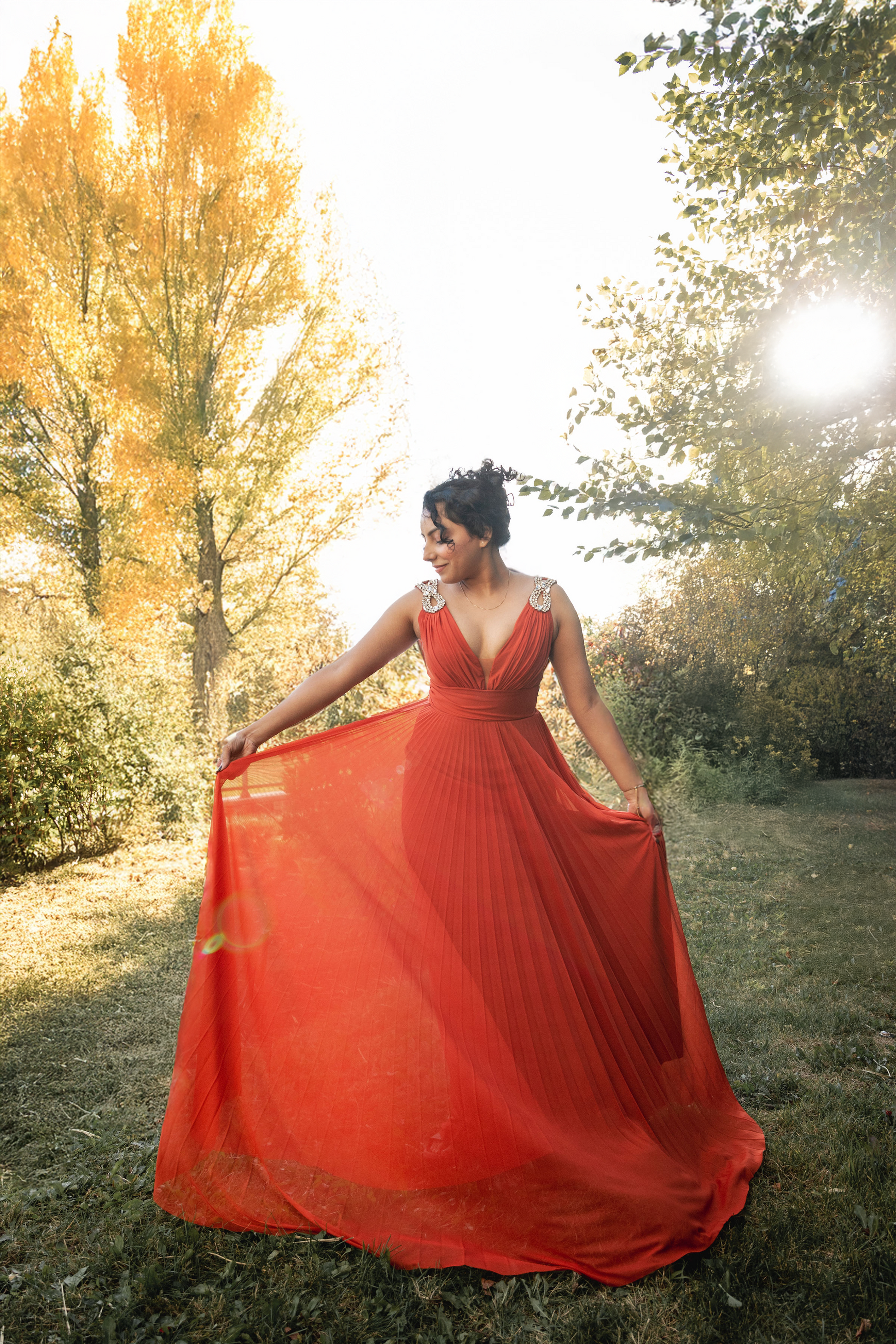 Indulge in elegance with our breathtaking floor-length gown. This exquisite dress is the epitome of sophistication, featuring a timeless design that is perfect for formal events and special occasions. The light blue color exudes serenity and while the orange exudes charm, and the floor-length silhouette adds a touch of luxury to your ensemble.