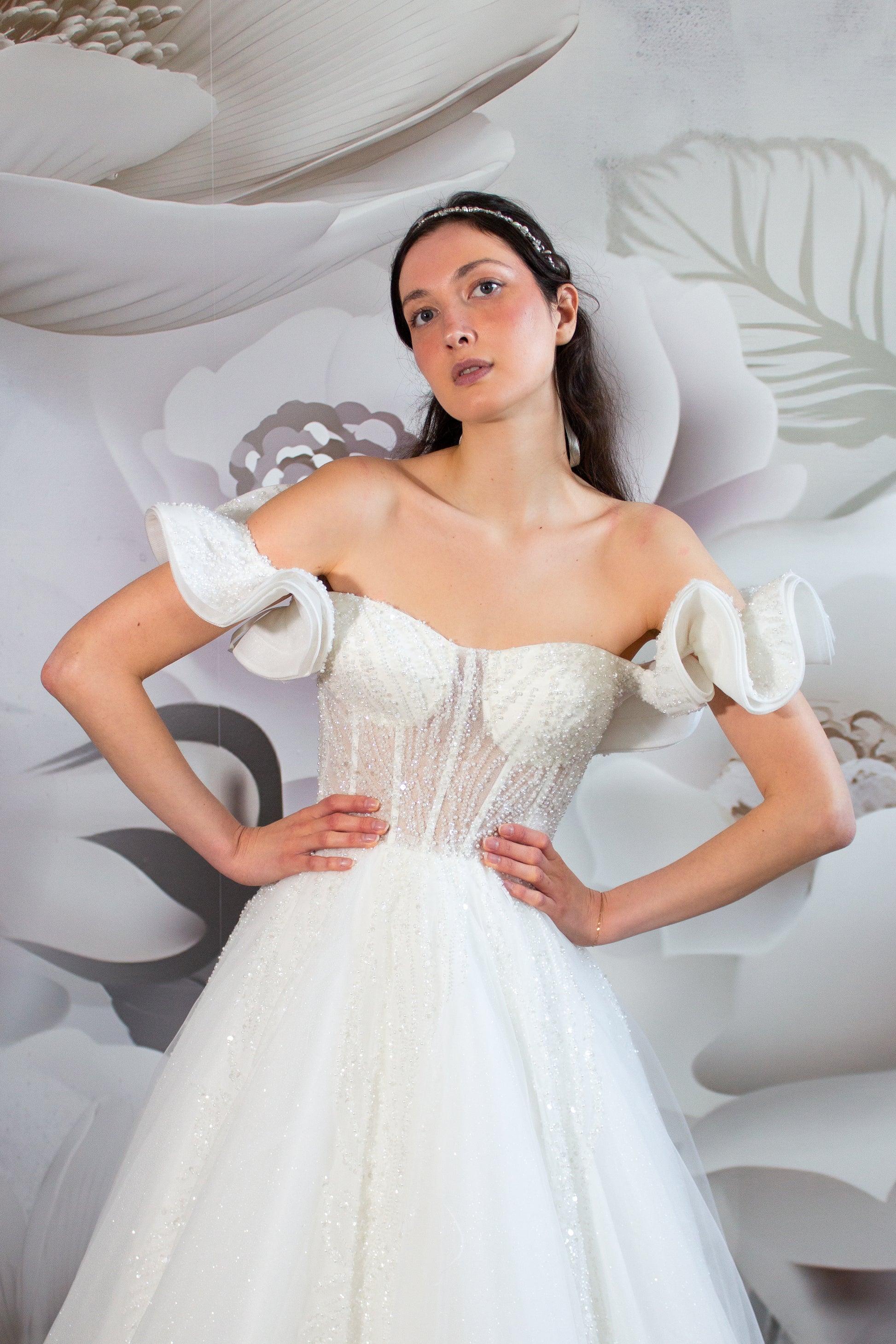 Add a touch of elegance to your wedding day with our CORRINE Wedding Gown with off the shoulder accents. This stunning piece features an off-shoulder style and a corset bodice adorned with hand sewn embellishments. The full tulle skirt adds a fairytale-like charm to your look, while sparkling accents throughout the dress catch the light with every step you take. Perfect for the modern bride who wants to feel like a princess on her special day.
