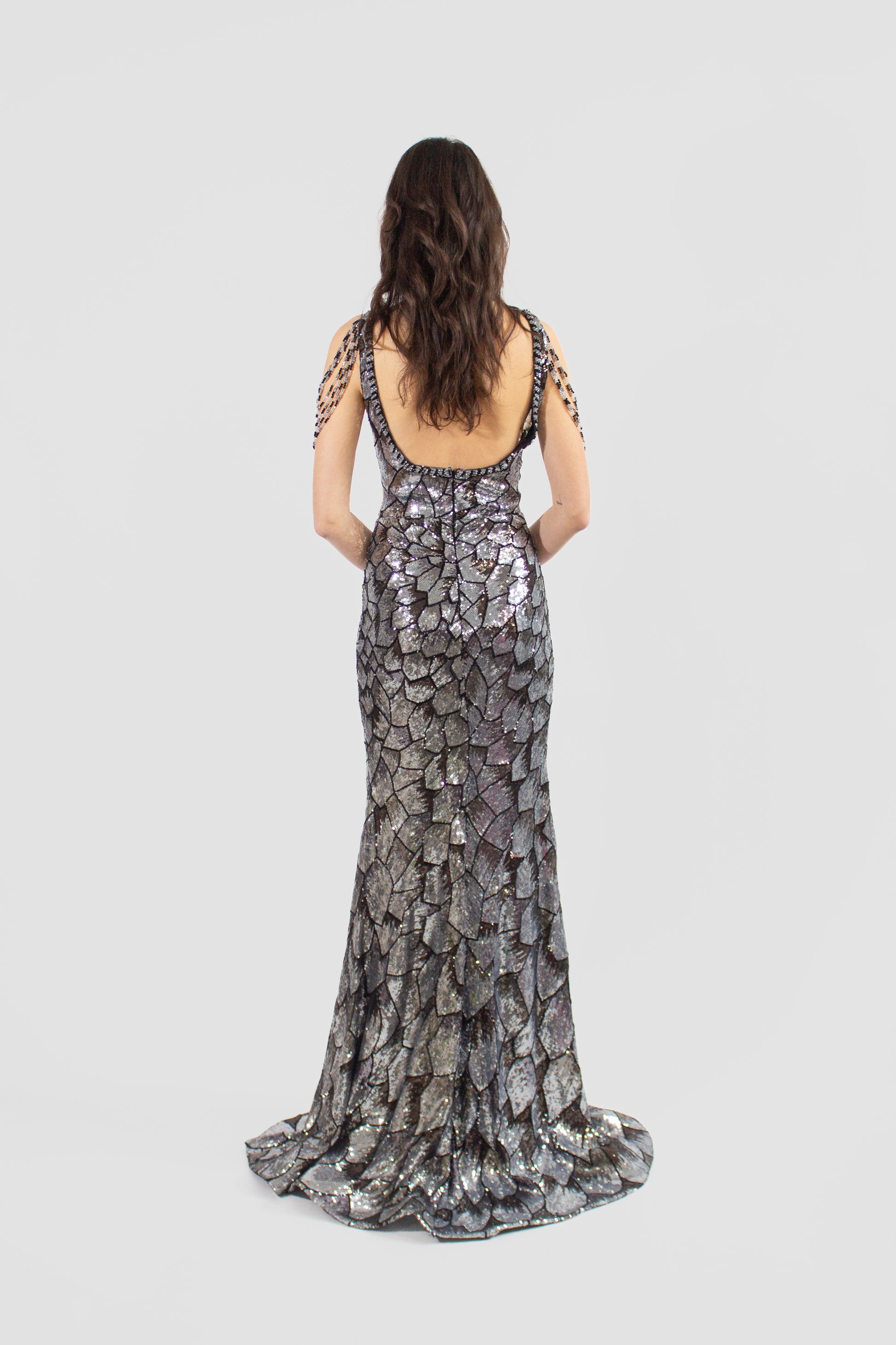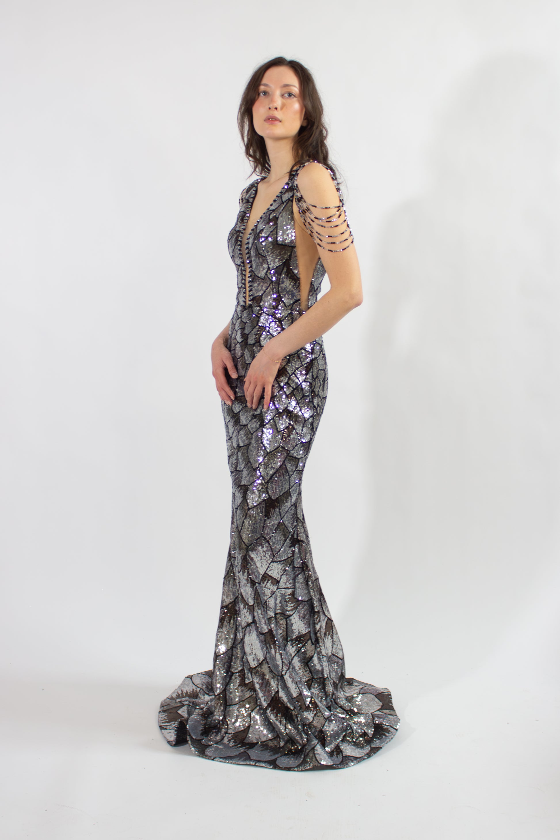 Step into the spotlight with our dazzling Sequin Mermaid Gown. Feel the allure of the night as you shimmer in silver and black tones that catch every glance. This floor-length gown is the epitome of sophistication, blending the enchantment of sequins with the captivating style of a mermaid fit.