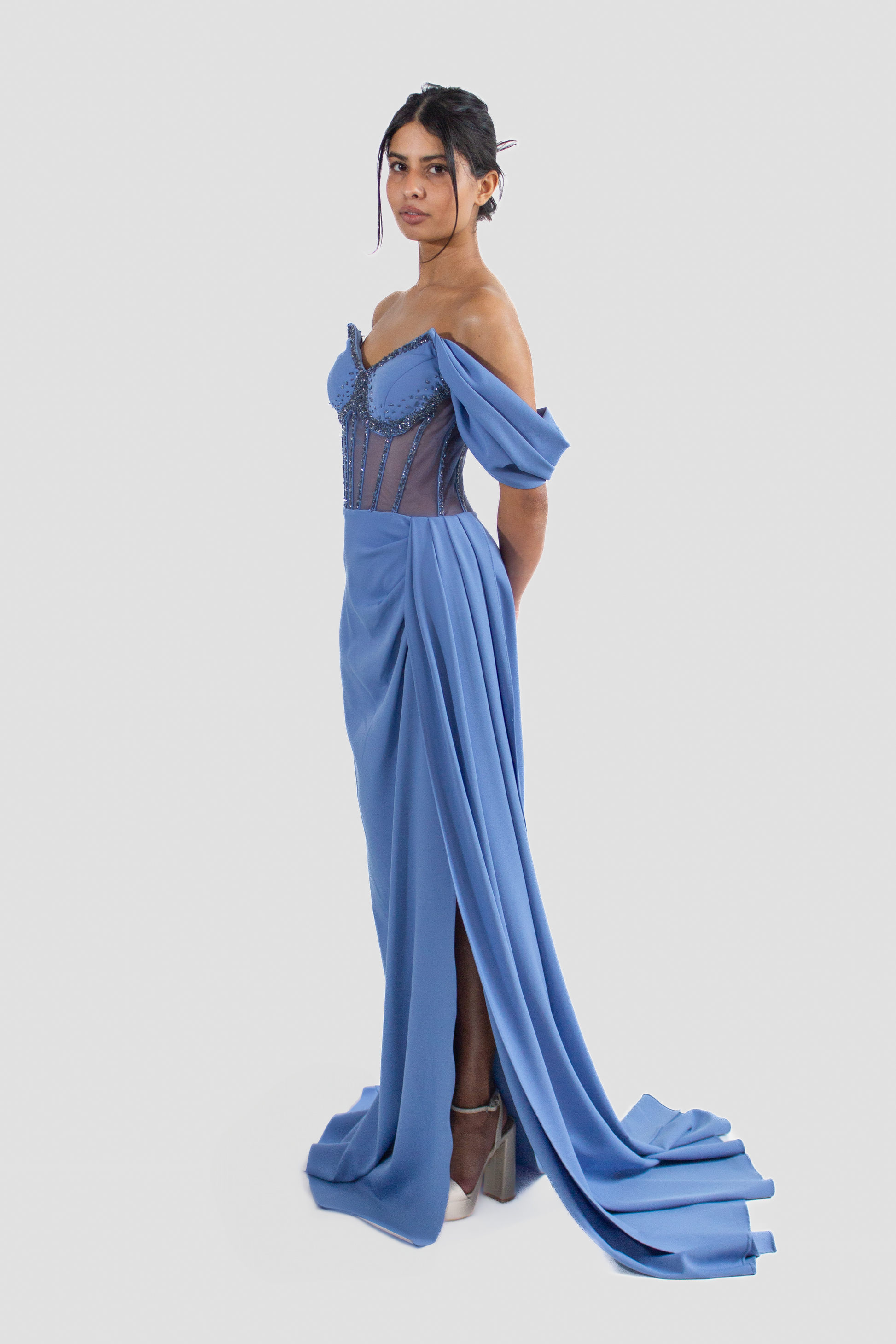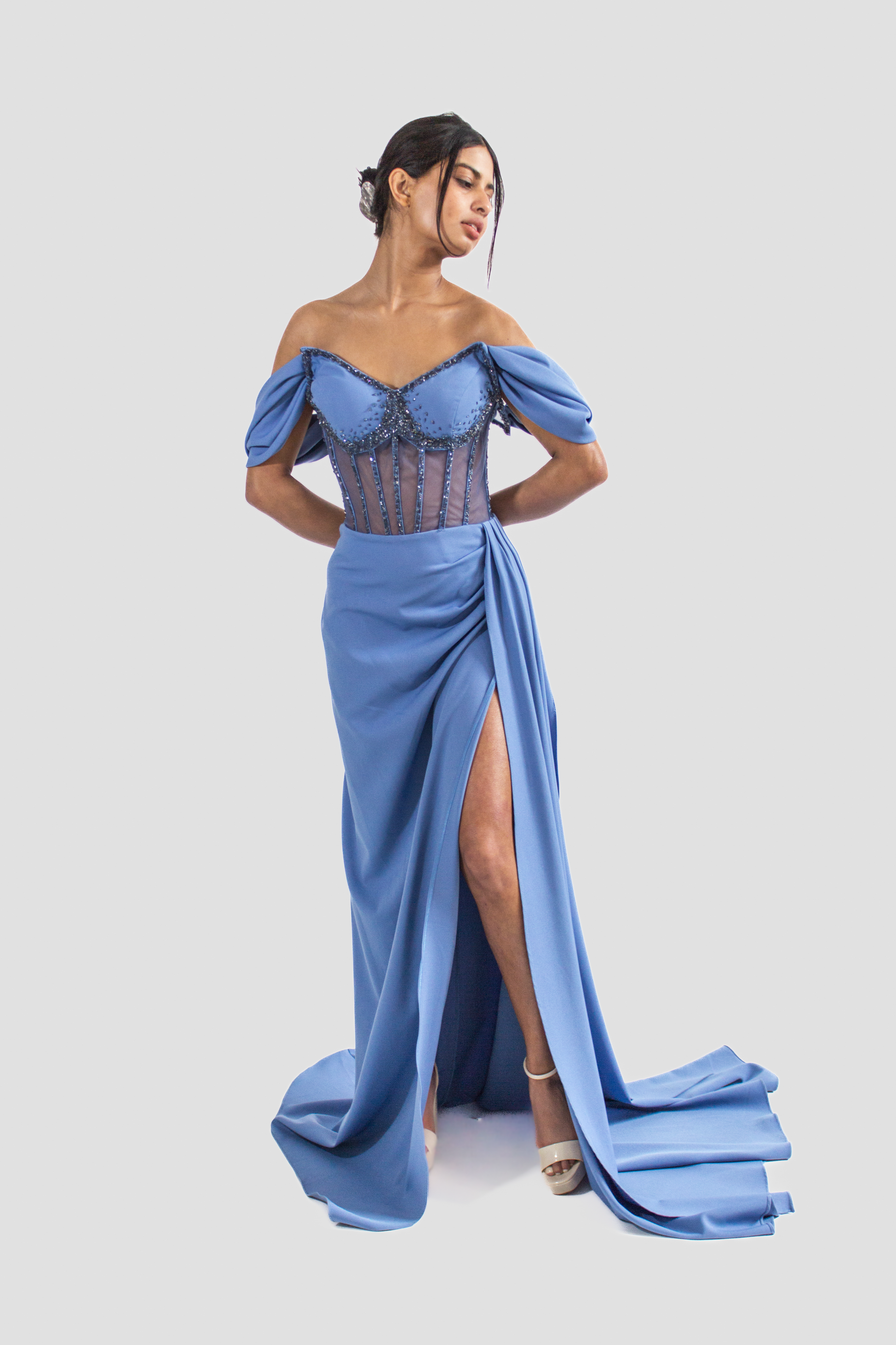 The draped skirt with a slit adds a touch of allure, making it a perfect choice for special events and formal occasions.