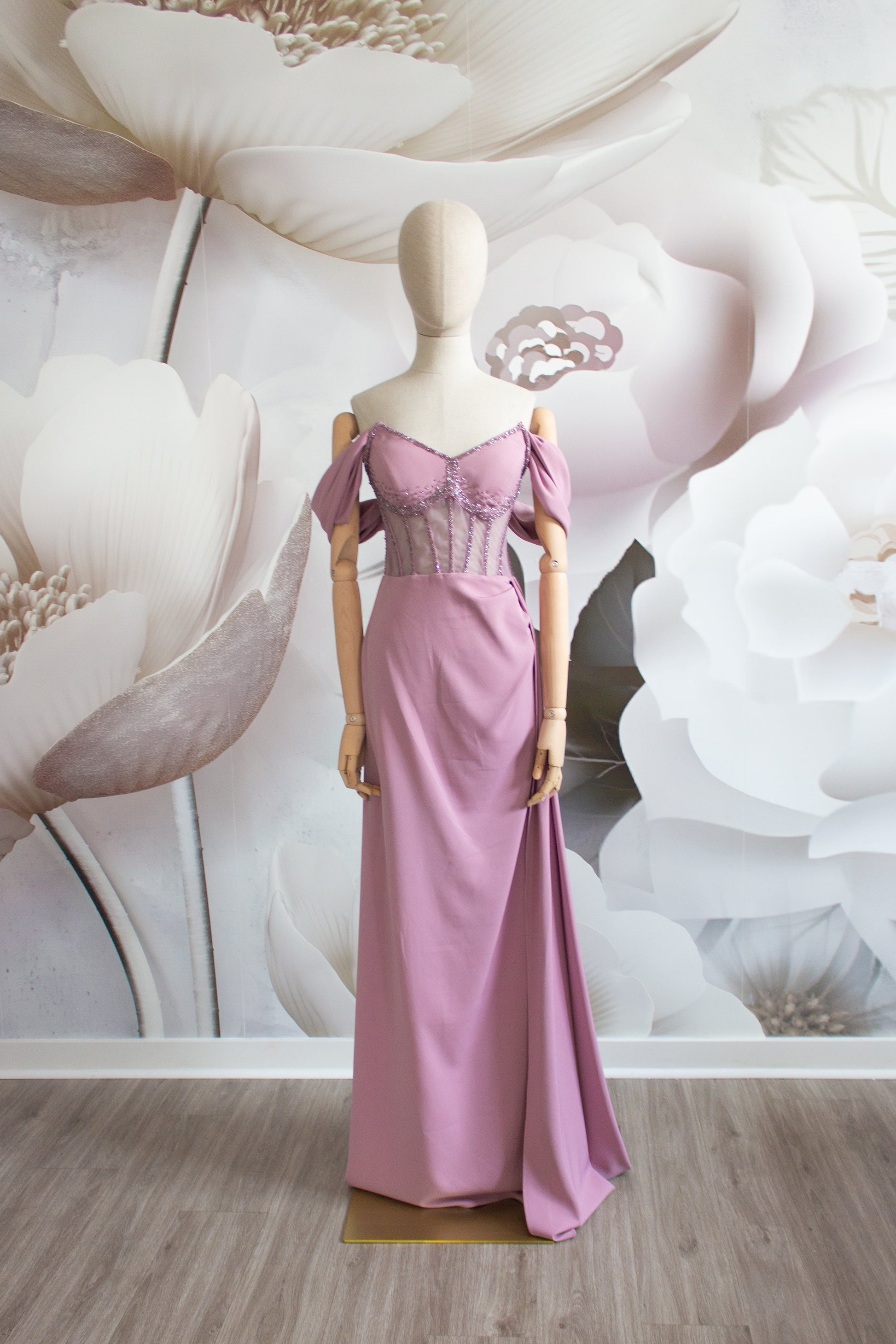 This floor-length dress boasts an elegant off-shoulder style that accentuates your shoulders and neckline with grace.