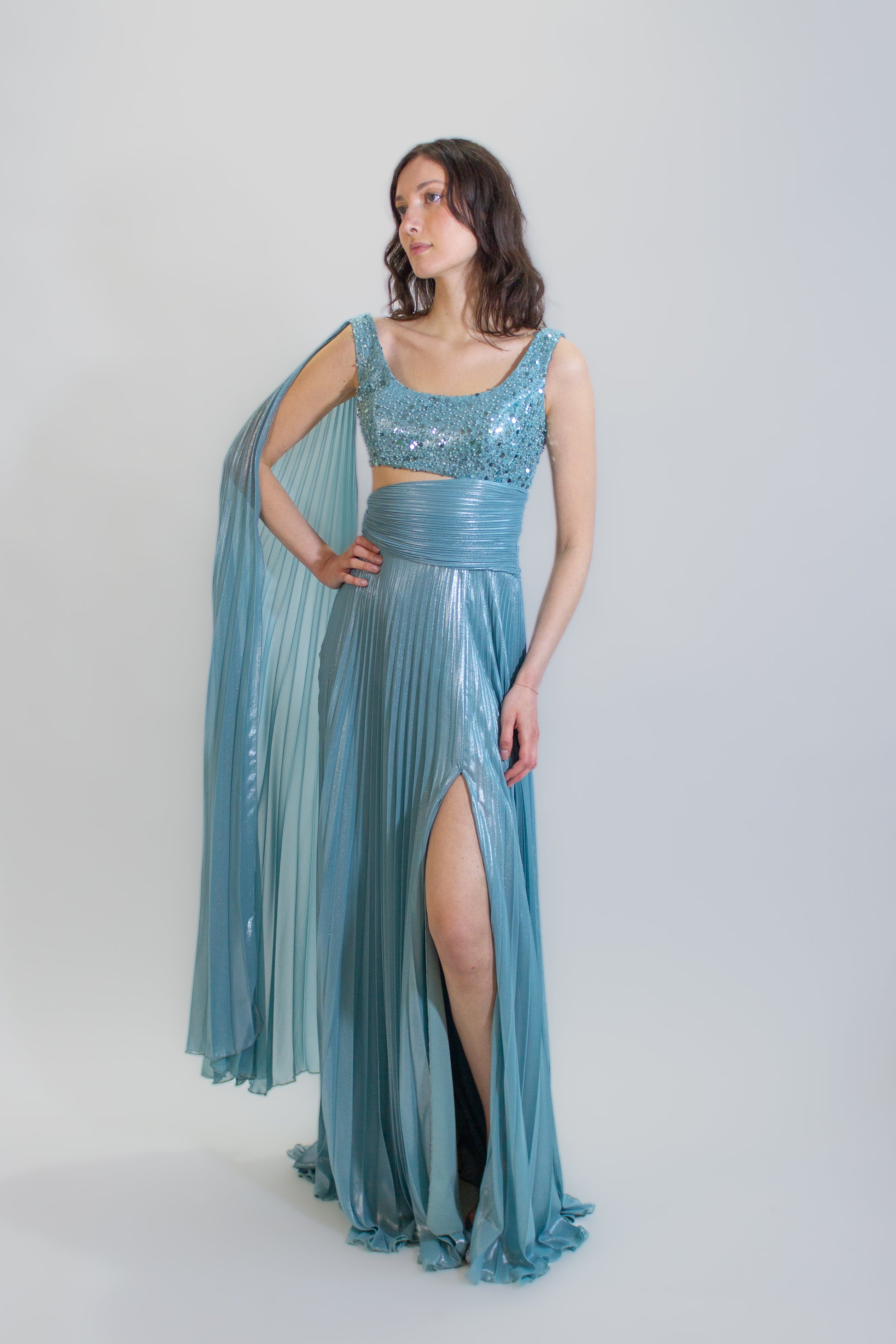Step into the spotlight with our Elegant Sequin Evening Gown. This stunning dress exudes sophistication and glamour, perfect for any special occasion. The sequin top adds a touch of sparkle, while the pleated skirt flows elegantly with your every move. With a high slit on one side and a sleeveless design, this gown is both stylish and comfortable.