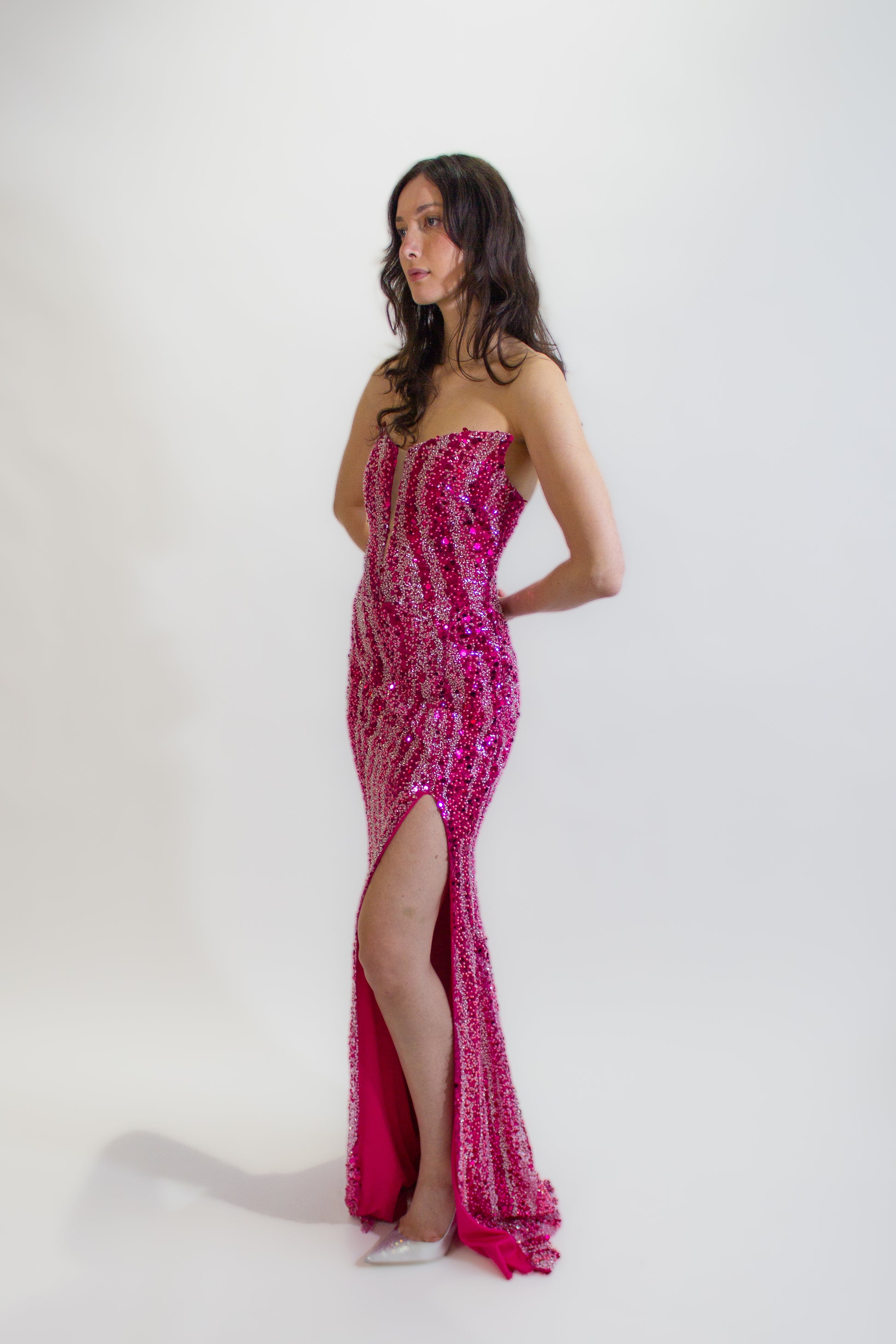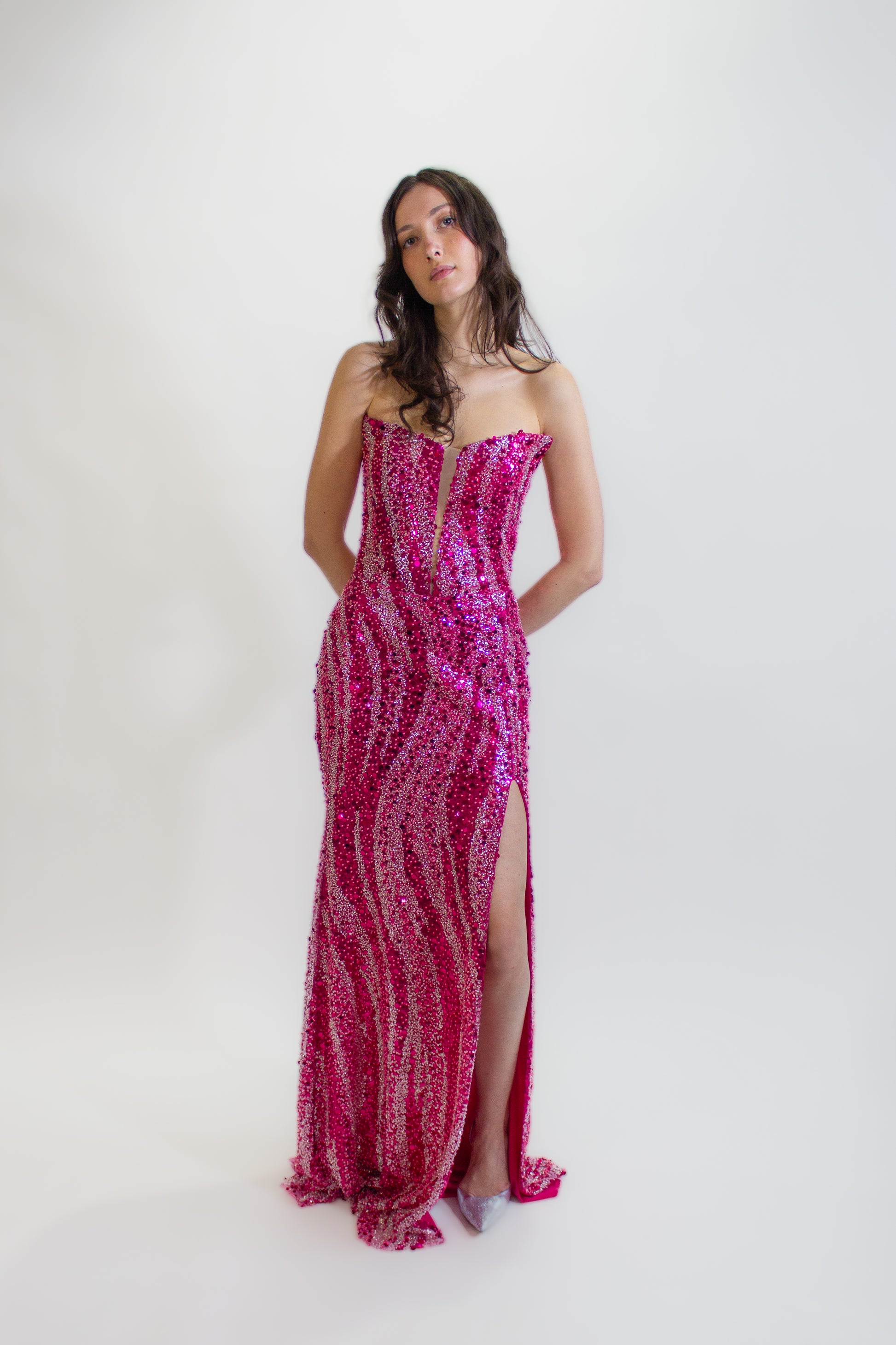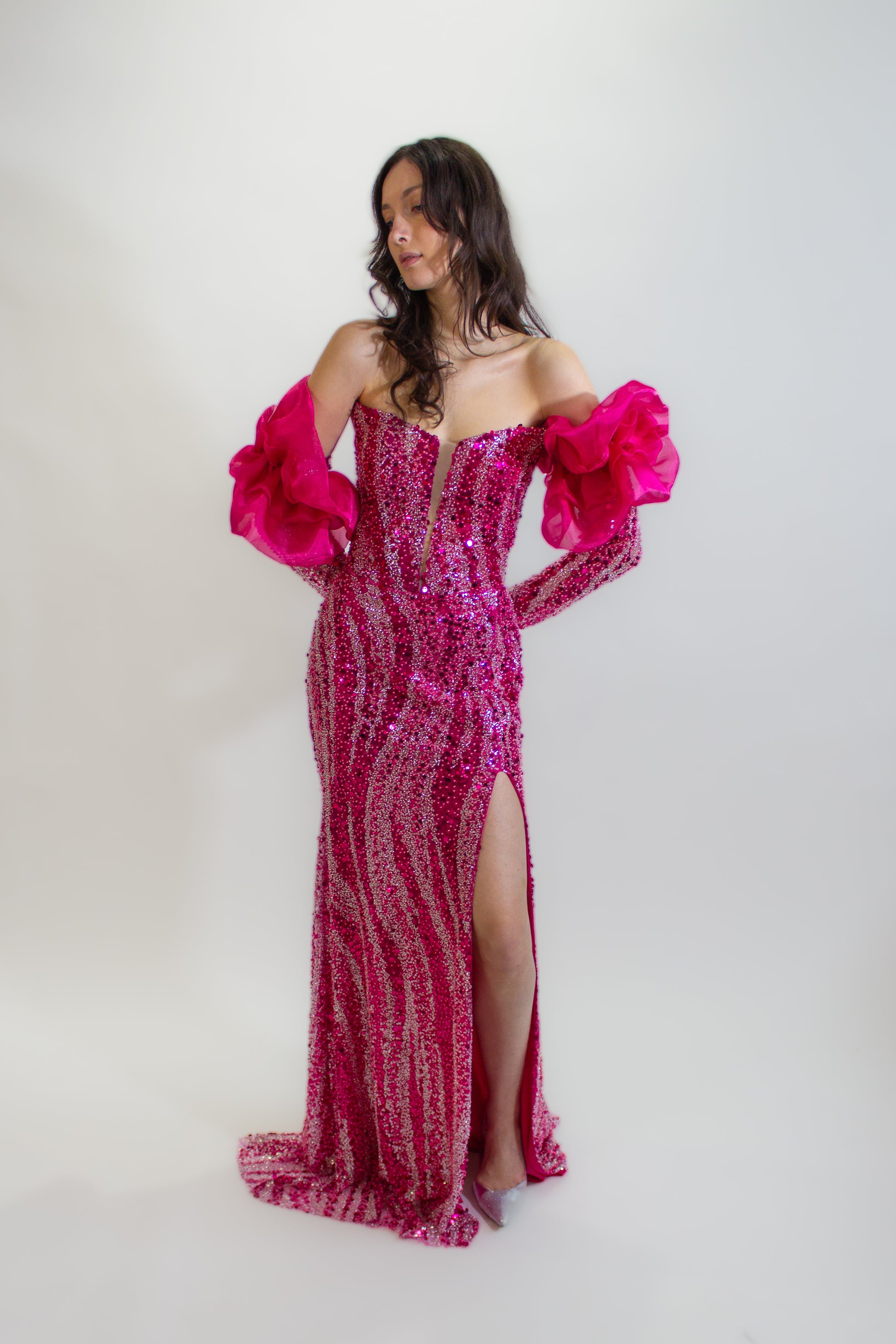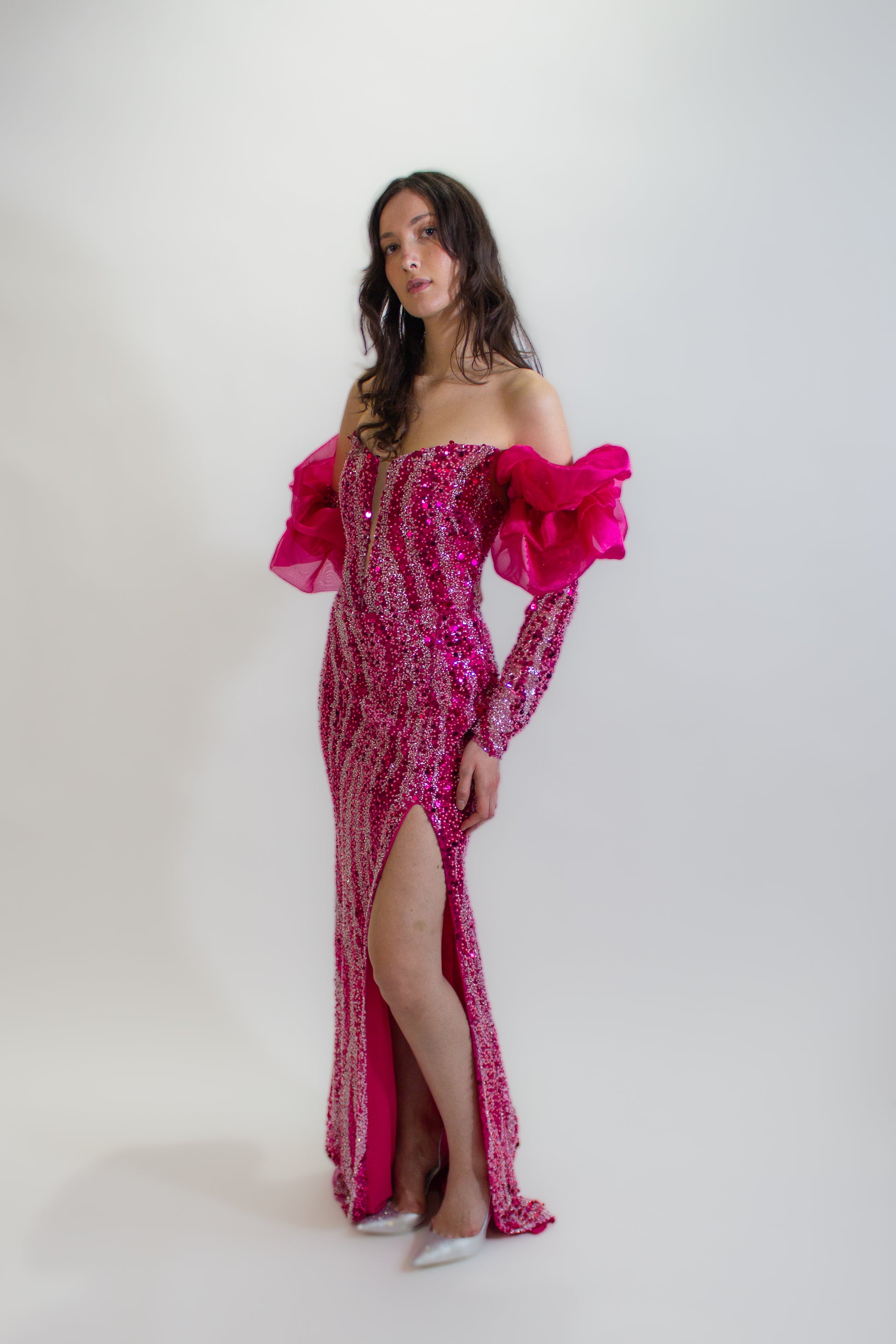 Elevate your style with our one-of-a-kind pink sequined gown, designed for exclusivity and sophistication.