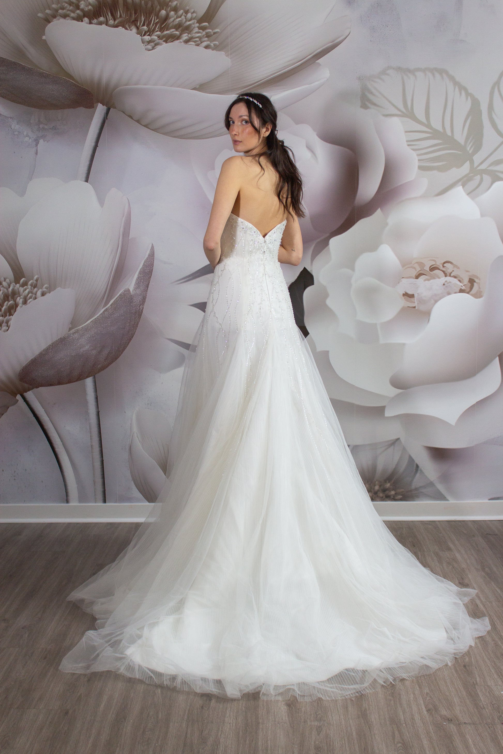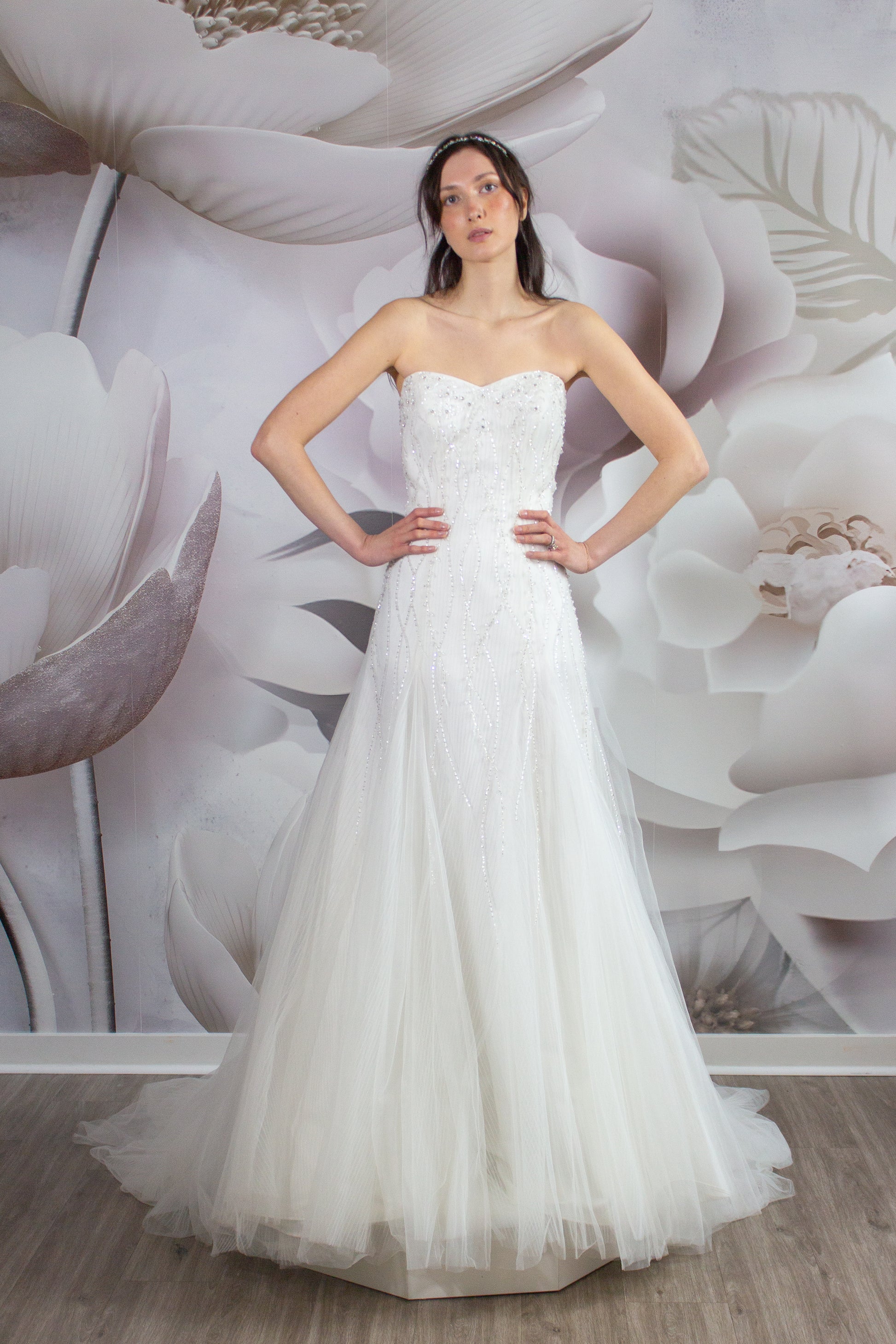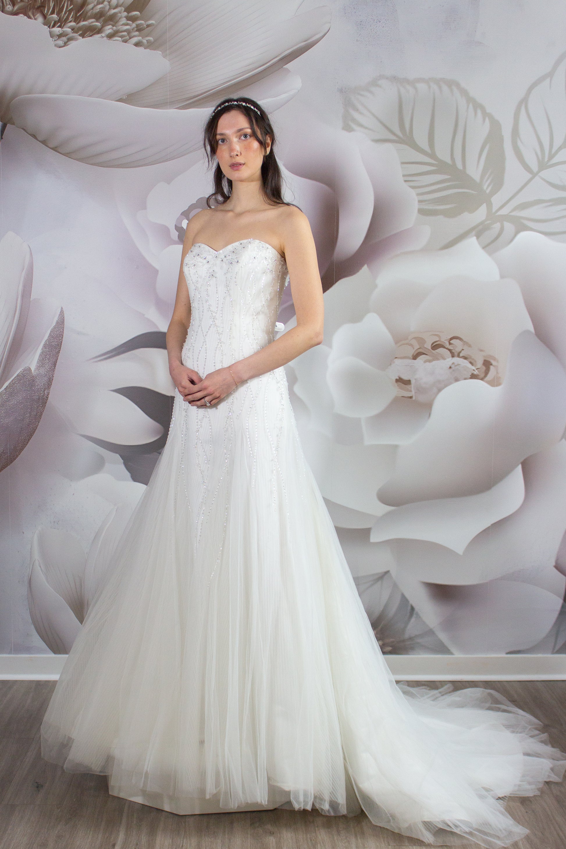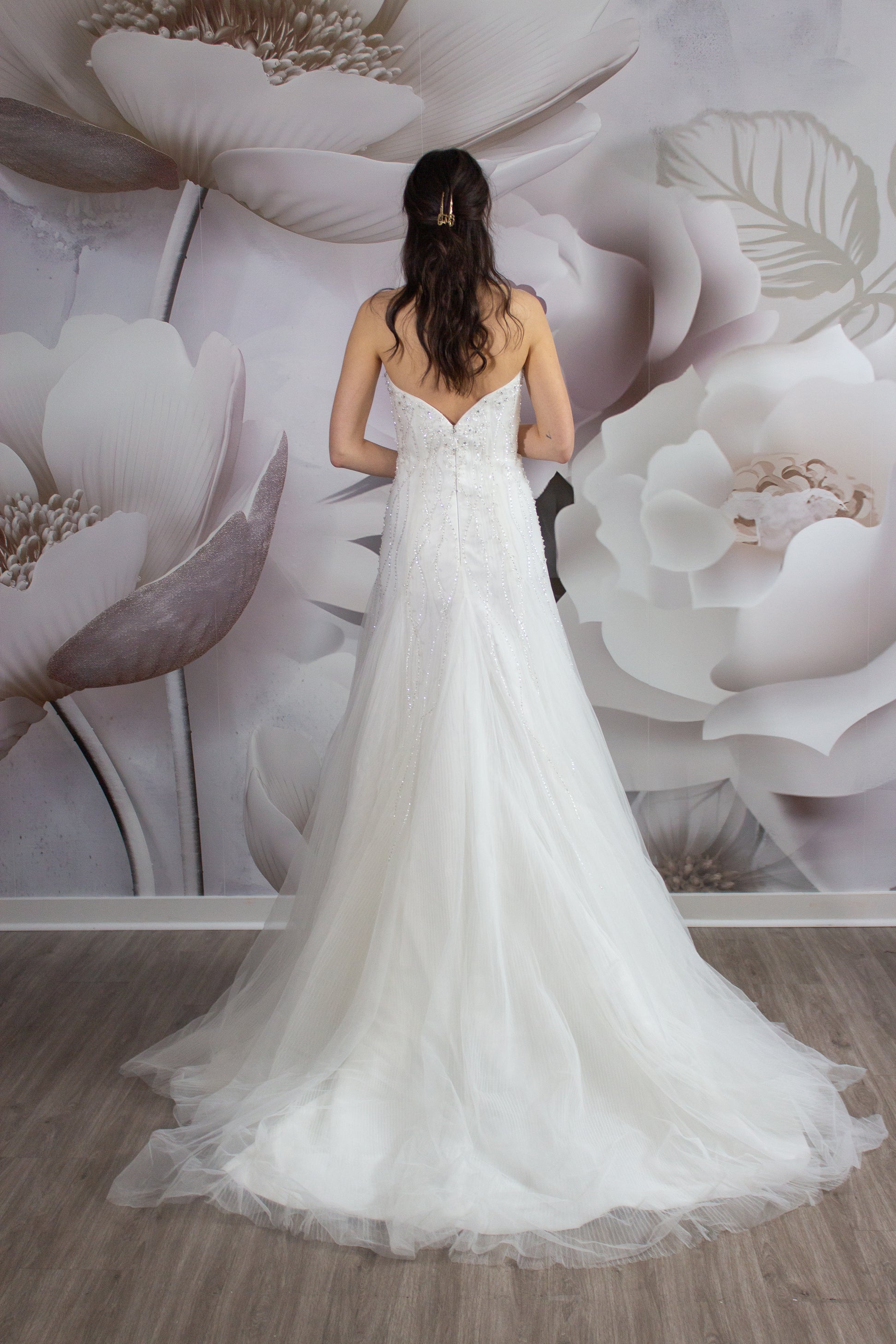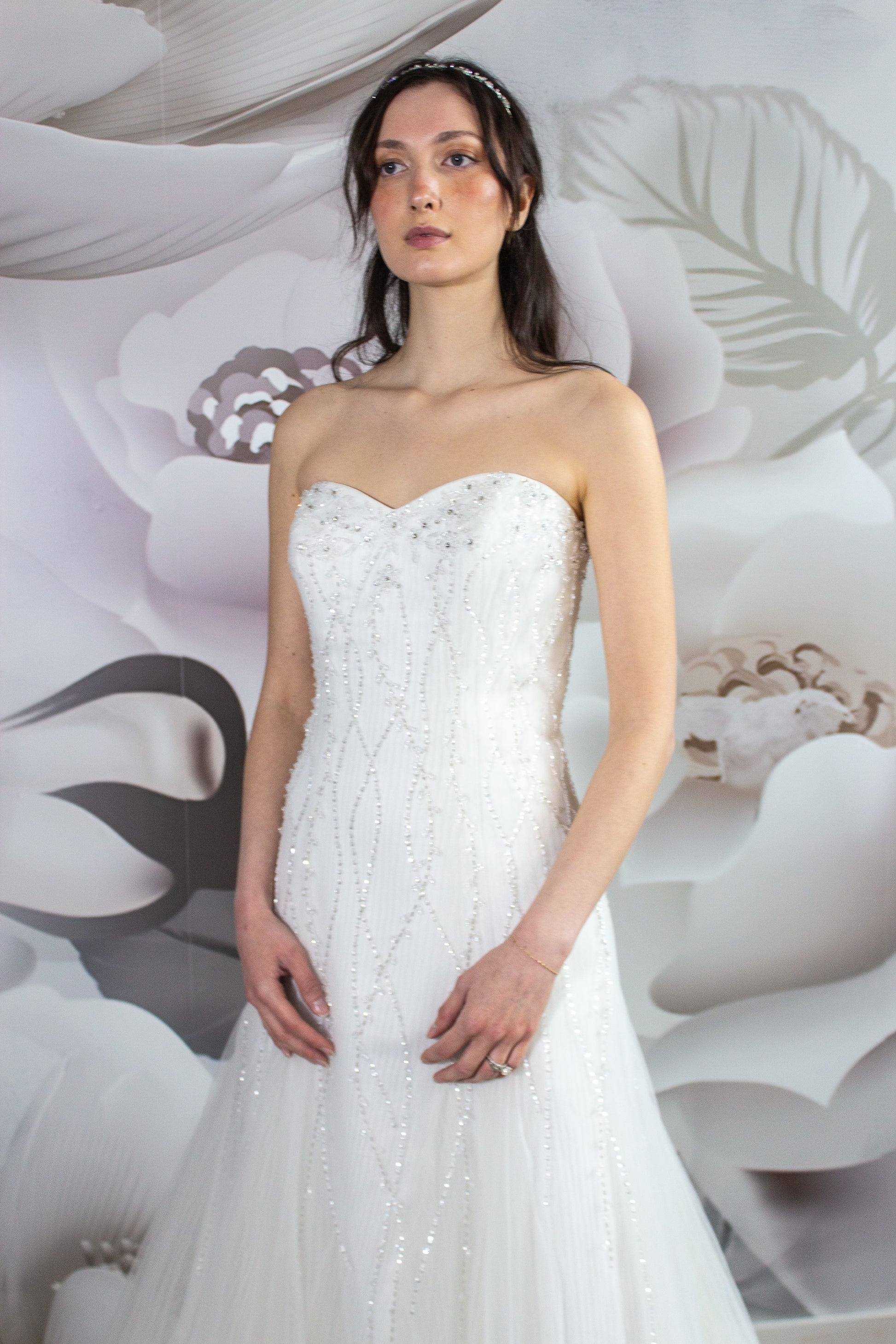 Exclusively available only in sample size, the ERYNN Bridal Gown showcases a stunning design featuring a strapless corset bodice adorned with intricate hand sewn beadwork and sequins. The A-line skirt, crafted in tulle , flows gracefully to full length, adding a touch of ethereal beauty to your bridal look.