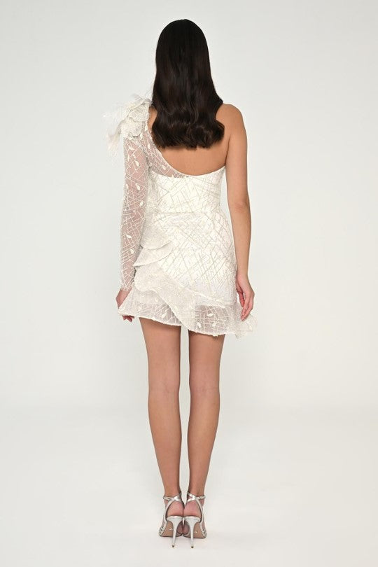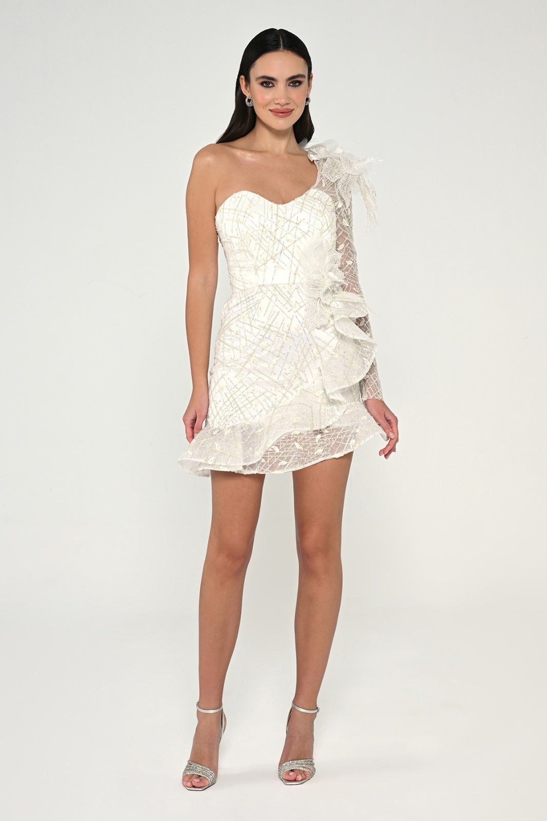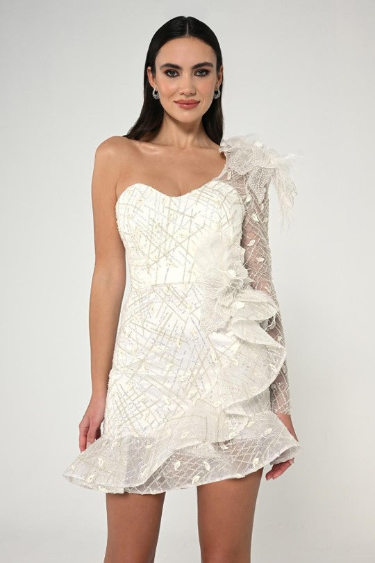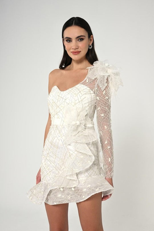 This elegant one-shoulder white mini dress is a true showstopper, perfect for special occasions that call for modern sophistication. The design features a single sheer lace sleeve adorned with intricate floral appliqués, creating a striking balance between timeless elegance and contemporary style. The fitted bodice beautifully accentuates the silhouette, while cascading ruffles and shimmering geometric patterns add a touch of glamour. Ideal for bachelorettes, engagement celebrations, or bridal showers, this dress promises to leave a lasting impression. Pair it with strappy heels and understated jewelry to complete the look.