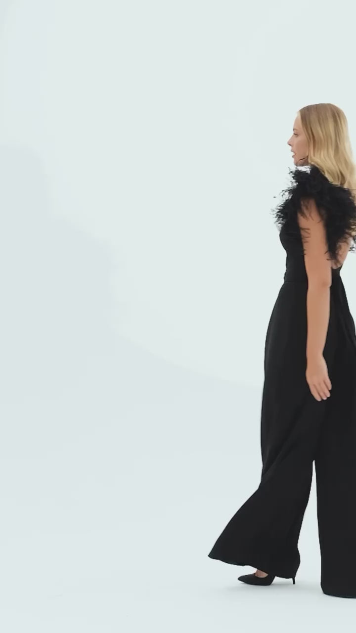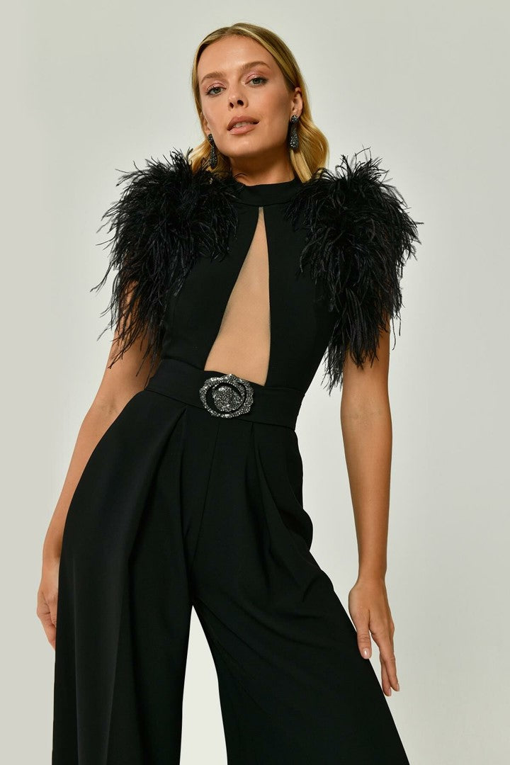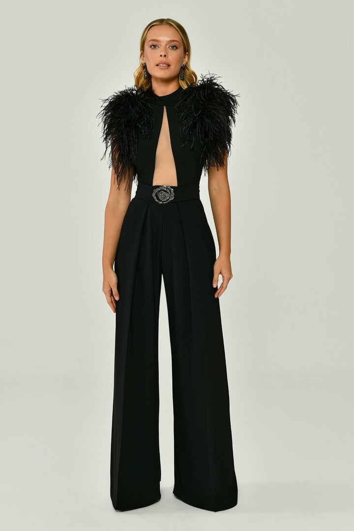 Introducing NOVA! Our Faux Feather Detailed Wide Leg Jumpsuit: a striking blend of glamour and uniqueness. Adorned with faux feather embellishments delicately gracing the shoulders, this jumpsuit exudes luxury and individuality. The wide-leg silhouette elongates the legs for a flattering look, while its distinct design sets you apart.