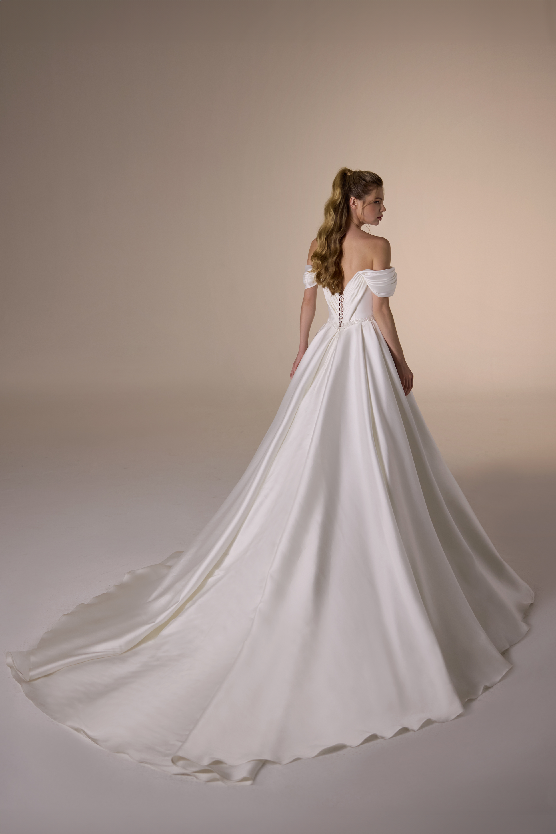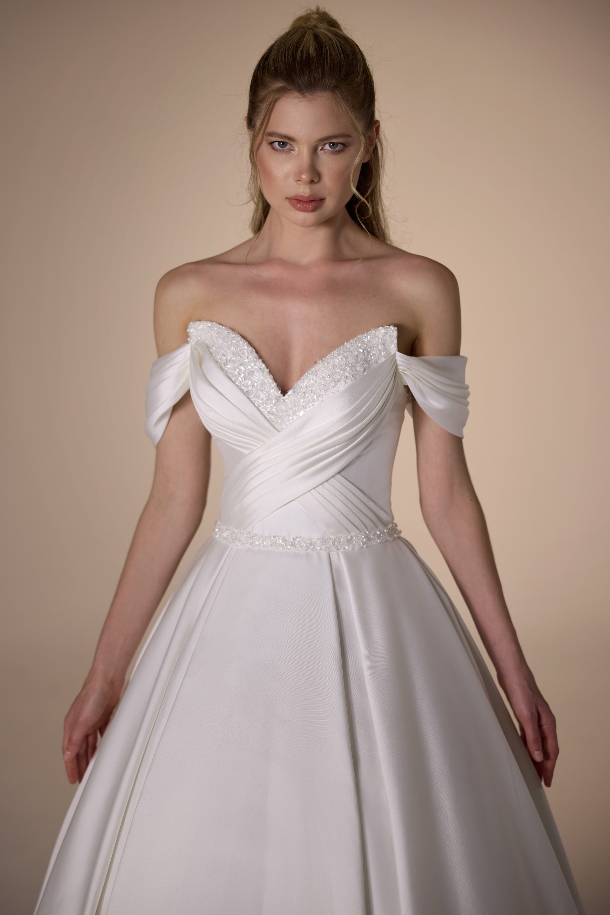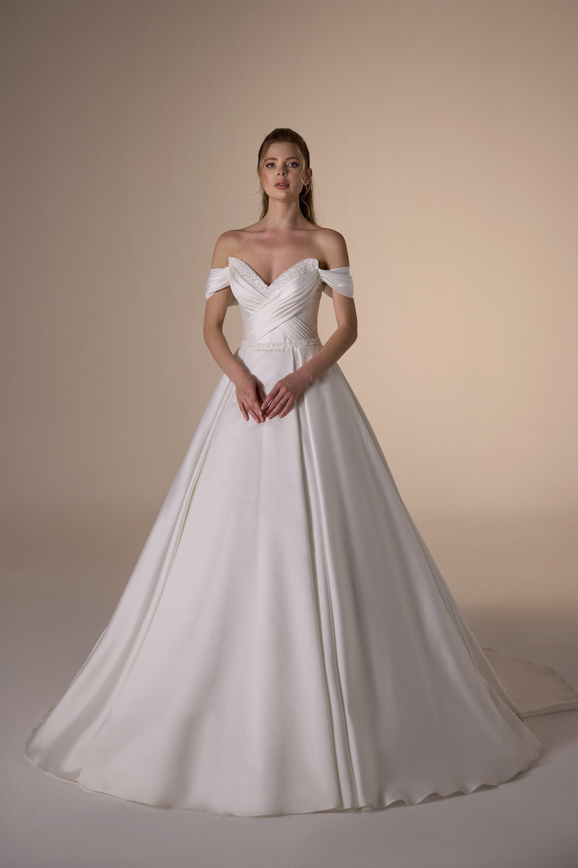 The off-the-shoulder style paired with a sweetheart neckline creates a romantic appeal, while the pleated bodice adds a touch of whimsical beauty. Crafted from luxurious glossy fabric, the full-length ballgown skirt cascades elegantly for a truly regal look.