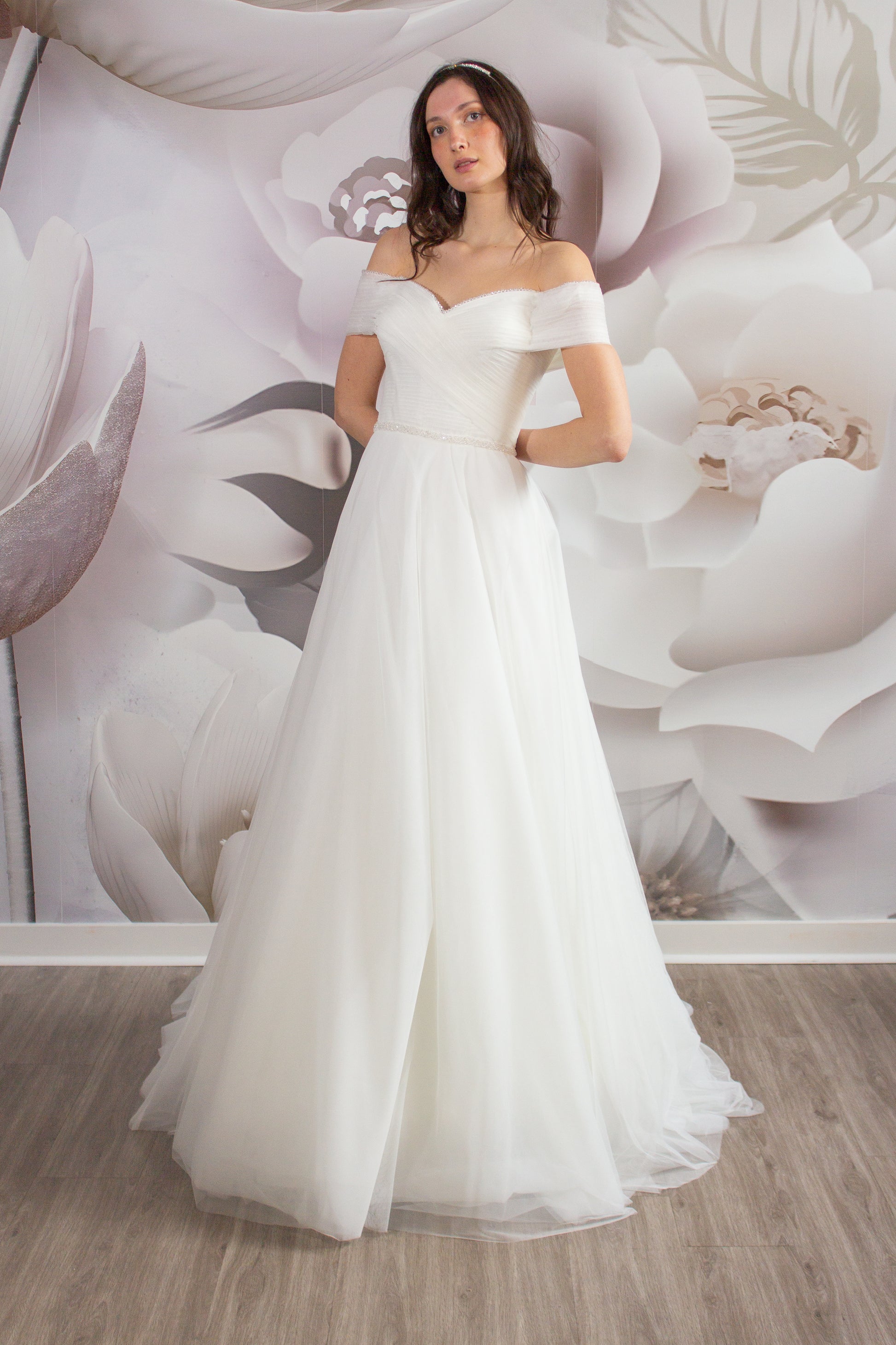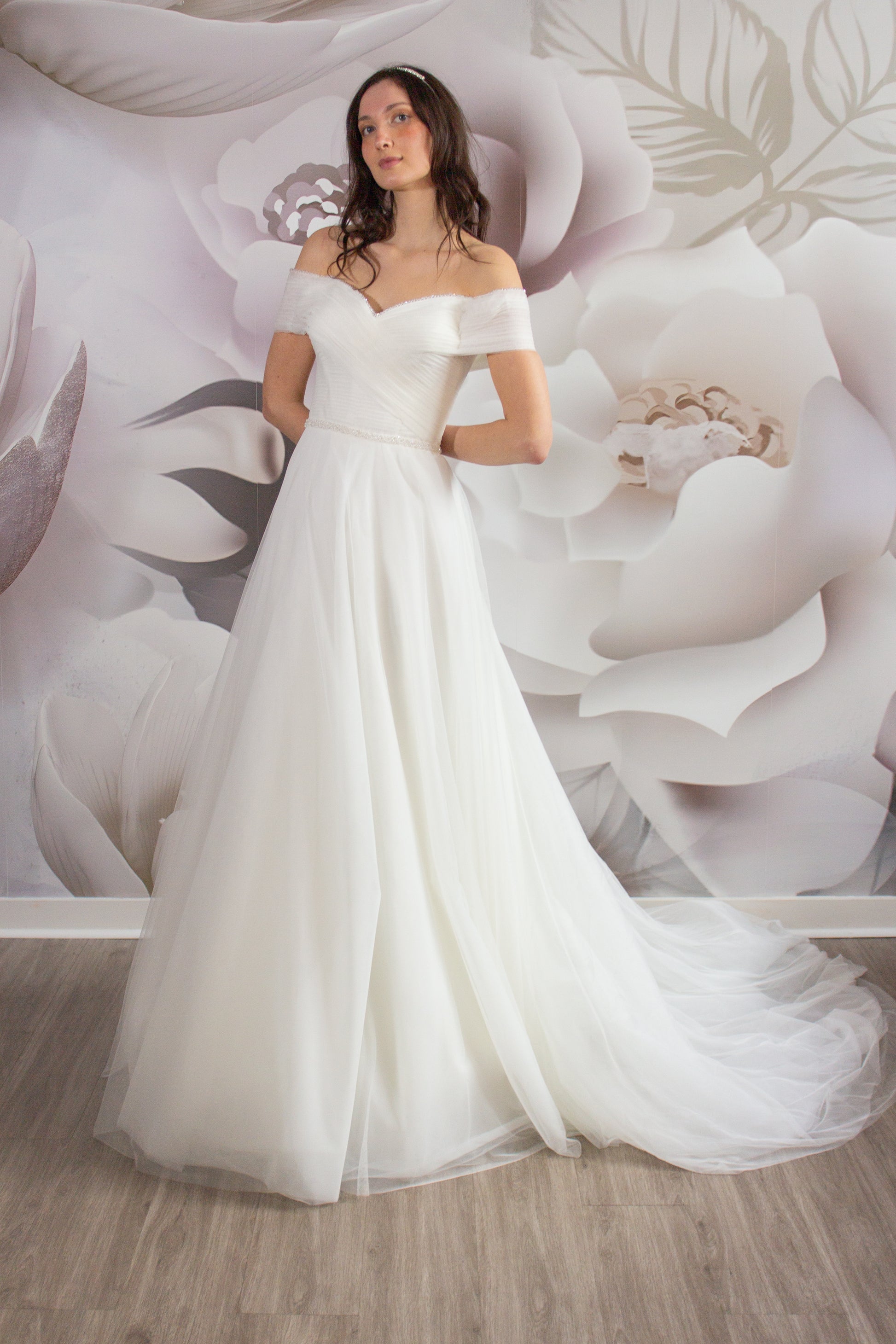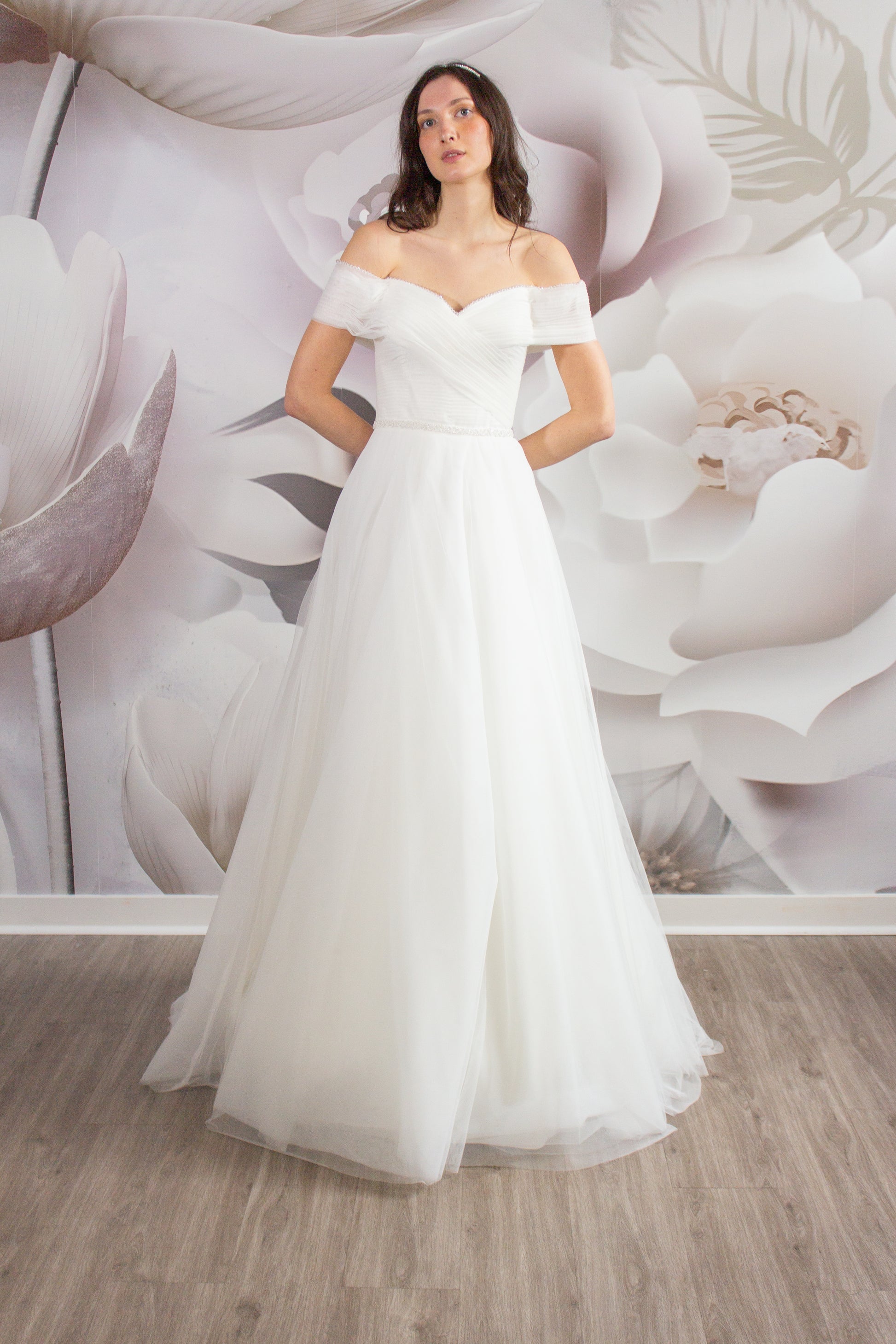 Embrace the sophistication and allure of the HAZEL wedding gown. Featuring an A-line silhouette, the gown boasts off-the-shoulder straps that delicately frame the neckline. The sweetheart neckline enhances the romantic look, while the tulle fabric adds a touch of lightness and elegance.