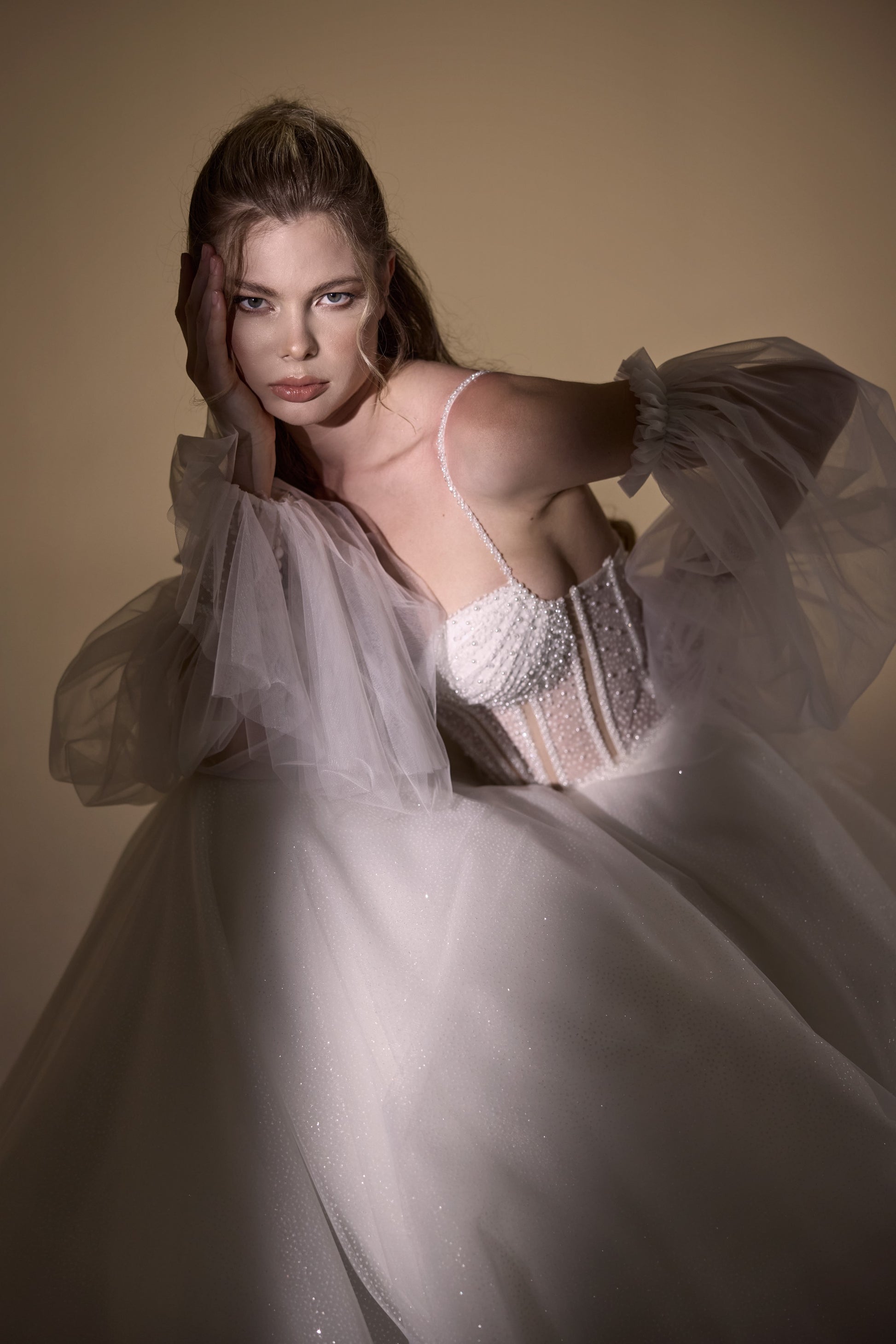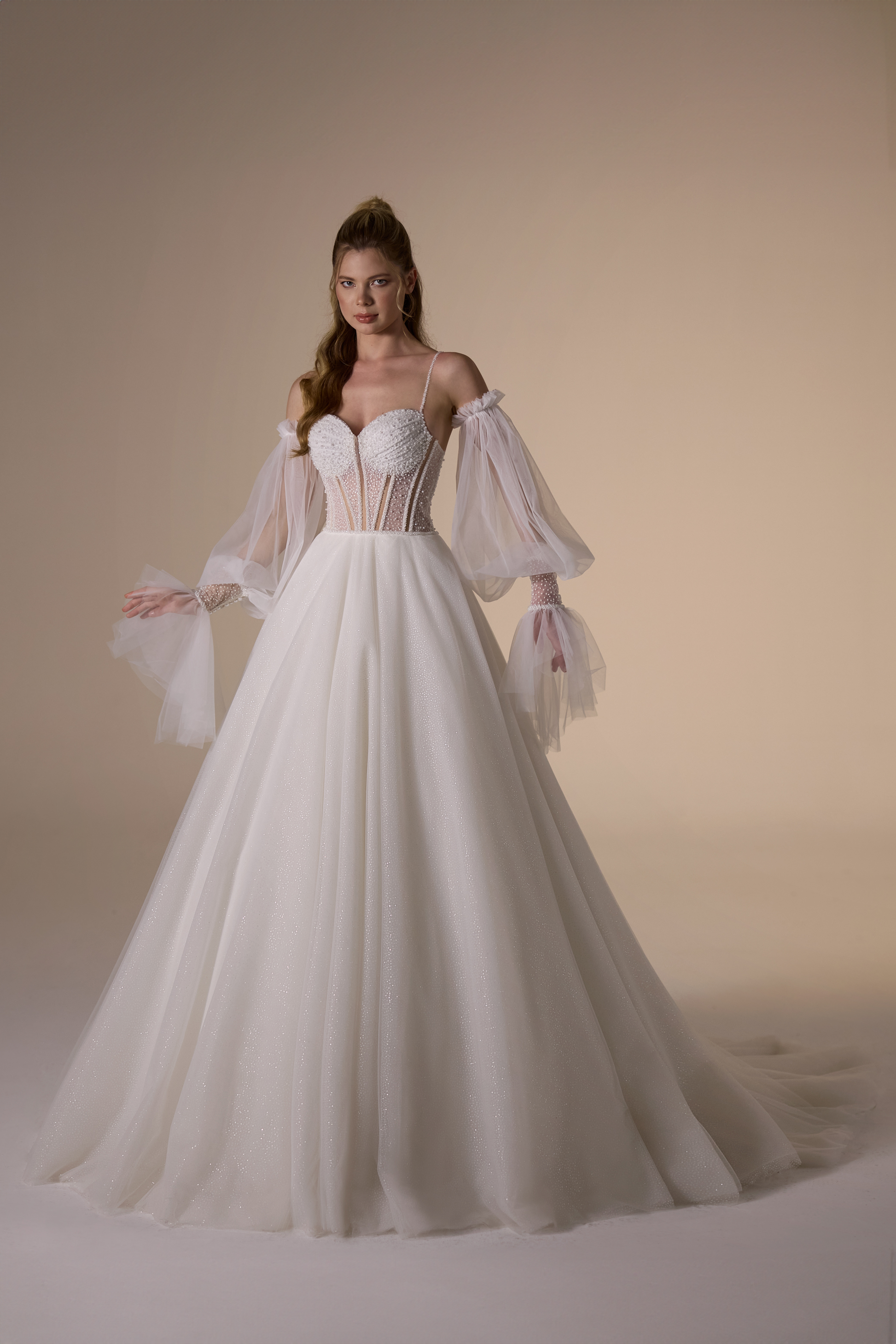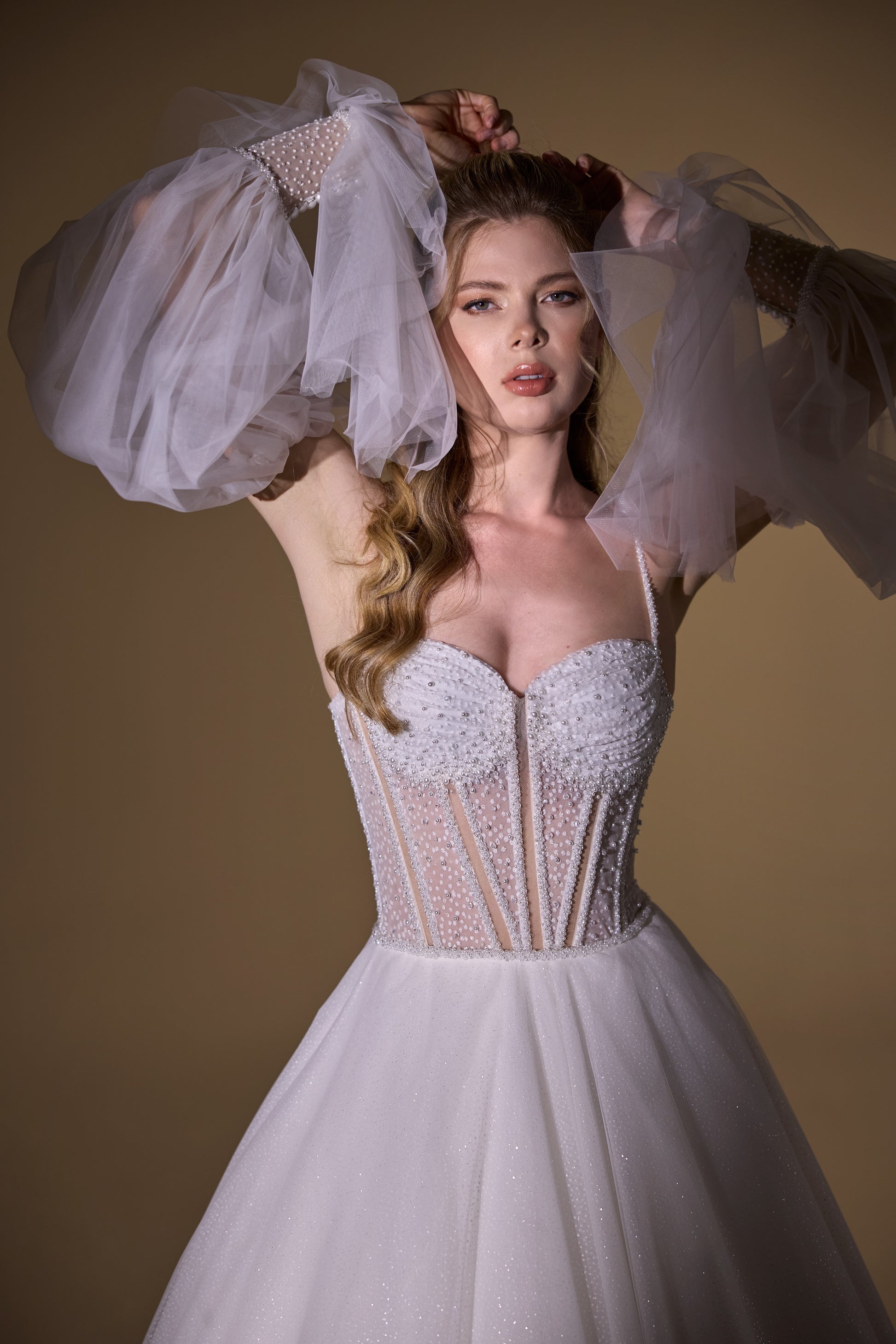 The corset bodice with a sweetheart neckline exudes romance, while the sheer removable puff sleeves adorned with pearls or beaded accents add a touch of elegance. The A-line skirt, layered with tulle and glitter or sparkle detailing, creates a dreamy and enchanting look that will captivate all eyes.
