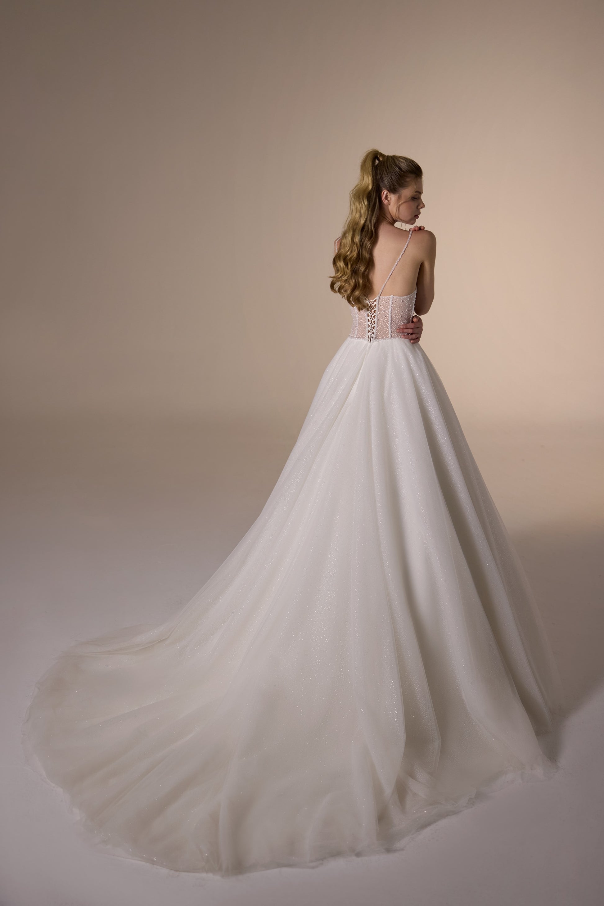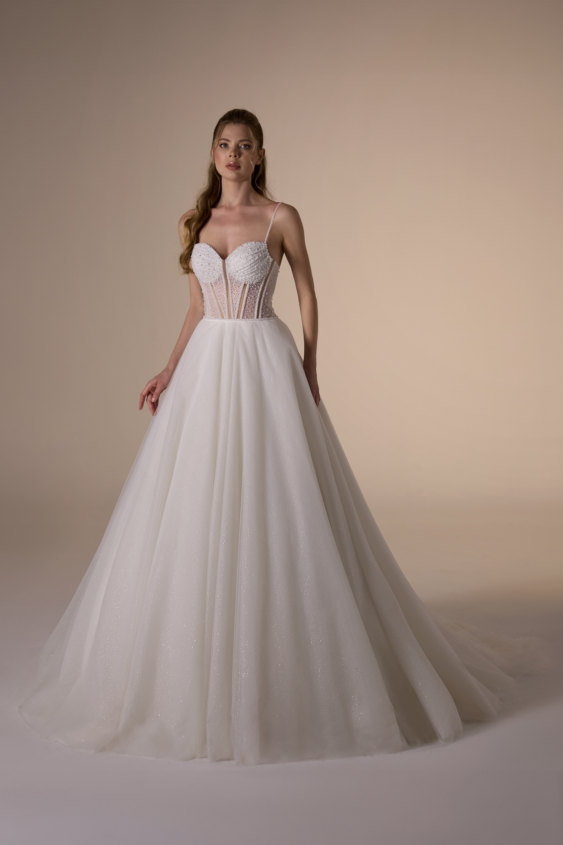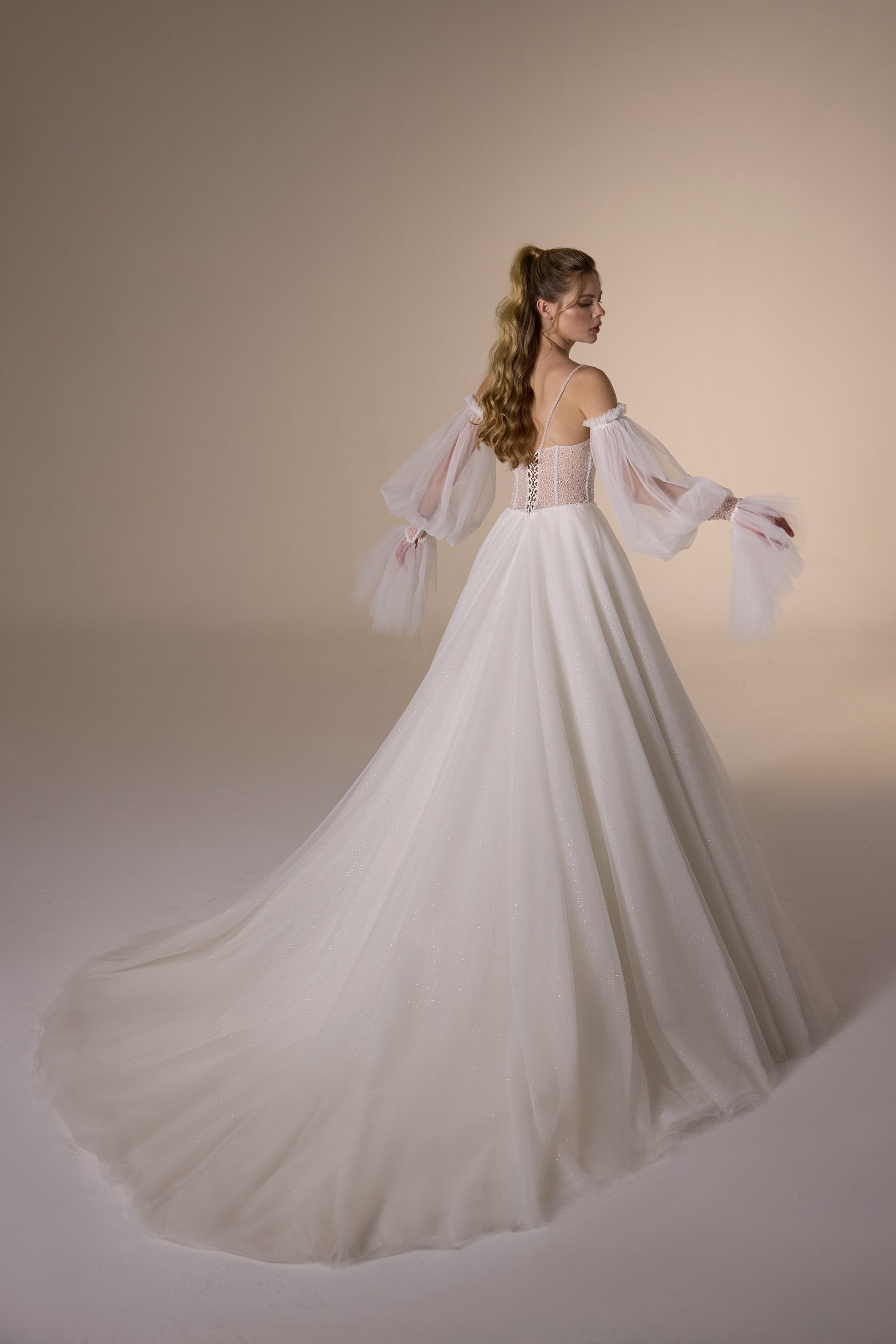 The corset bodice with a sweetheart neckline exudes romance, while the sheer removable puff sleeves adorned with pearls or beaded accents add a touch of elegance. The A-line skirt, layered with tulle and glitter or sparkle detailing, creates a dreamy and enchanting look that will captivate all eyes.
