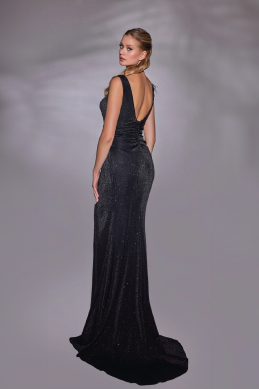 Radiate elegance in this stunning V-neck GISELLE gown, an ideal choice for formal occasions. Crafted from a comfortable and stretchy metallic knit, this dress subtly shimmers without the mess of glitter. It features supportive thick straps, a flattering silhouette, and a glamorous embellished floral detail on one shoulder. A stylish side slit adds a touch of allure and ease of movement. Make a sophisticated statement at your next evening event with this unique gown.