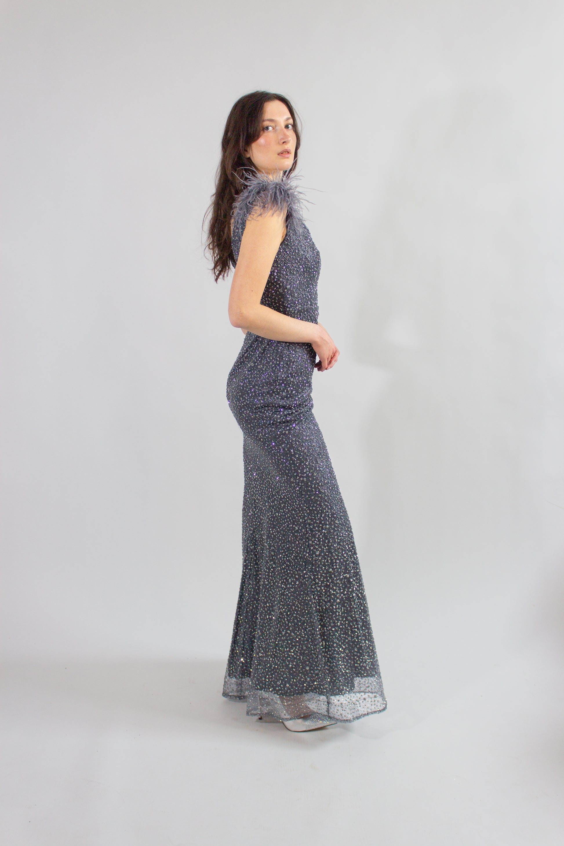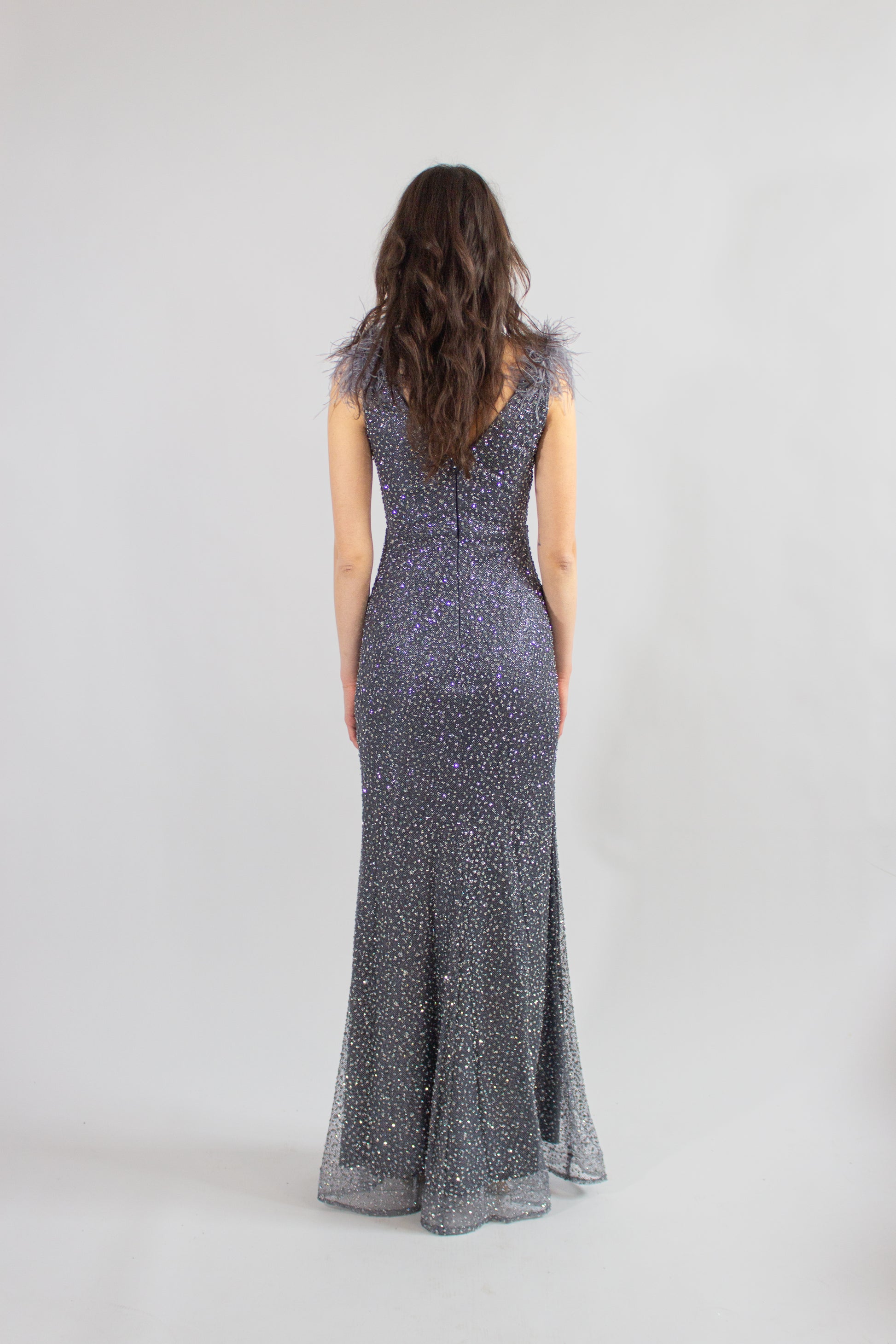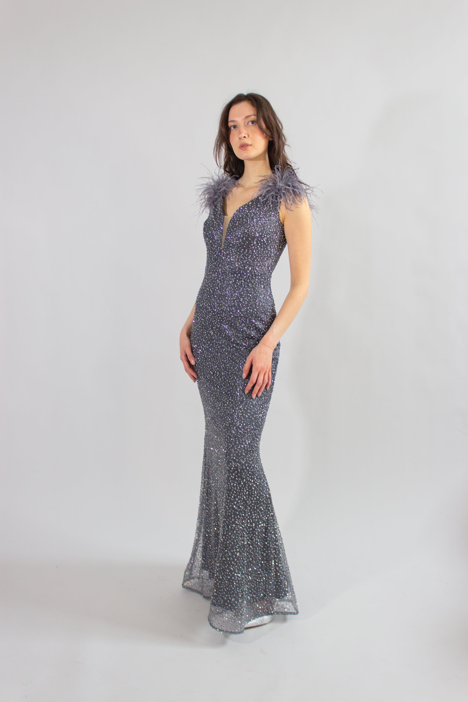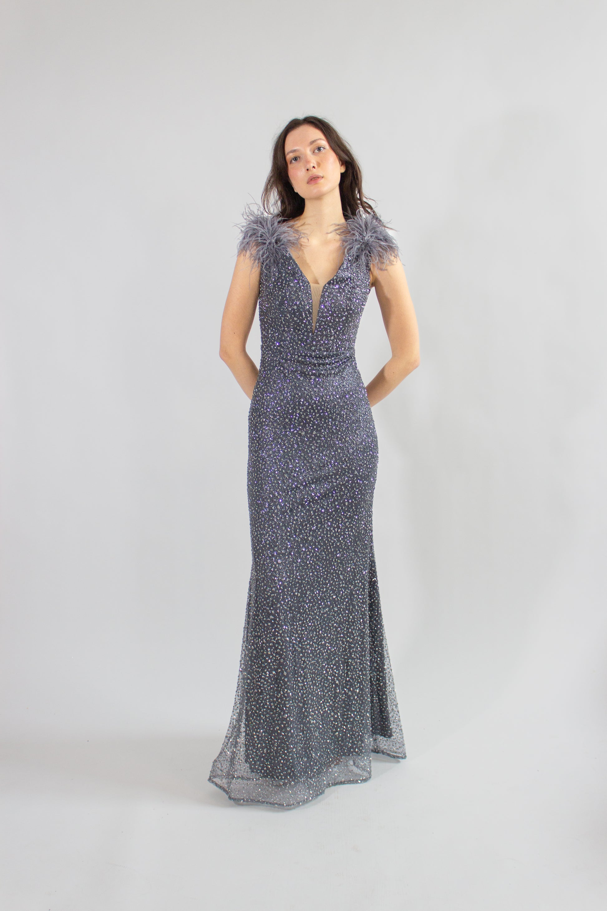Crafted with exquisite detail that glimmer with every move, this gown exudes glamour and sophistication. The feathered sleeves add a touch of whimsical charm, ensuring you stand out from the crowd.