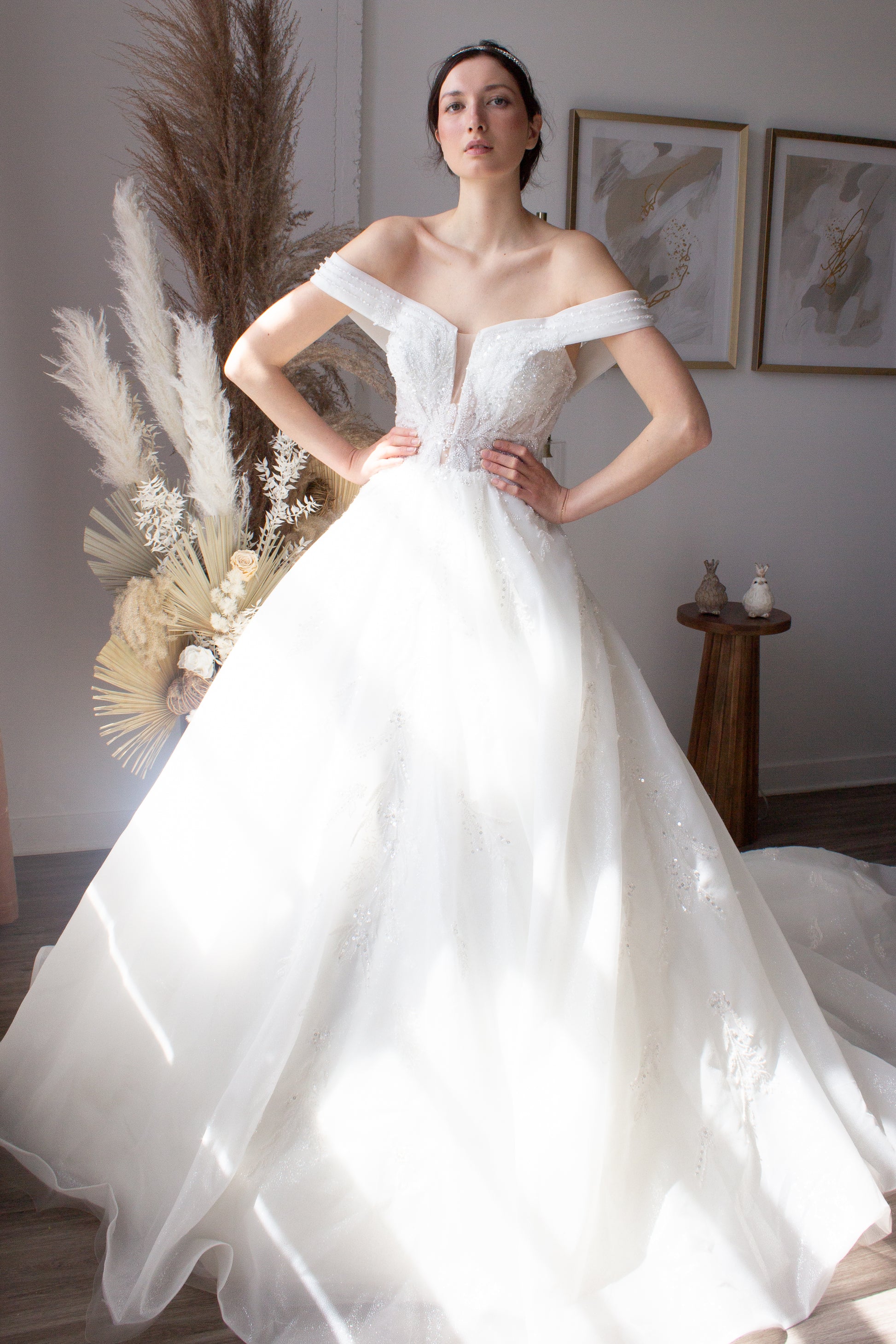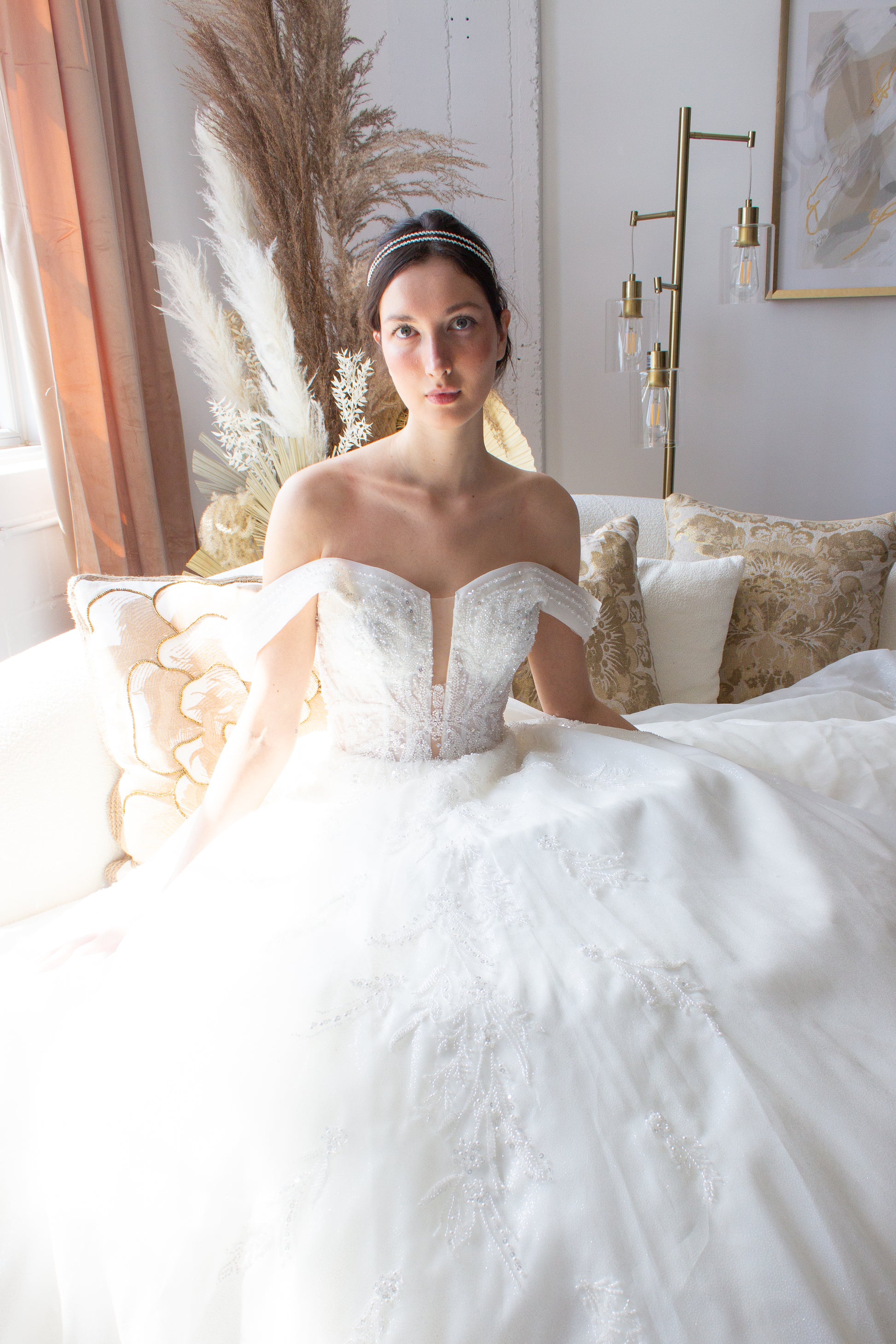 For those with immediate needs, we offer limited sample sizes ready to ship online and in-store. To have this exquisite gown customized to your size, we welcome you to visit our store or provide us with your measurements.