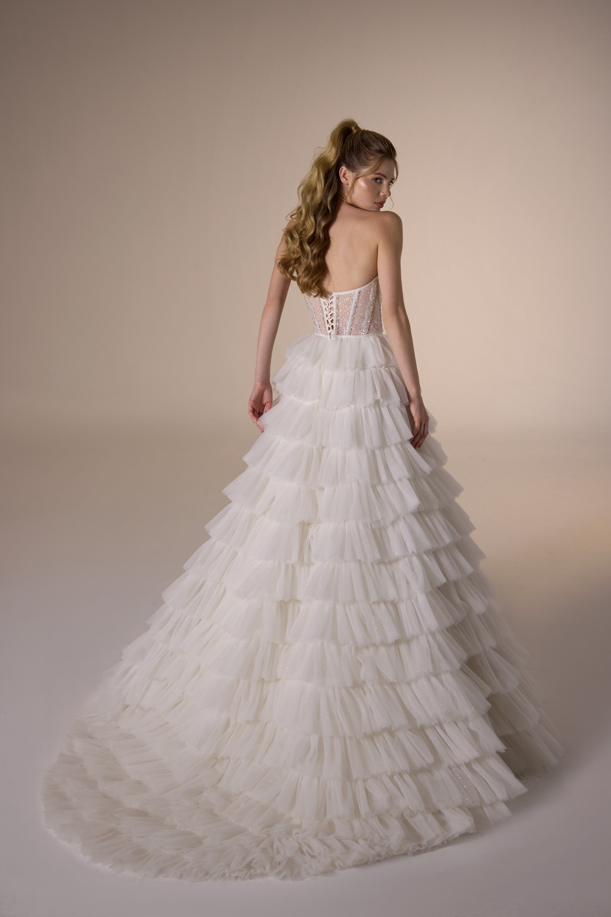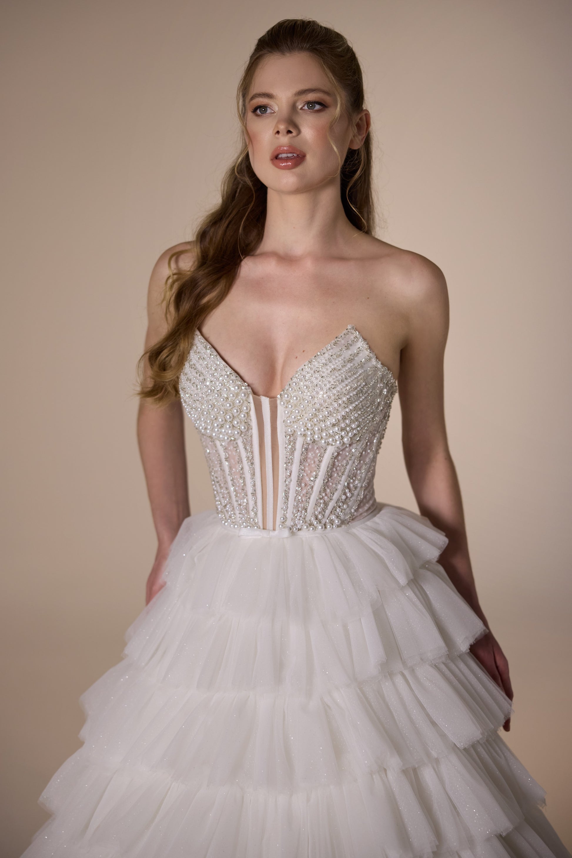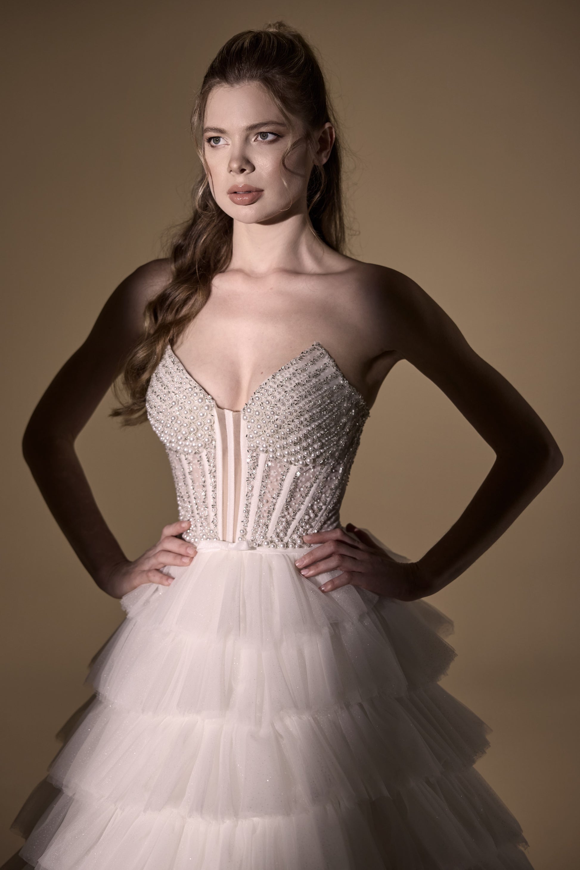 Immerse yourself in timeless elegance with this exquisite white wedding gown. Crafted with a strapless bodice adorned with intricate beading, it exudes sophistication and grace. The voluminous tiered skirt adds a touch of romance, creating a fairy-tale silhouette that will leave you feeling like royalty on your special day. Say 'I do' in style and make unforgettable memories as you walk down the aisle in this stunning dress.