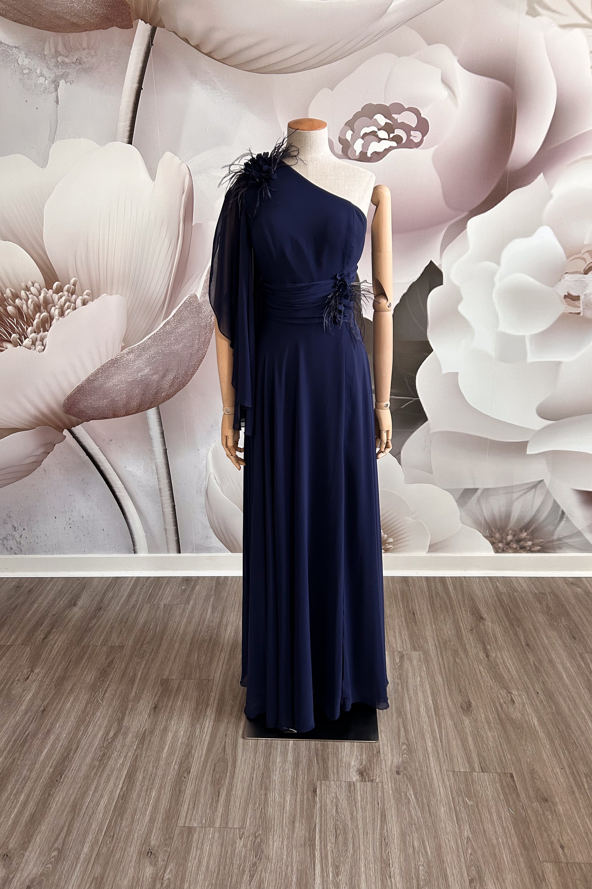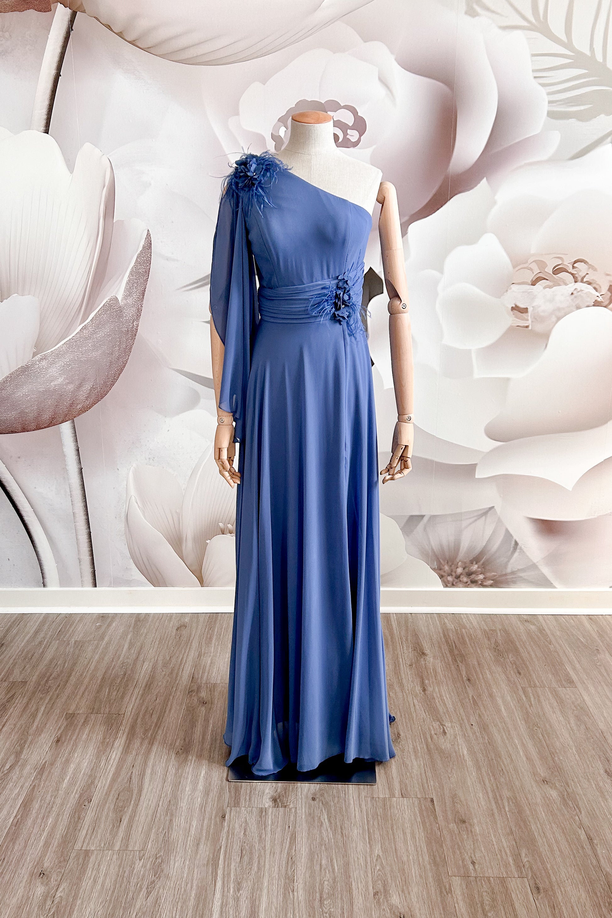This flowy dress features a chic one-shoulder design that exudes elegance and sophistication, while the slit adds a hint of allure to your look.
