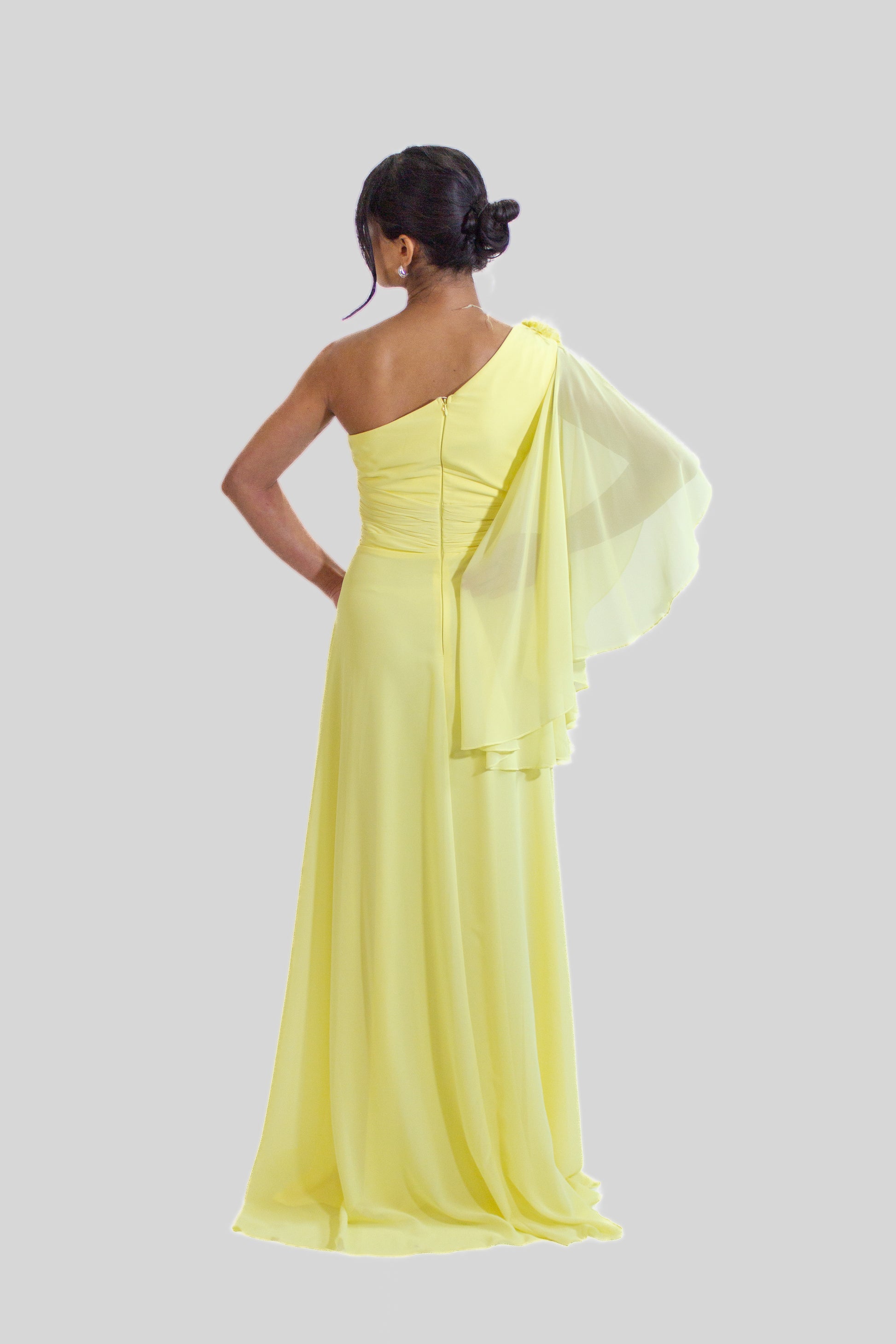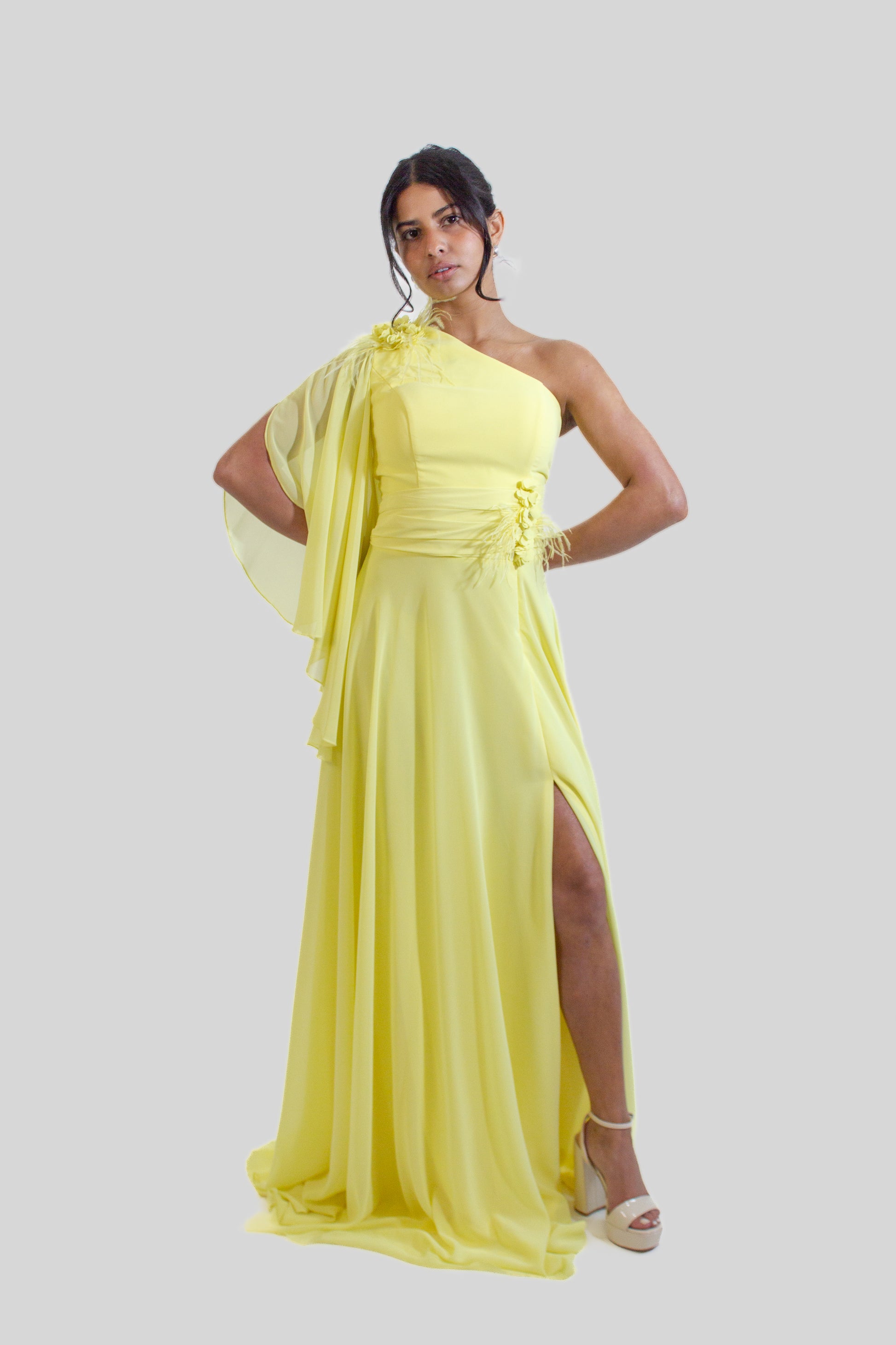 Add a touch of sunshine to your wardrobe with our vibrant one-shoulder HELENA dress, perfect for a variety of special occasions.