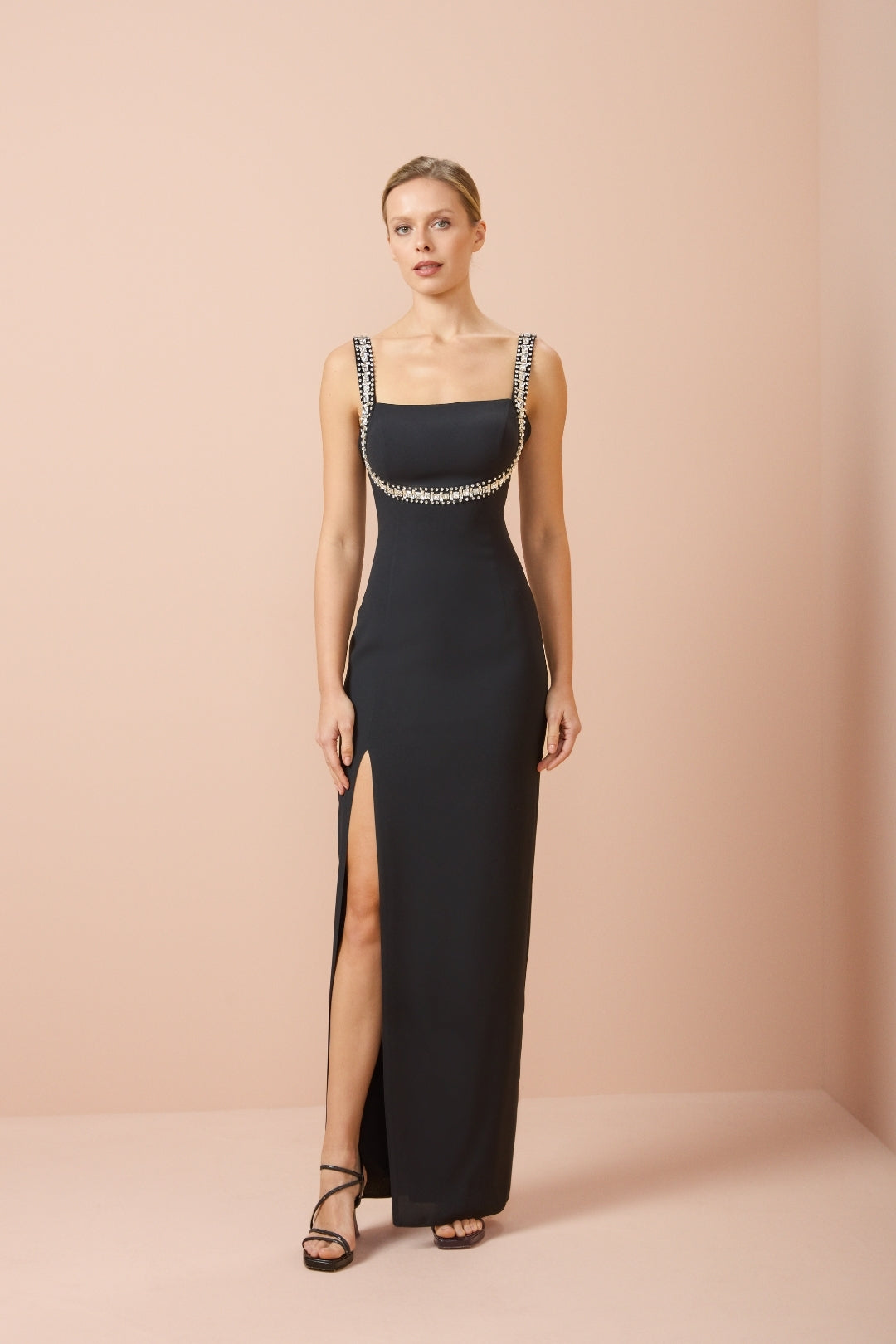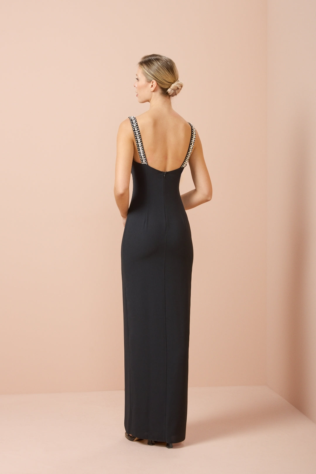 Sleek, refined, and effortlessly glamorous, JORDAN is a timeless black evening gown designed to flatter with clean, sculpted lines and subtle sparkle. The straight neckline is framed by crystal-embellished straps that highlight the shoulders and décolletage, adding just the right amount of shine without overpowering the look.
