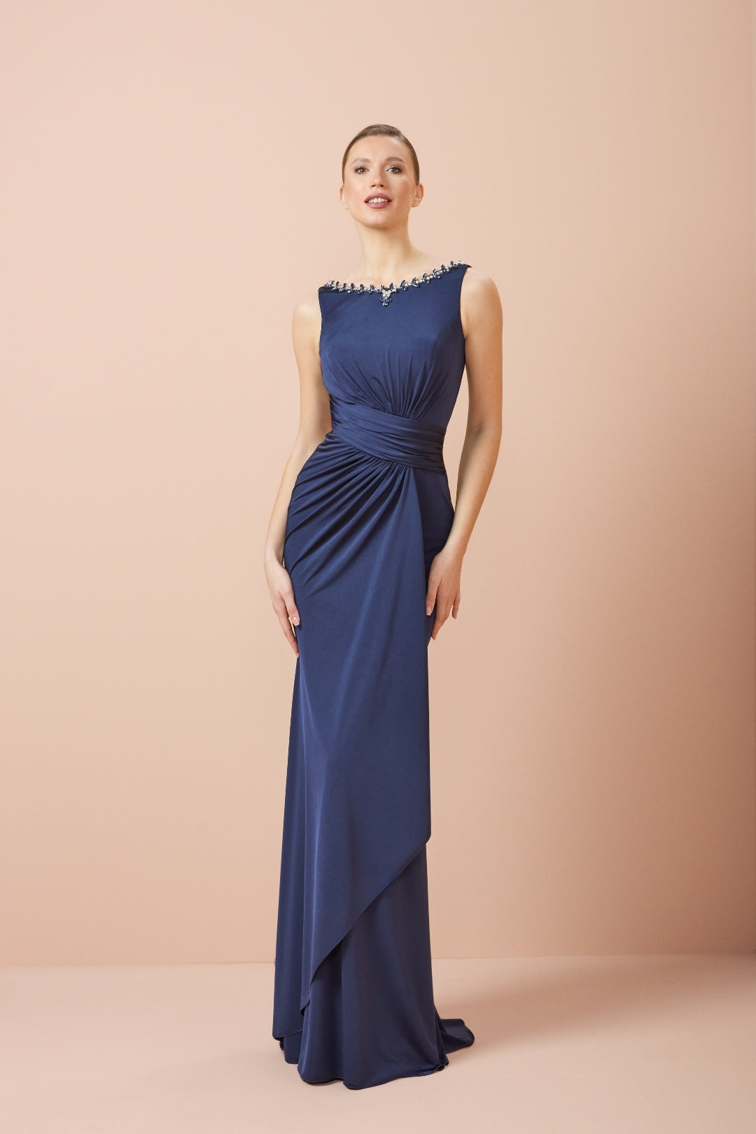 Graceful and refined, JOSEPHINE is a timeless navy evening gown designed to celebrate elegant movement and feminine structure. Crafted with softly draped fabric, this gown flows beautifully over the body while the gently wrapped waistline creates a flattering, sculpted silhouette that enhances natural curves.