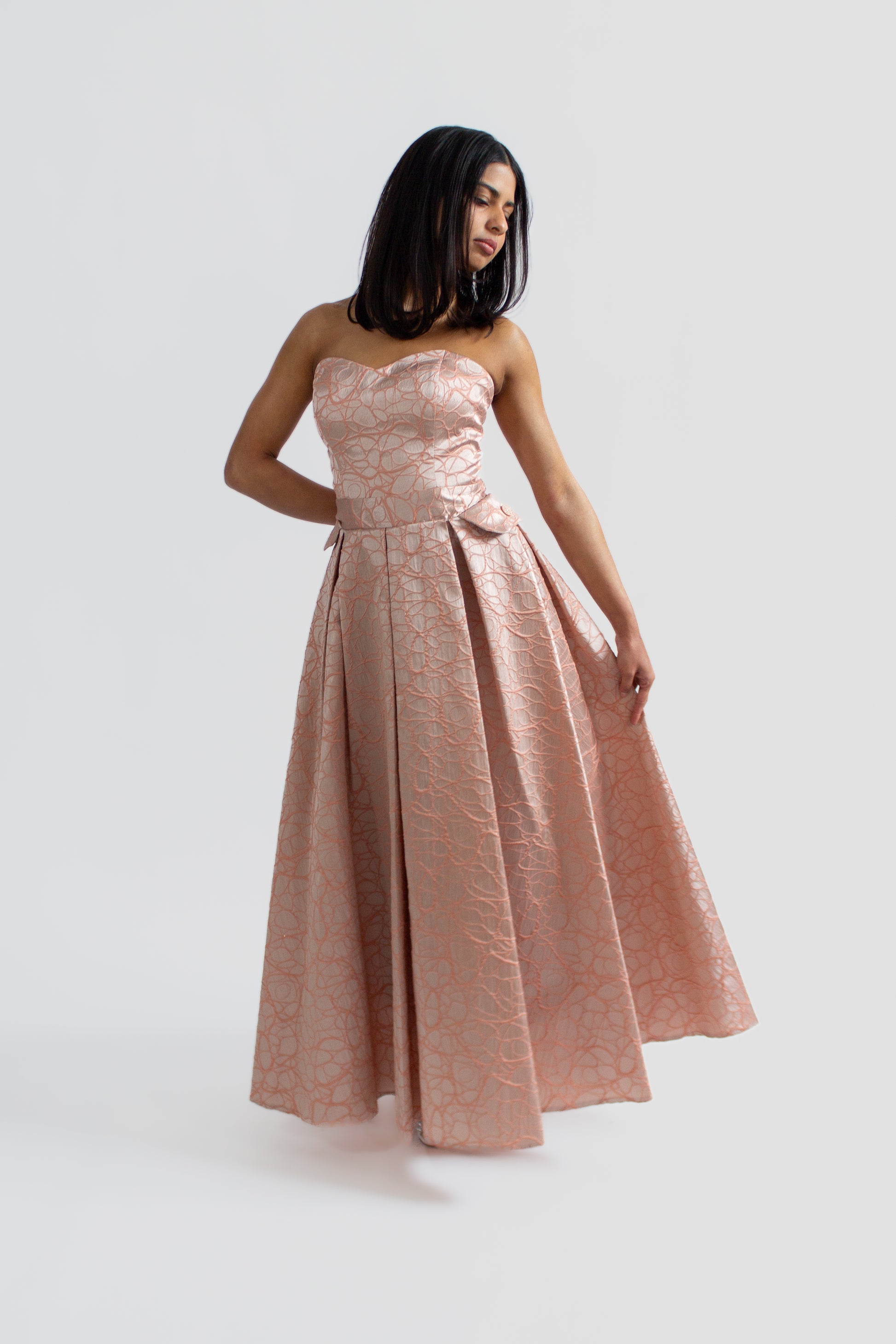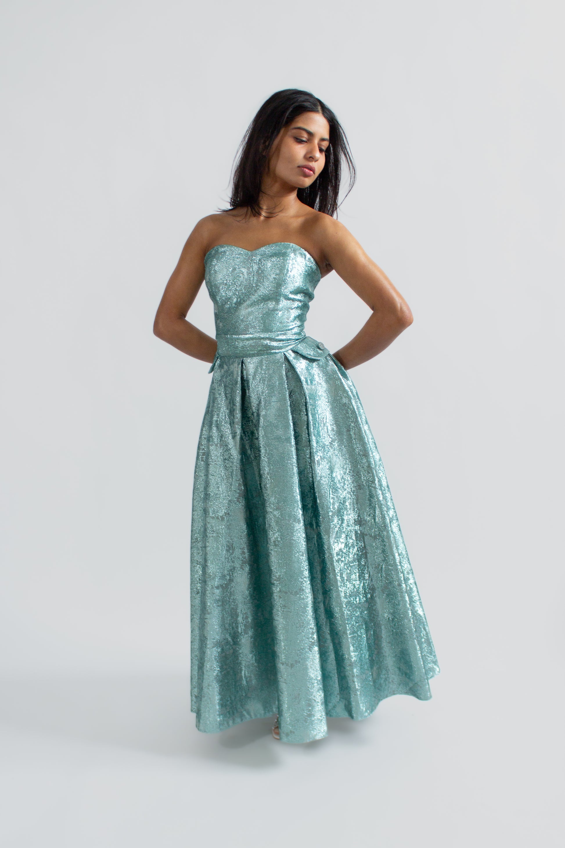 This full-length dress features a shimmering metallic fabric with a textured pattern that adds depth and dimension to your ensemble.