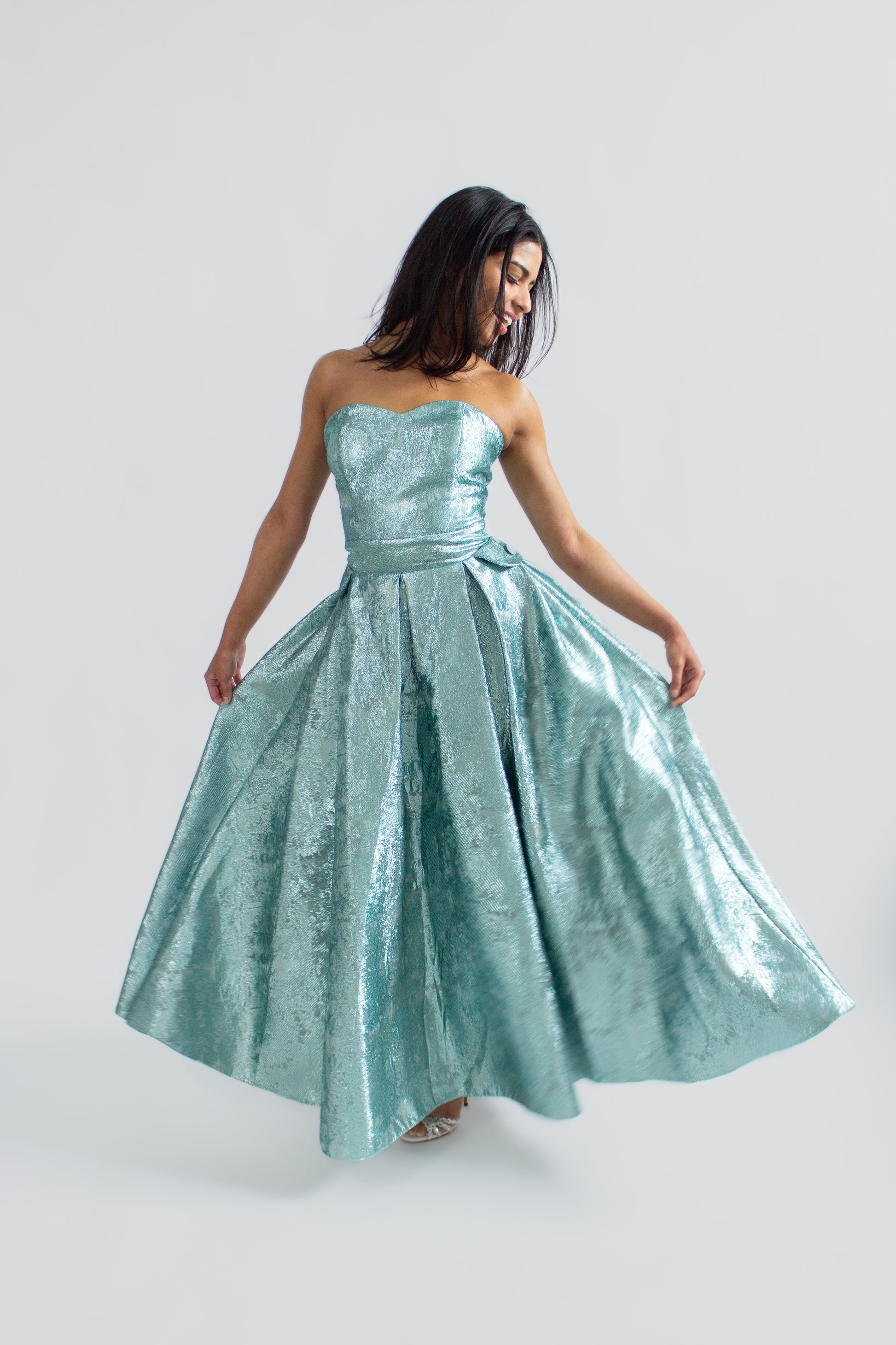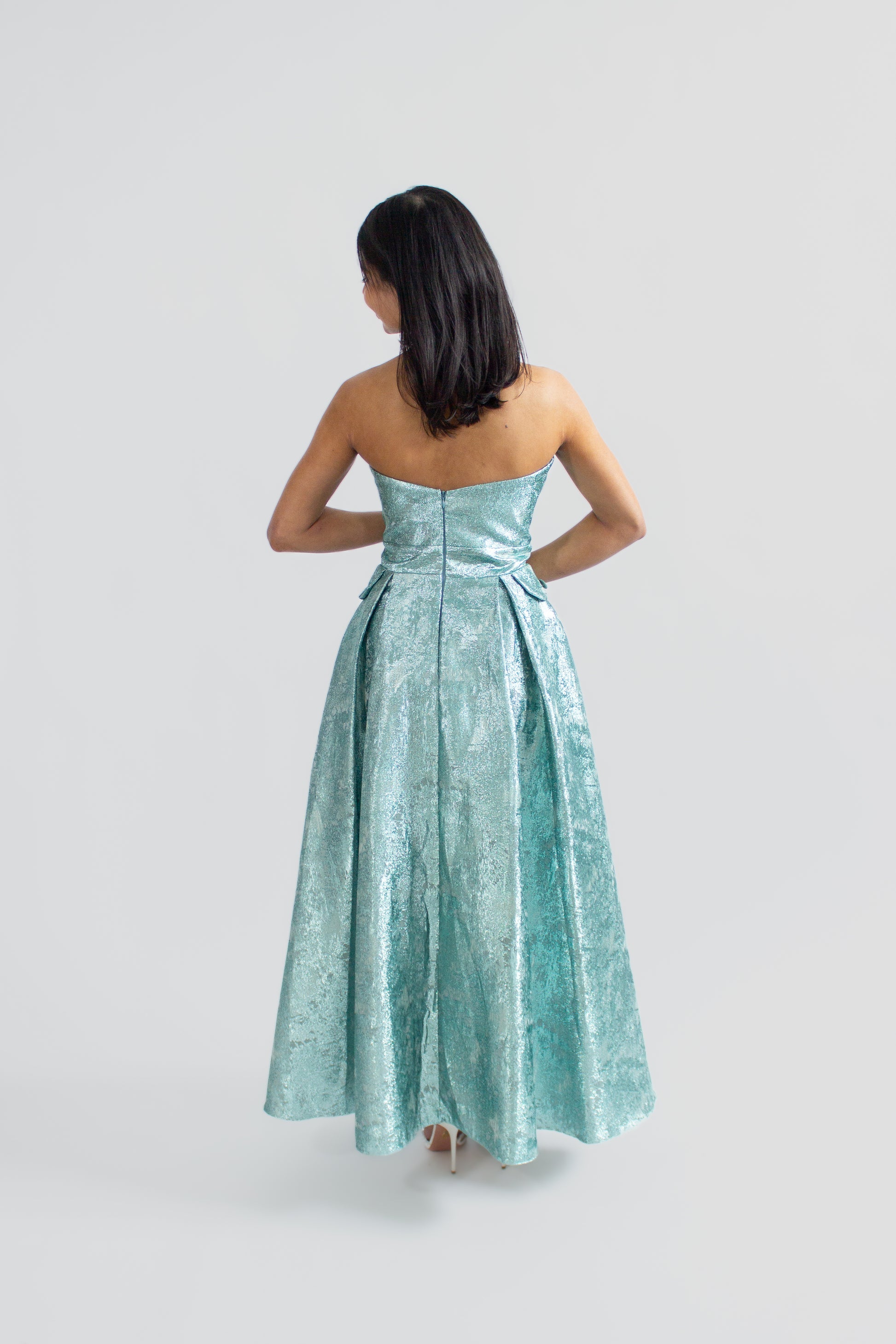 Shine like a star in our stunning metallic A-line strapless gown, available in metallic teal and pink hues for a show-stopping look.