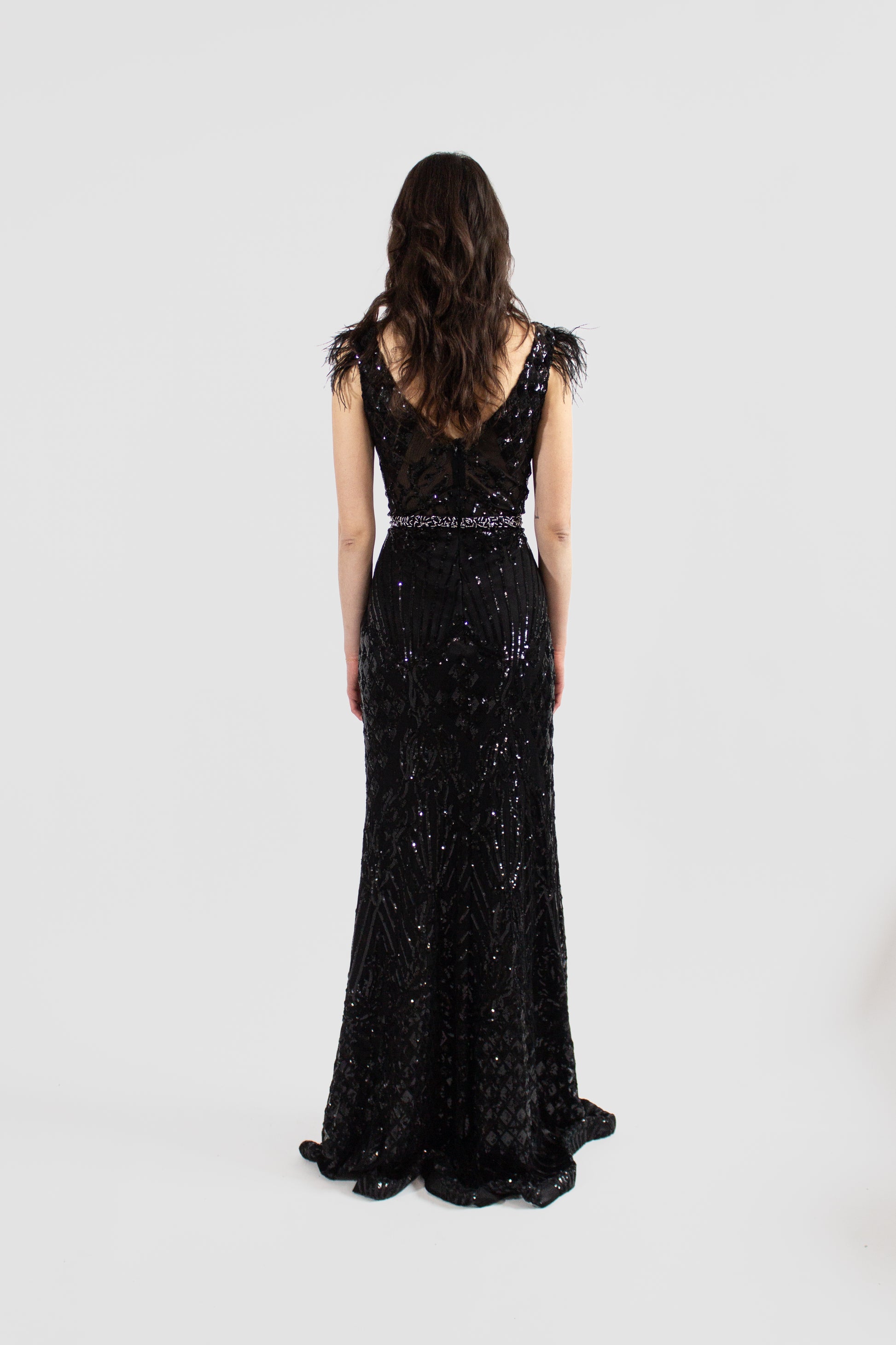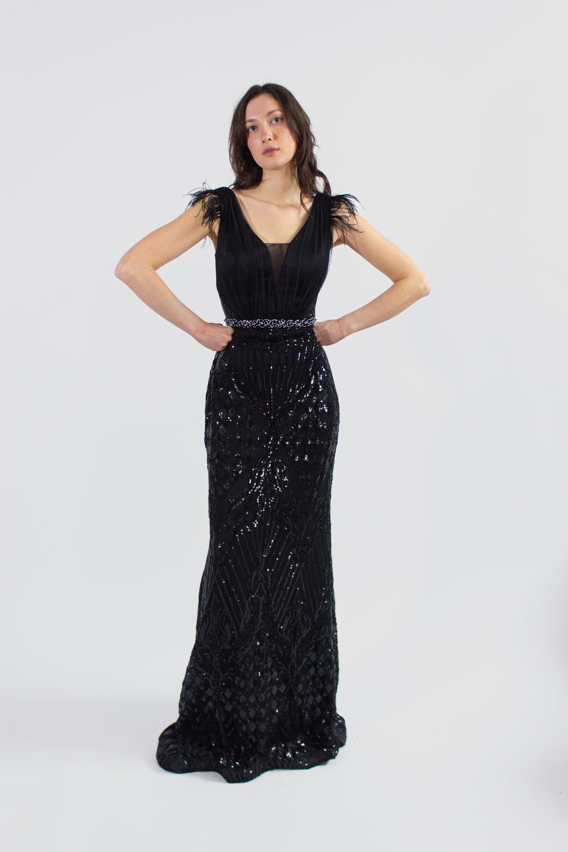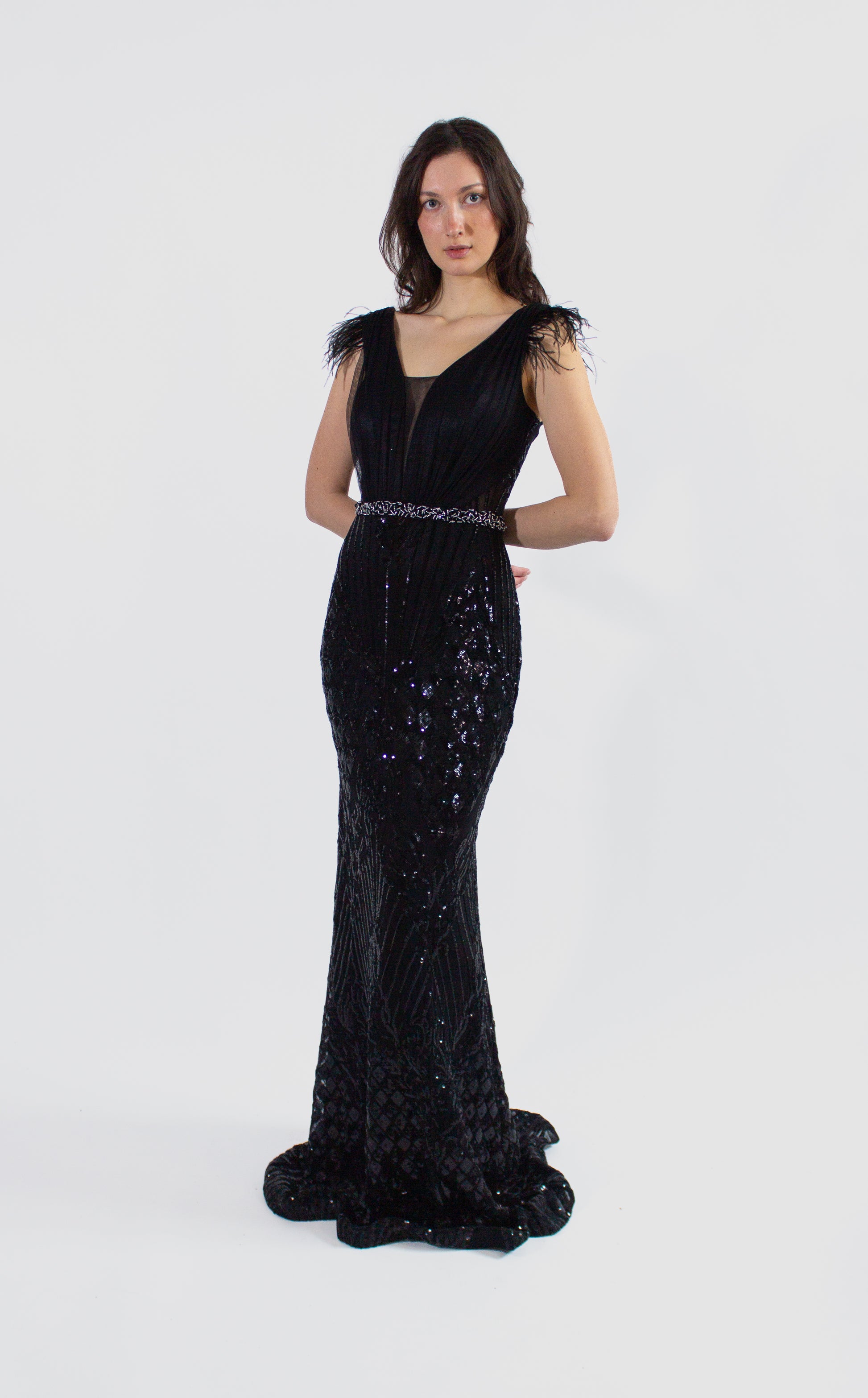 Step into the spotlight with our exquisite black evening gown. An epitome of elegance and sophistication, this dress boasts intricate sequin detailing and feathered shoulders that exude luxury and charm.