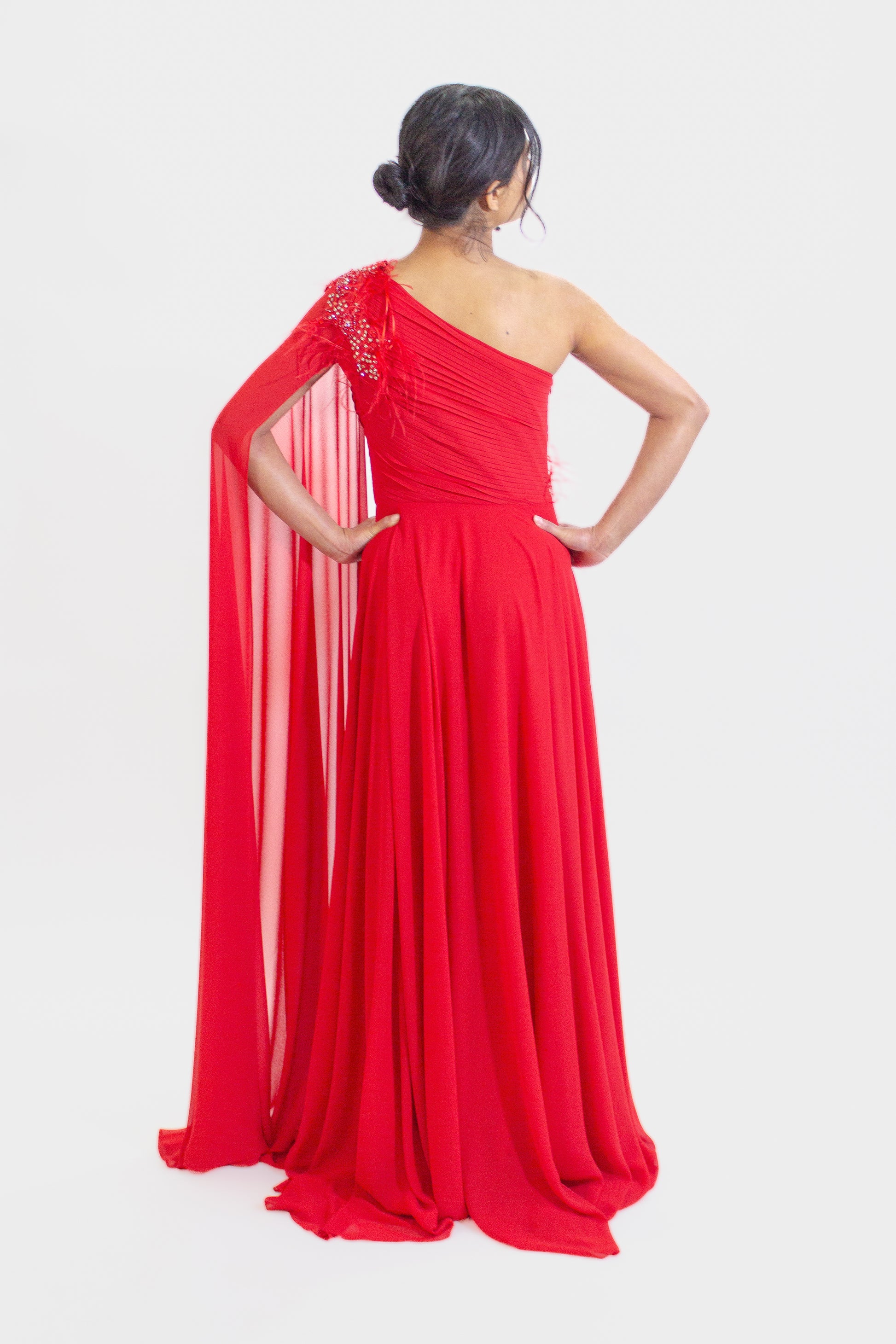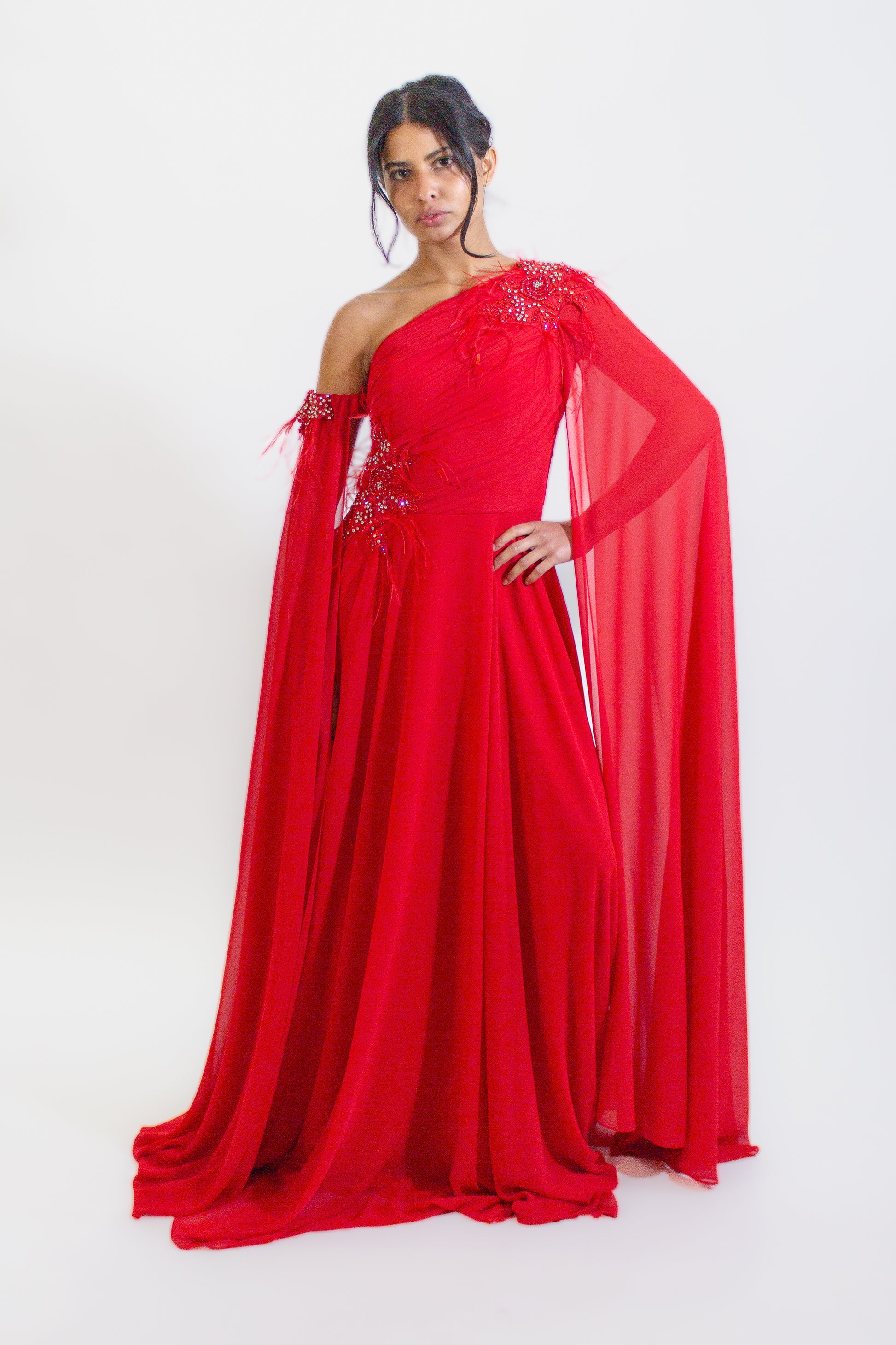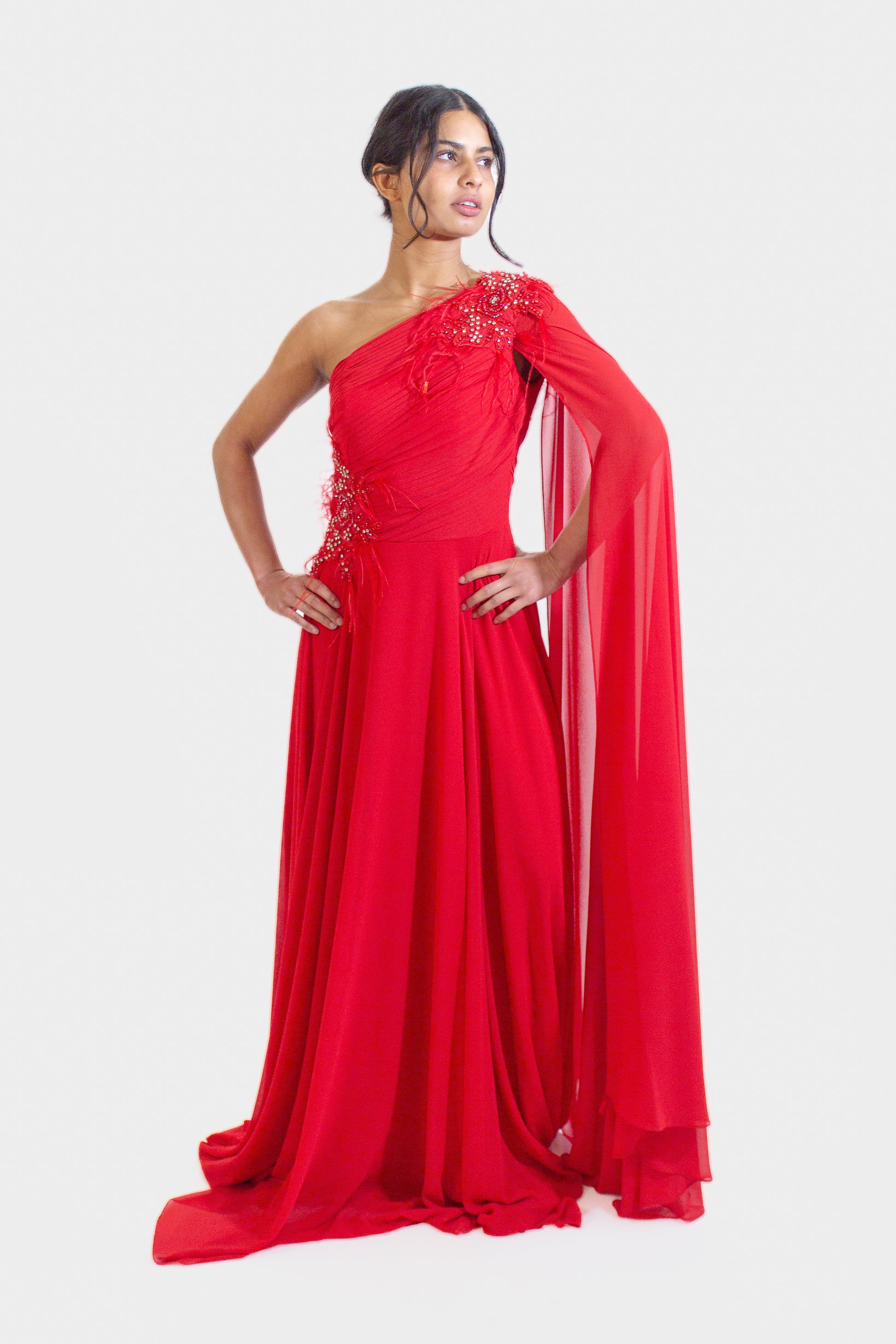 Adorned with decorative elements that catch the light and add a subtle sparkle, this gown is guaranteed to turn heads wherever you go. The long cape sleeve brings a touch of drama, making you feel like a true fashion icon.