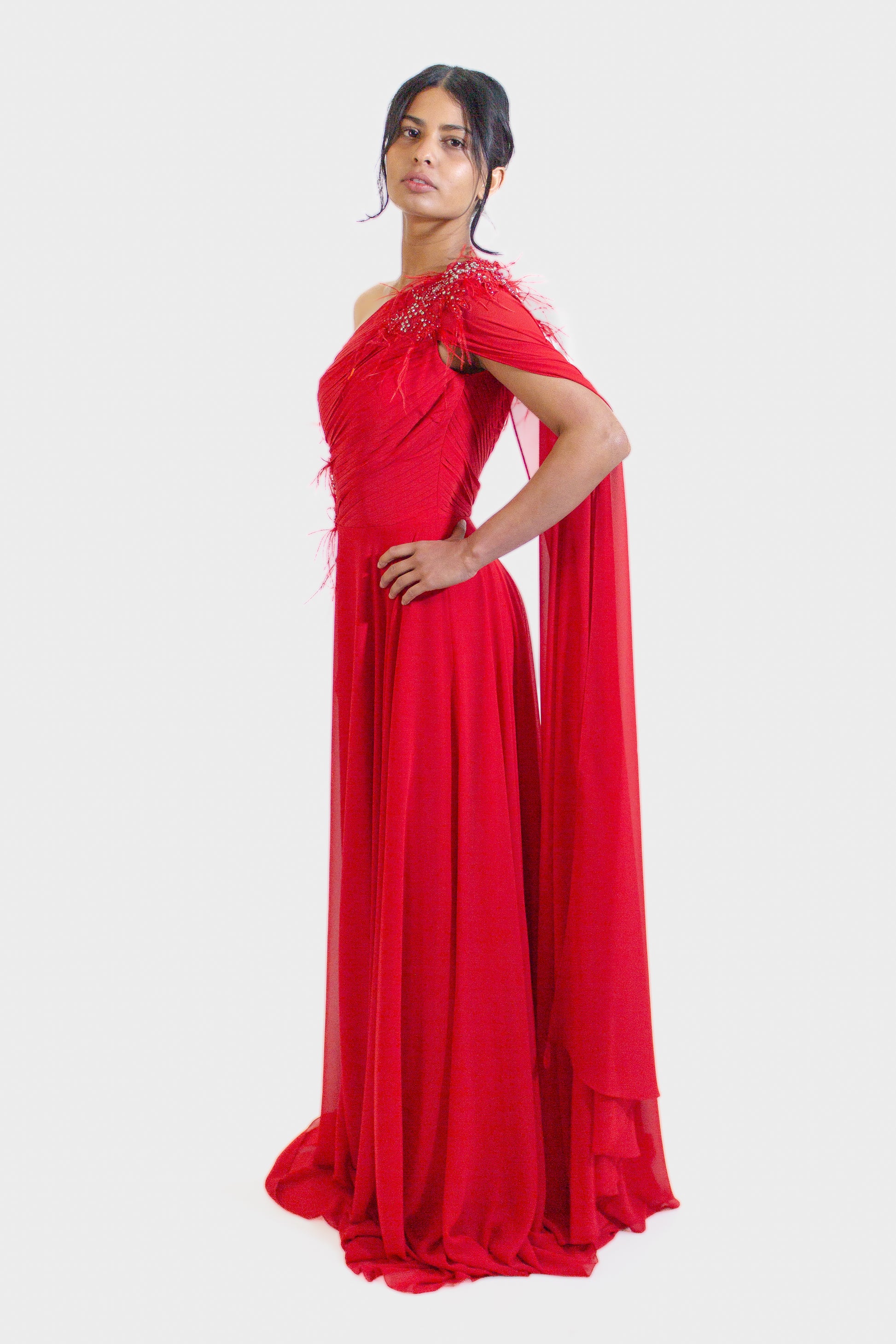 Elevate your evening look with our Elegant Crimson One-Shoulder Evening Gown and make a statement that will be remembered.