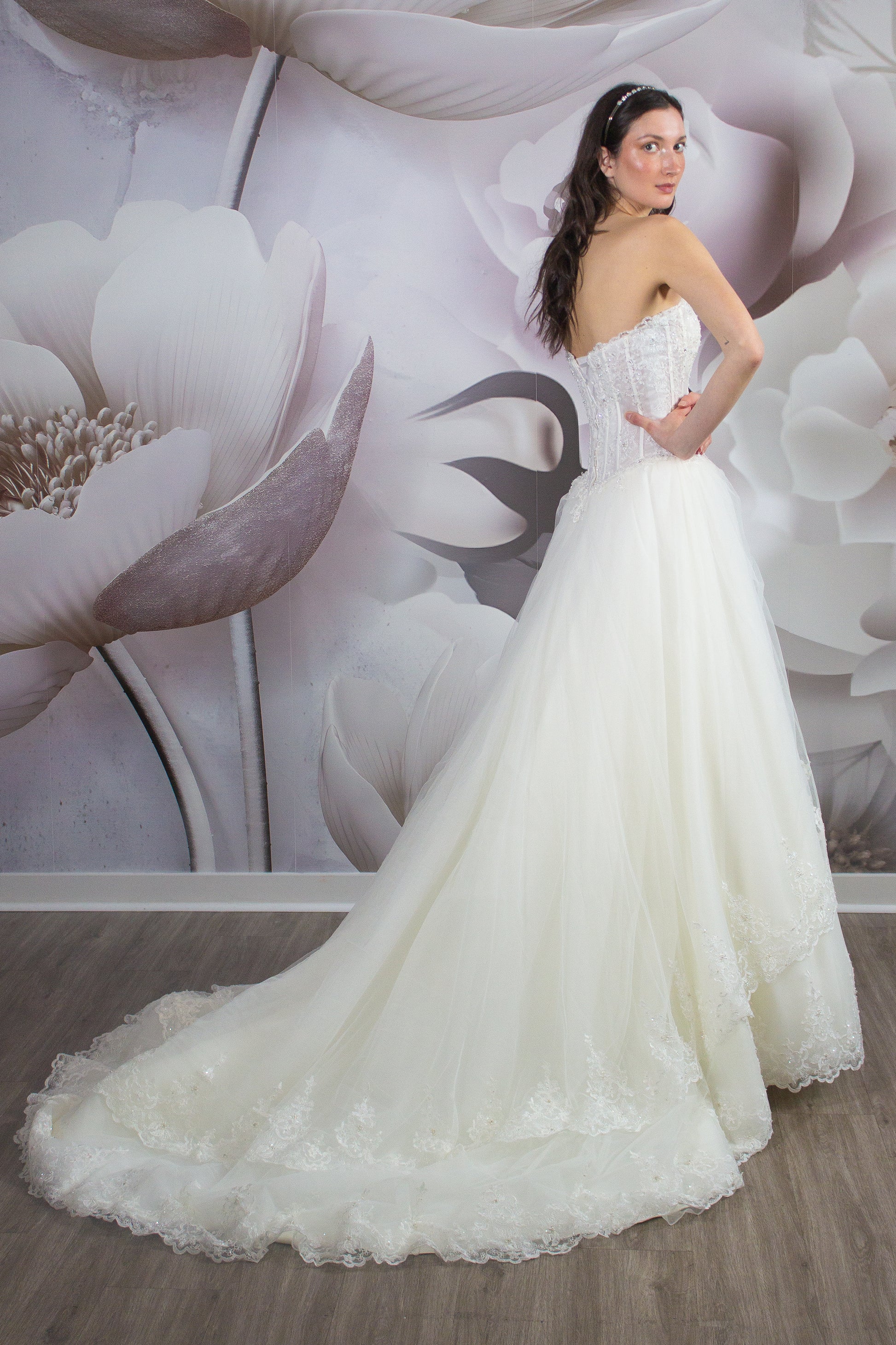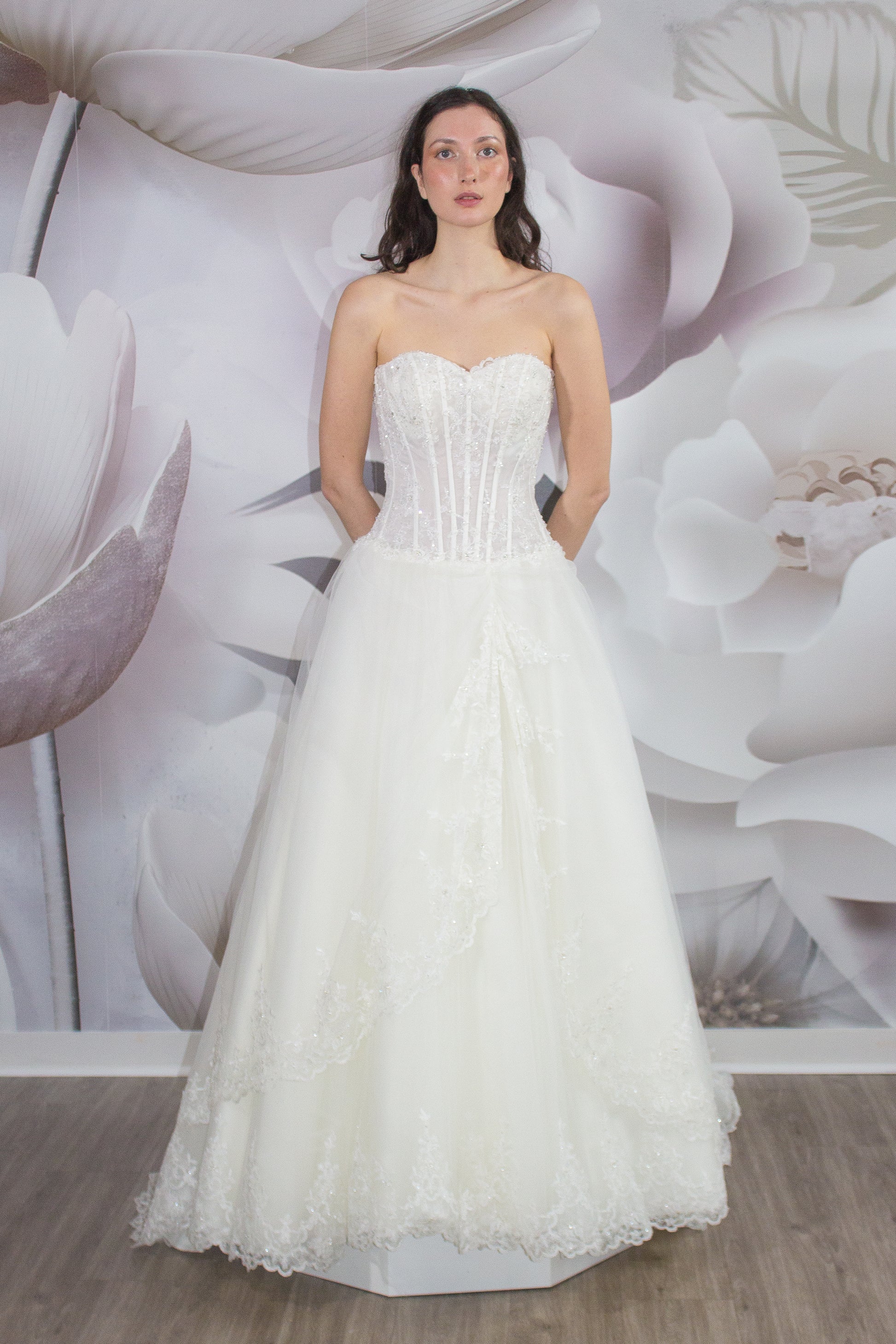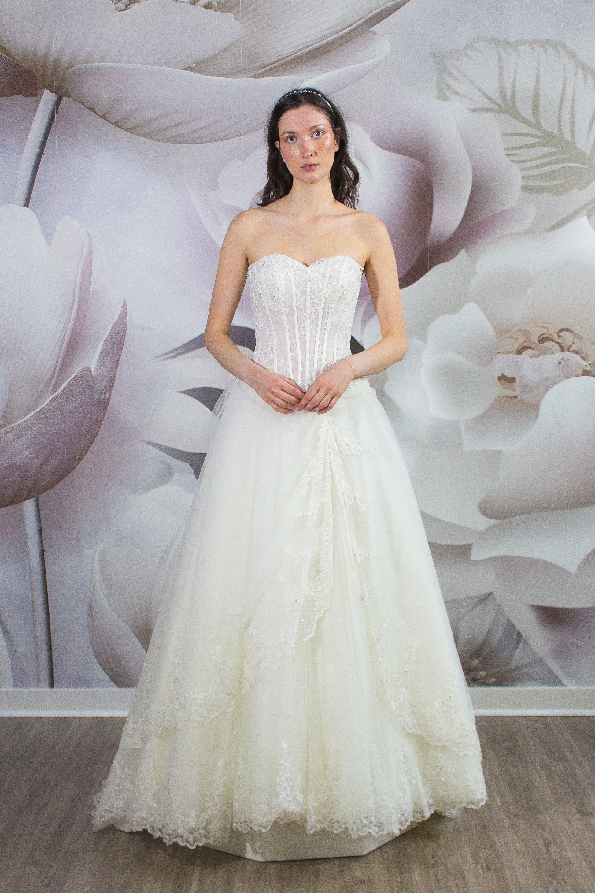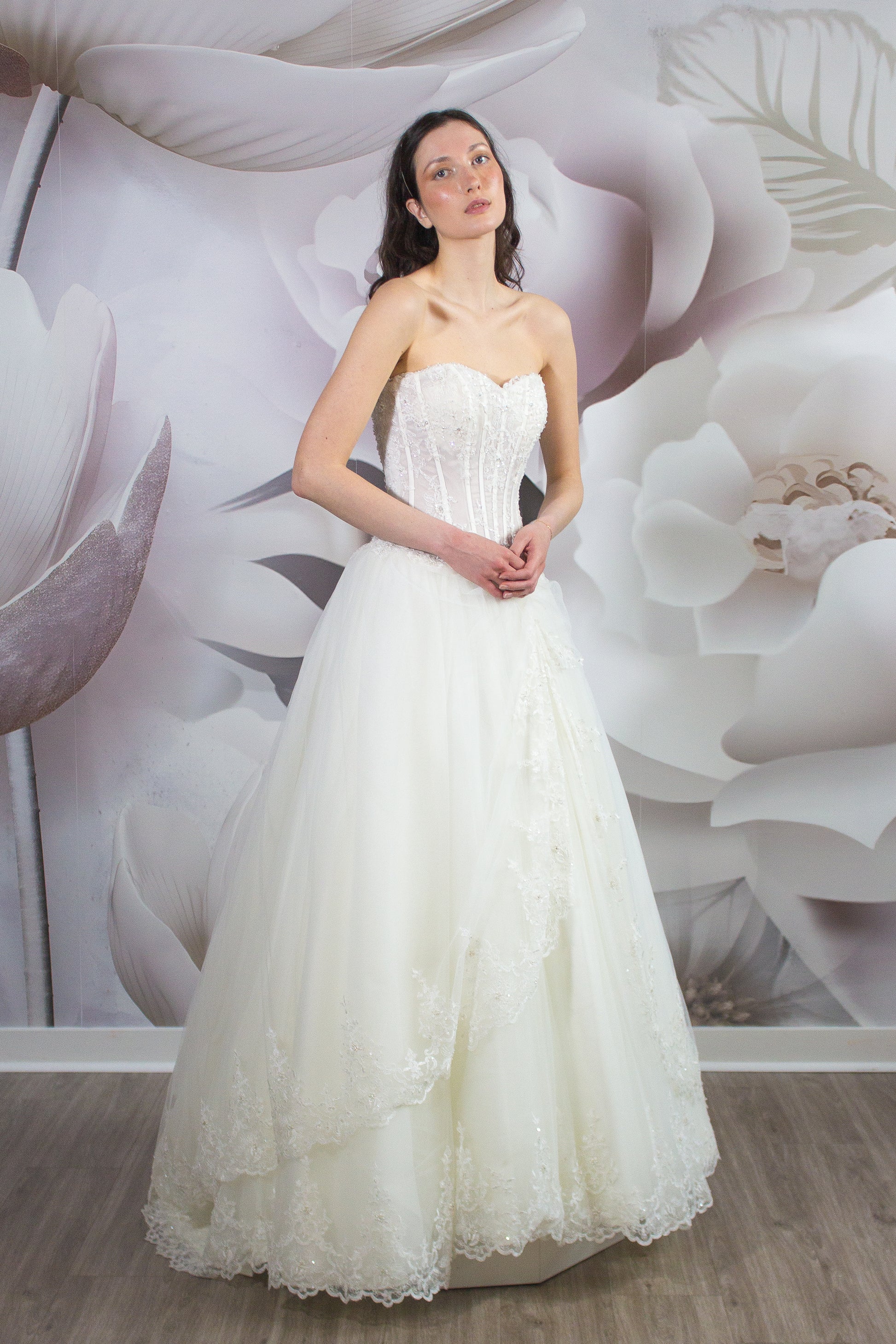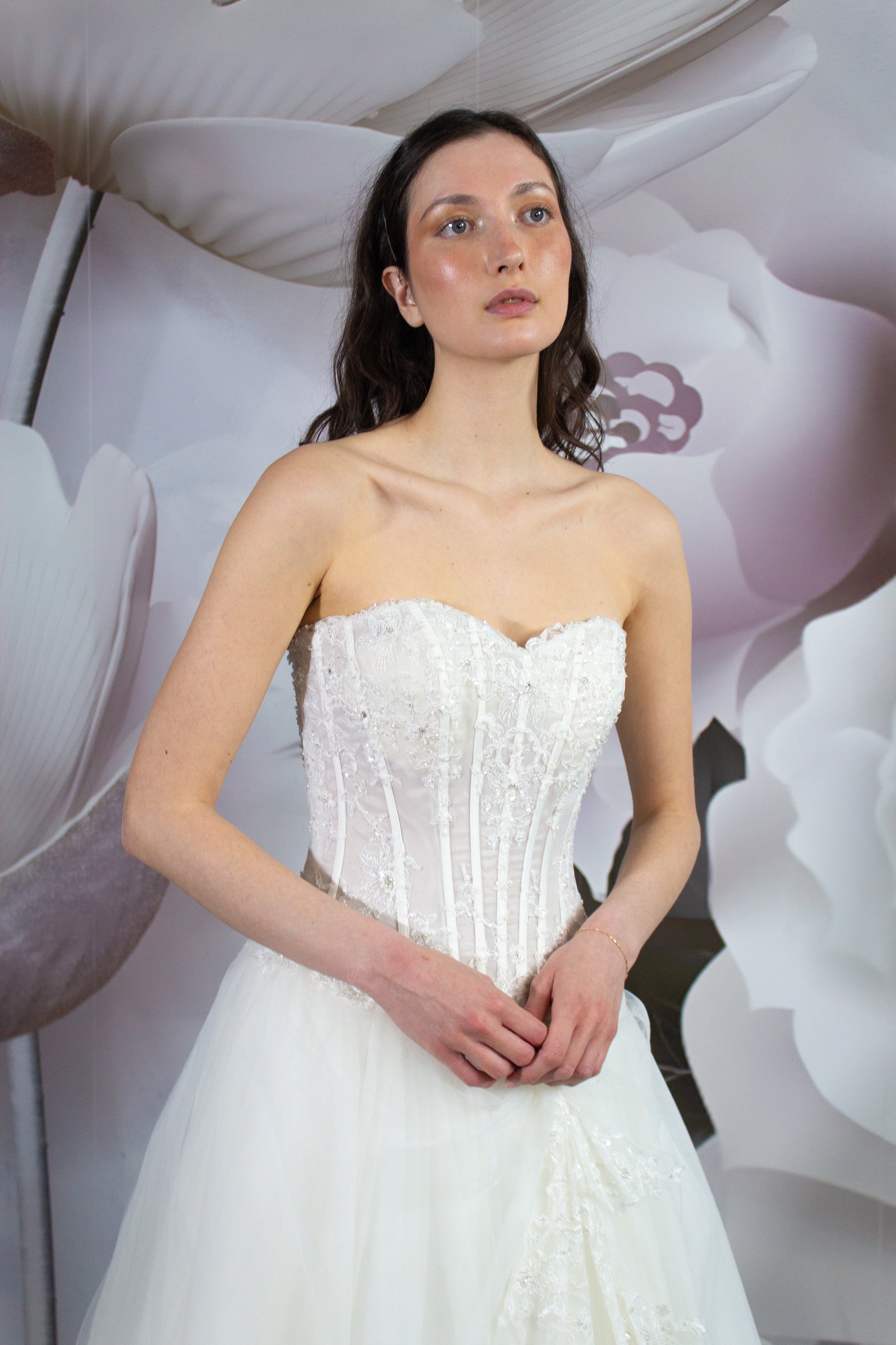 Indulge in the elegance of the Veronica Bridal gown from our prestigious Nicole Milano collection. This exquisite wedding dress, carefully crafted in Italy, is a masterpiece of luxury and style. The strapless style exudes sophistication, while the corset-style bodice adorned with lace and beaded embellishments adds a touch of glamour.