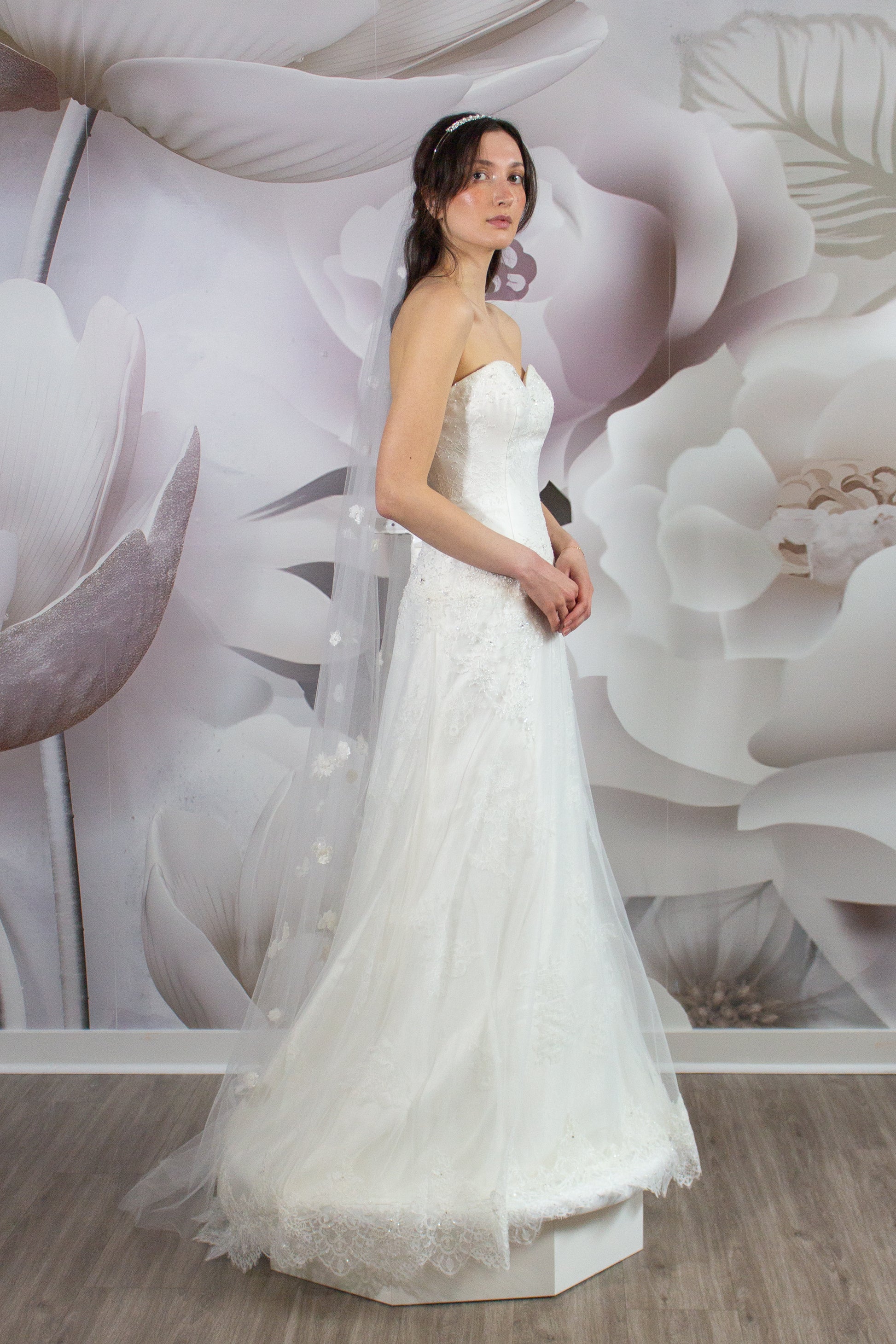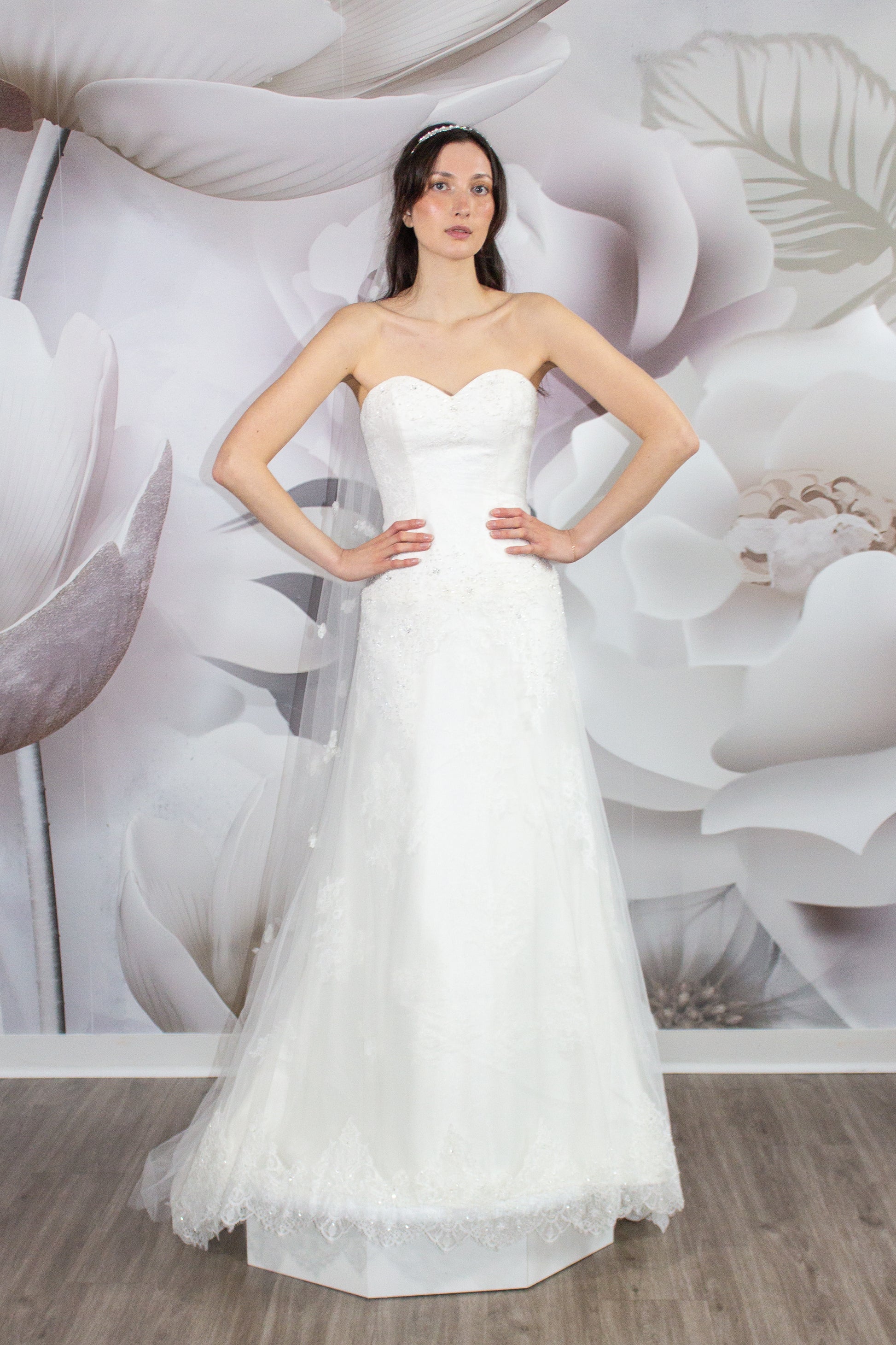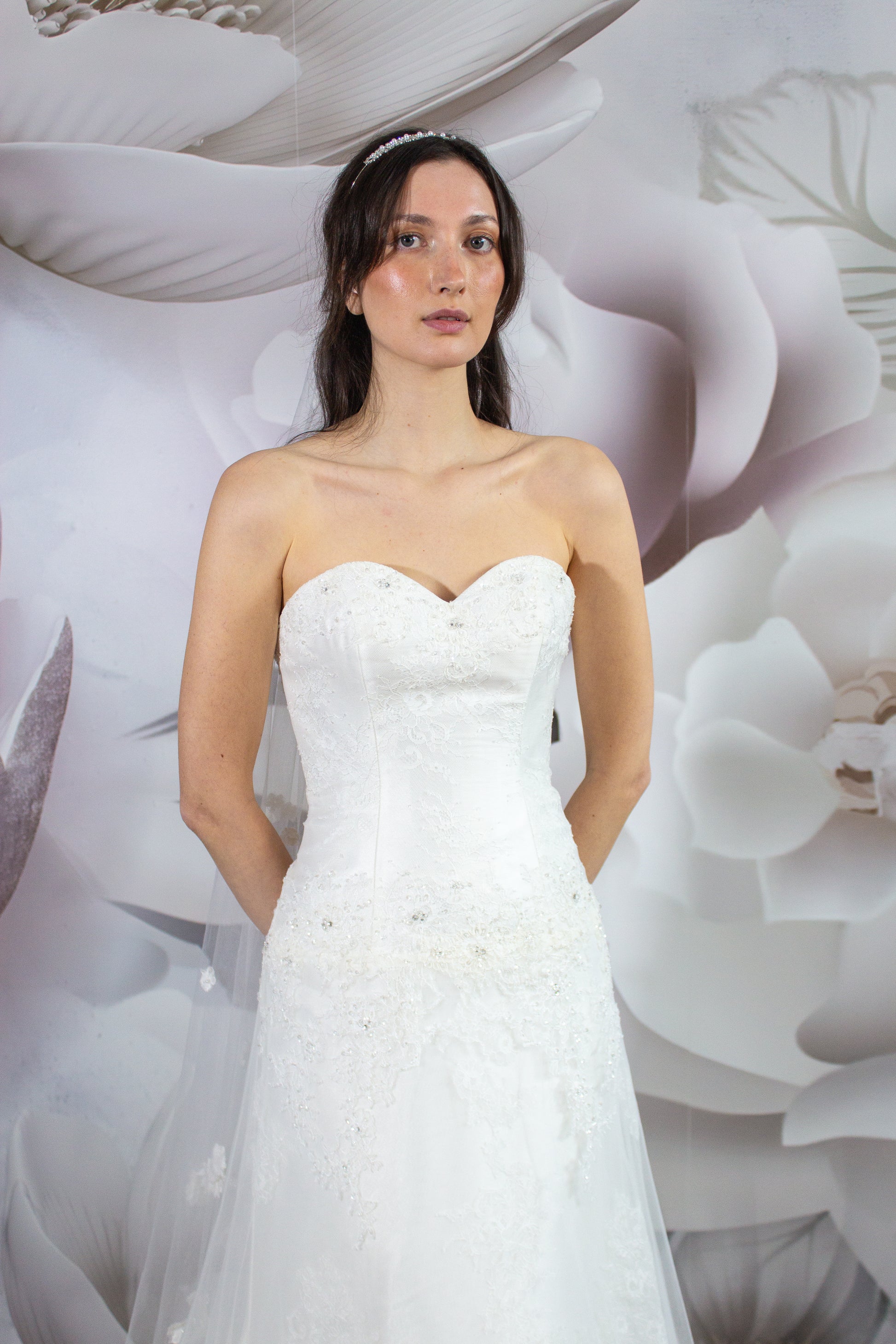 The gown features a timeless sweetheart neckline that enhances your natural beauty, adorned with delicate lace appliqués and shimmering hand sewn beadwork for a touch of glamour. Its A-line silhouette drapes elegantly, accentuating your figure with every step you take.