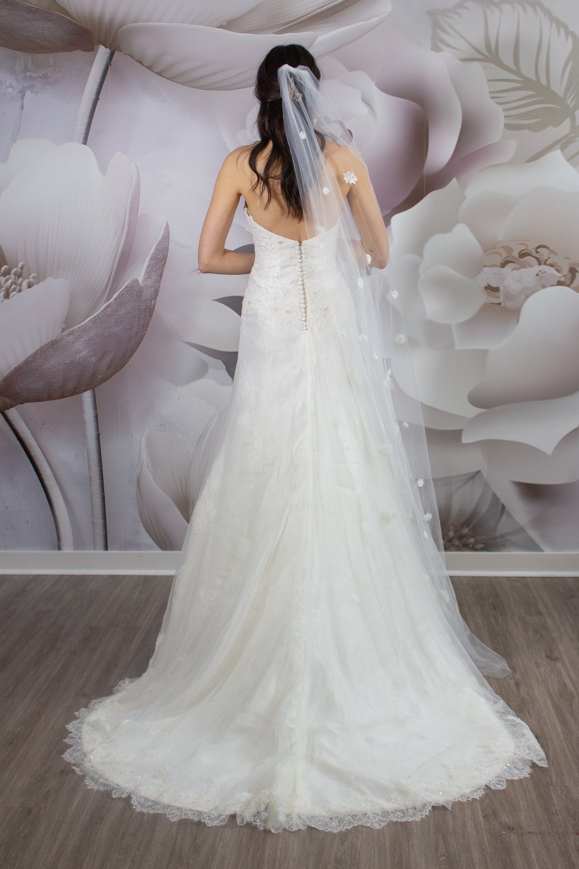 Designed to mesmerize, this strapless gown is the epitome of romance and femininity. The trailing train adds a touch of drama and grandeur, making you the center of attention as you walk down the aisle.
