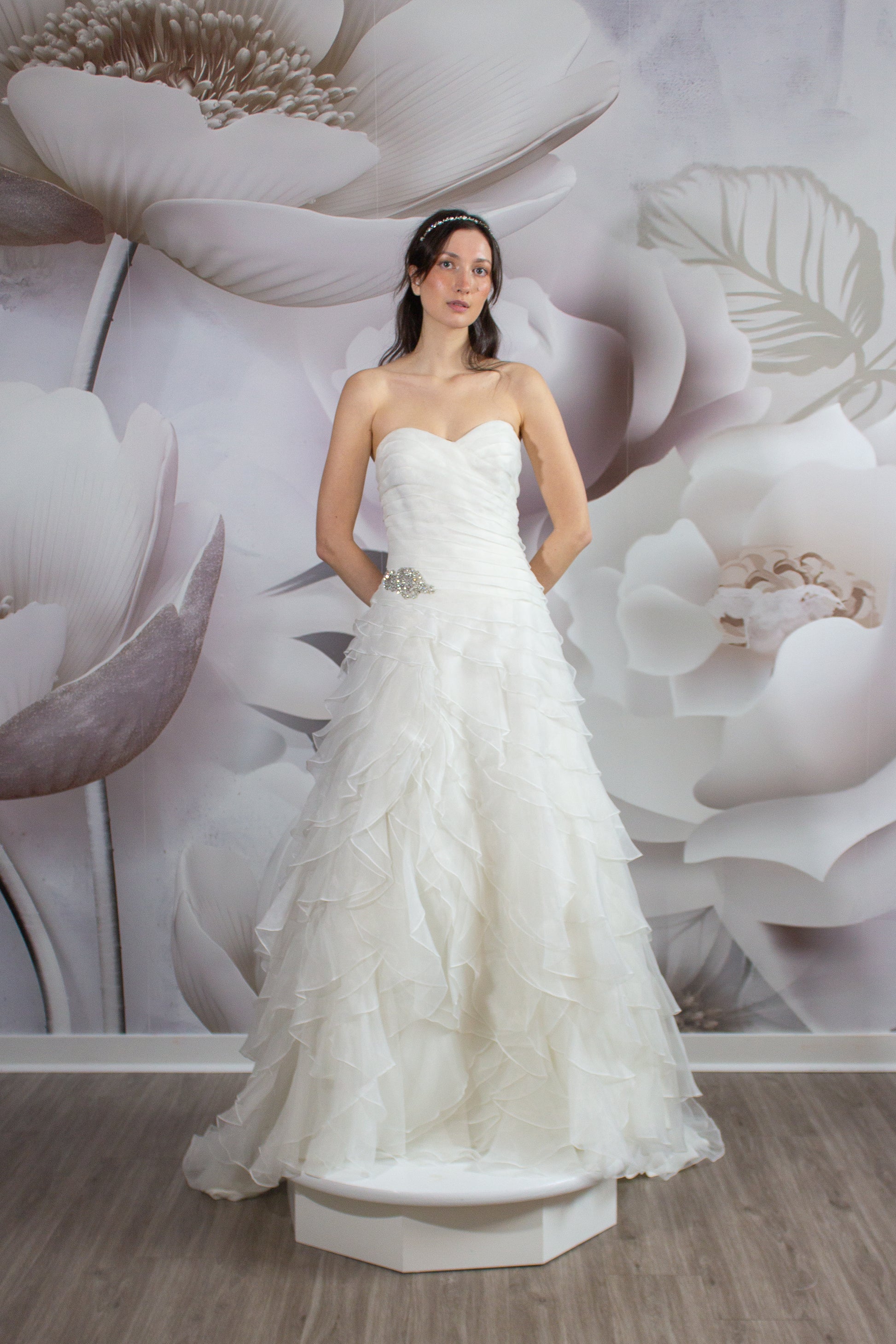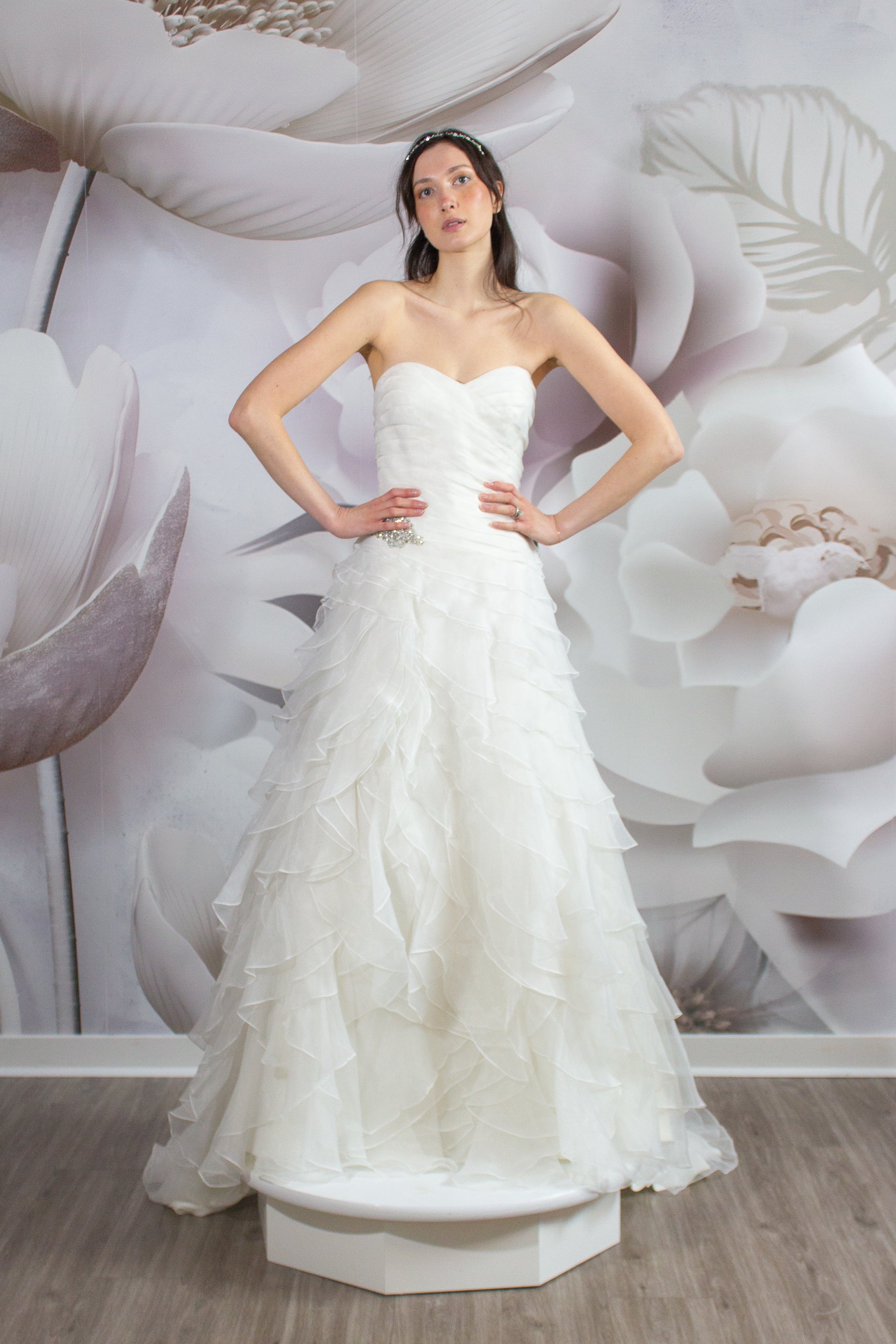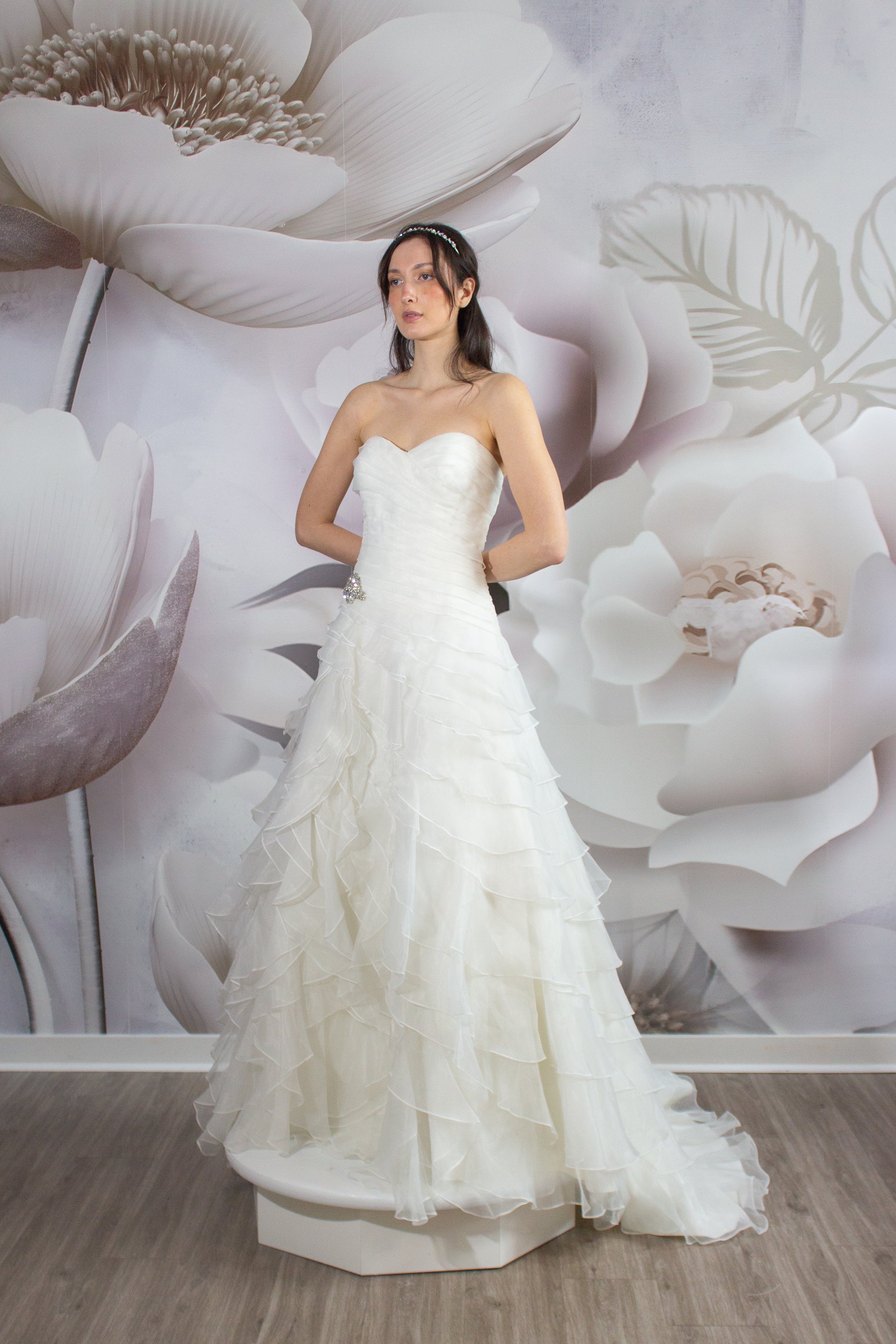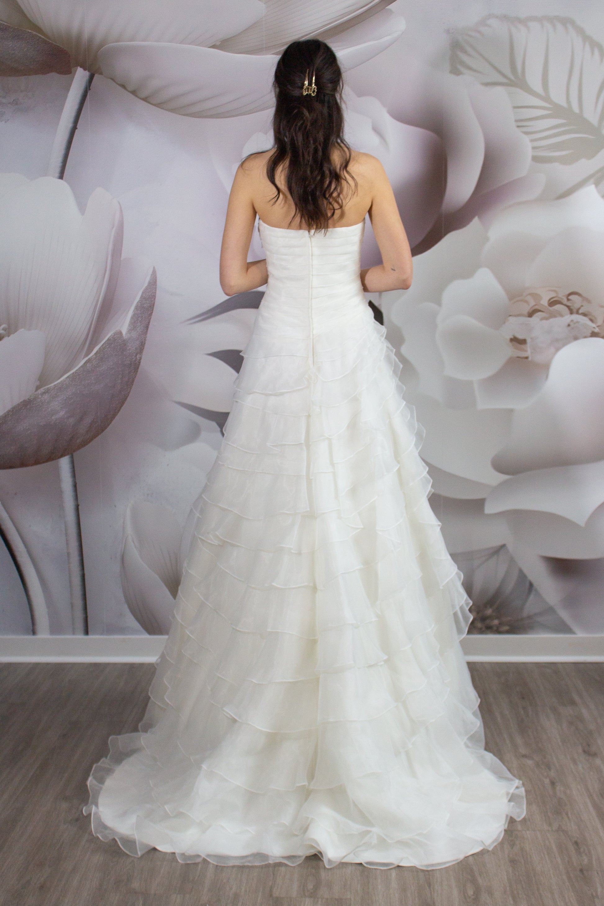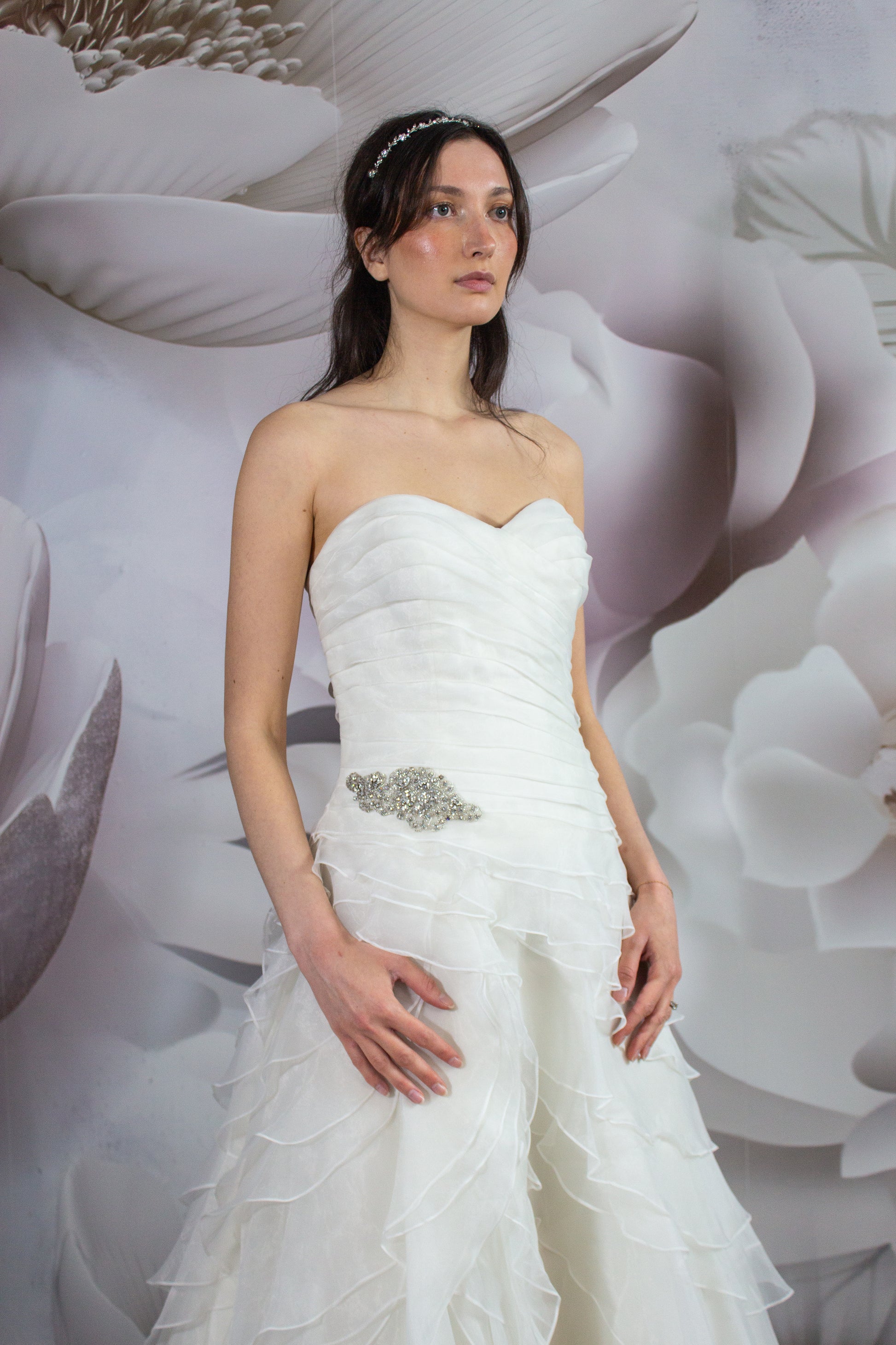 The strapless design showcases a bodice that enhances your silhouette, while the layered skirt adds volume and movement to every step you take down the aisle. The crystal embellishment at the side sparkles like stars in the night, adding a touch of glamour to your ensemble.